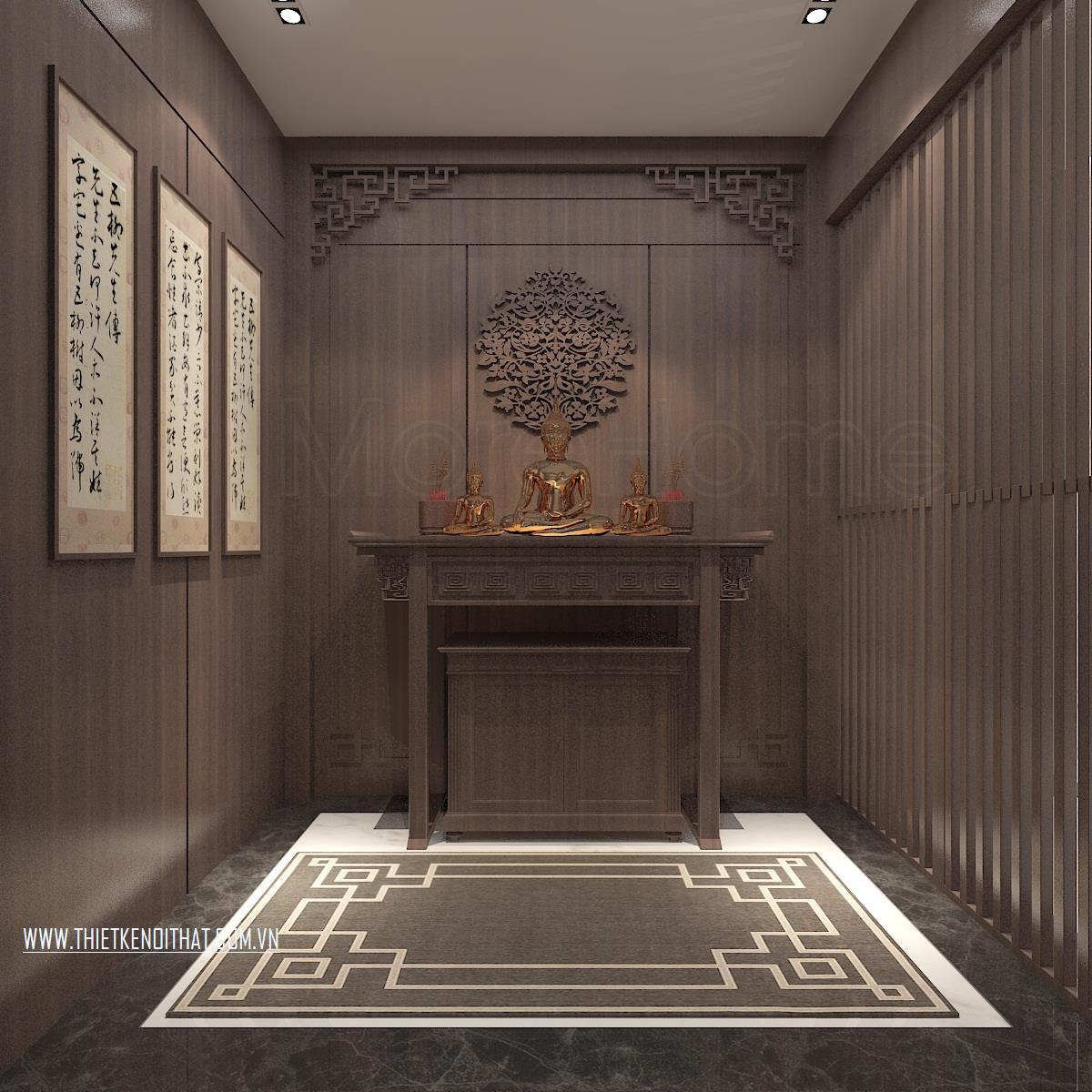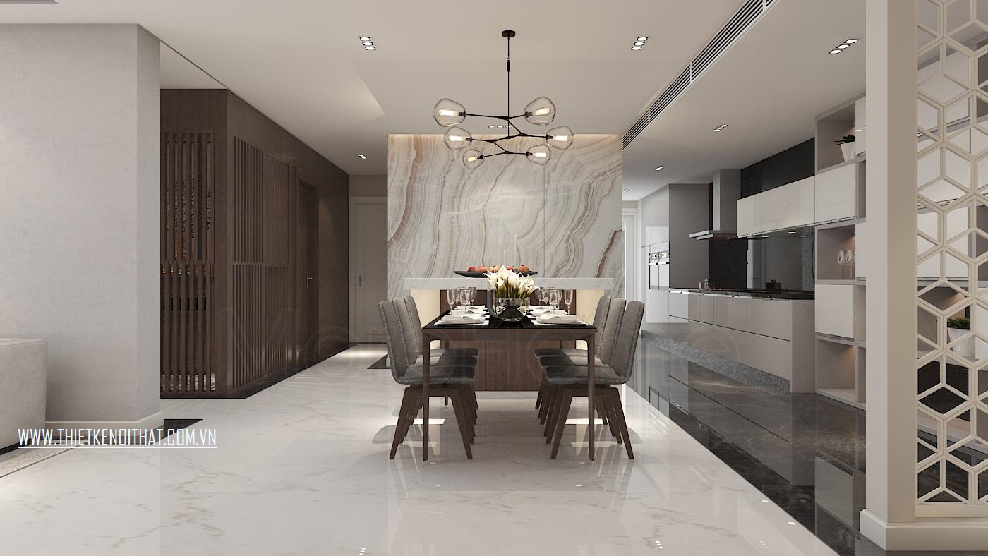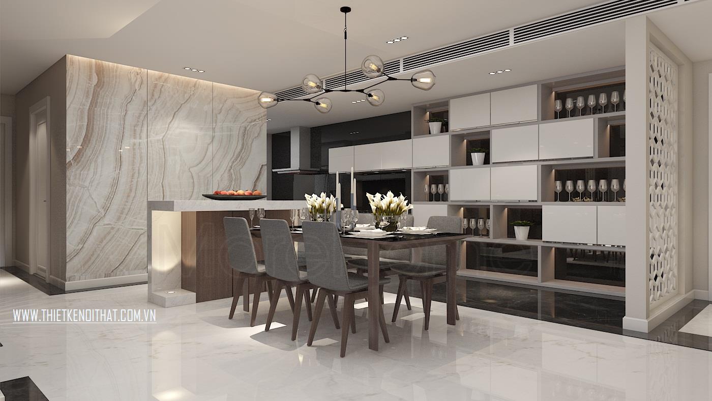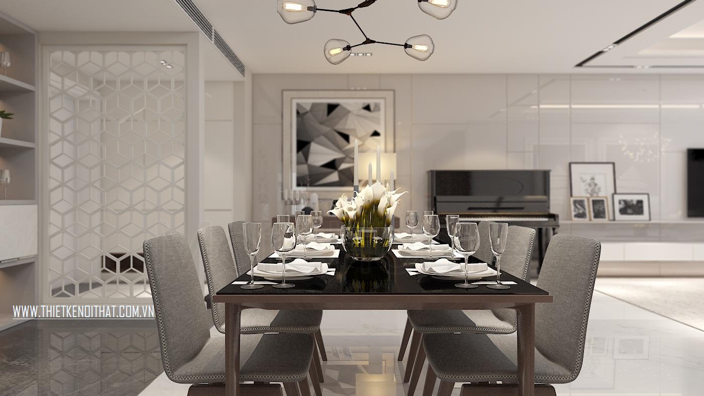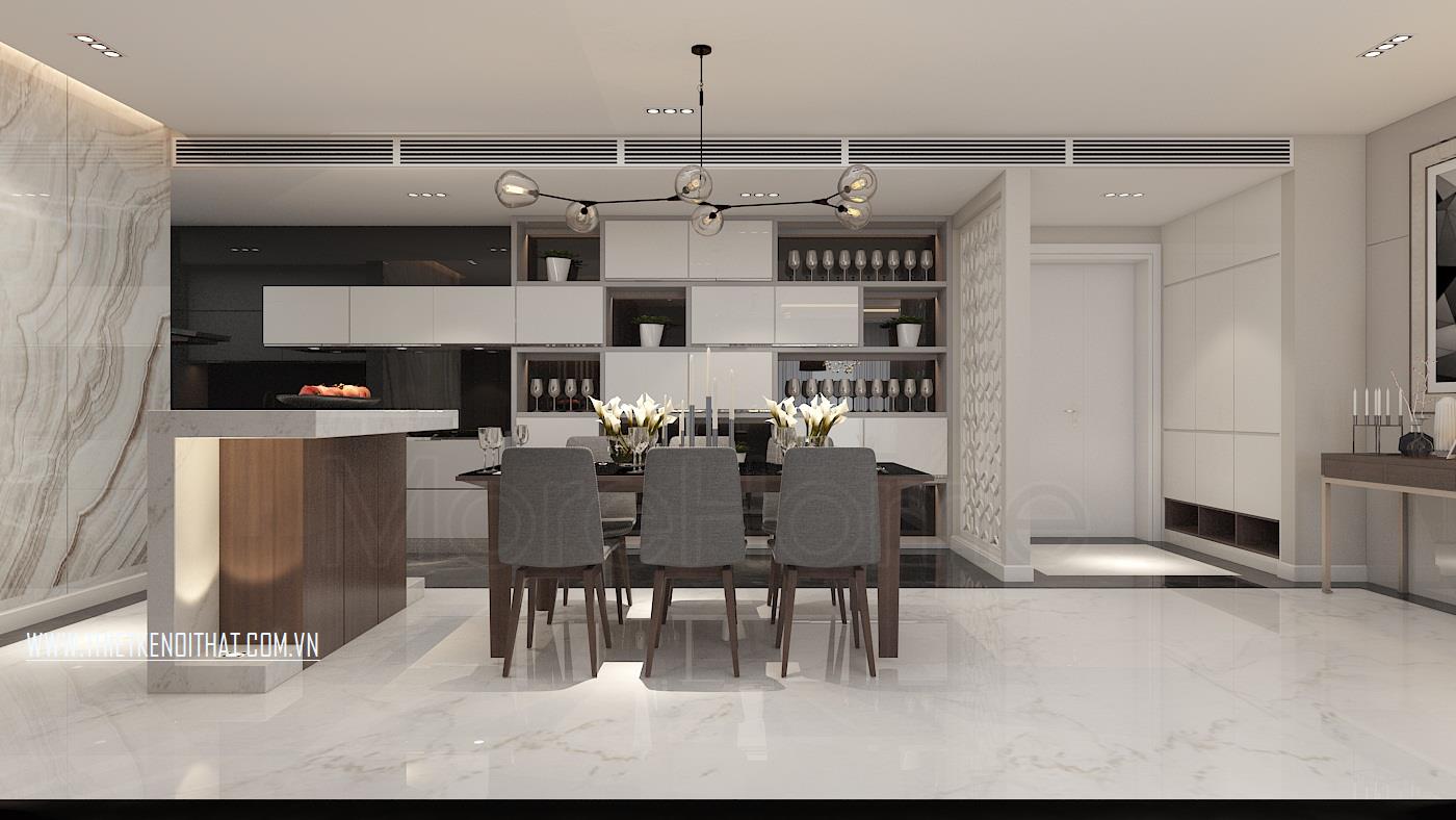 Không gian bàn ăn hiện đại với thiết kế kiểu dáng cách tân mang lại sự trẻ trung và hiện đại. Bàn chữ nhật mở rộng phù hợp với các buổi sinh hoạt của cả gia đình. Điểm nhấn đáng nói ở đây chính là thiết kế vách ngăn gỗ xuyên suốt trong không gian sinh hoạt chung, kết nối không gian bếp, phòng ăn, phòng khách và khu tâm linh. Với đặc điểm thiết kế thay thế dầm gỗ và các thiết kế tường built-in cứng nhắc bằng vách gỗ gọn nhẹ, linh hoạt vừa đảm bảo tính công năng lại tăng thêm vẻ đẹp thẩm mỹ. Ở đây, thiết kế tủ gỗ đa năng cách tân hiện đại cũng dễ dàng thu hút sự tò mò của bất cứ ai, tạo điểm nhấn thẩm mỹ nhẹ nhàng, tinh tế.