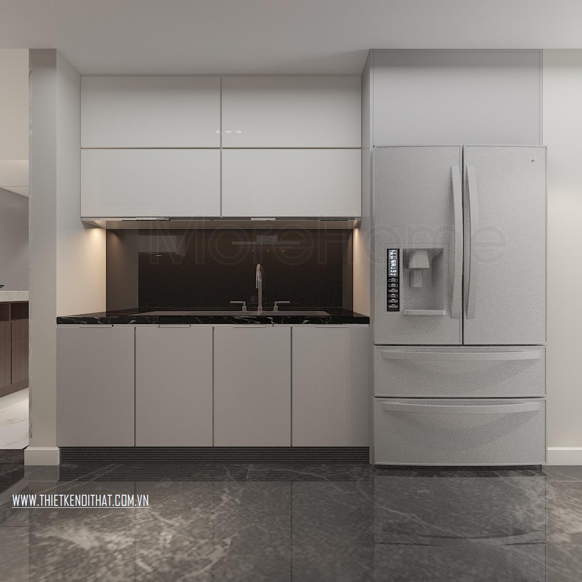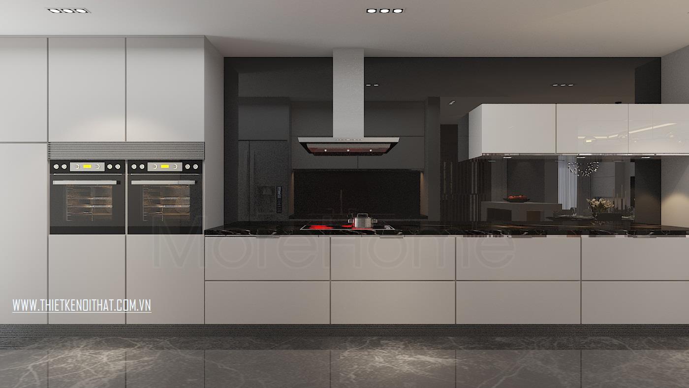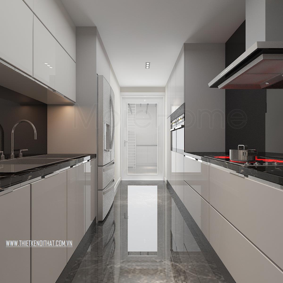 Tiếp theo là thiết kế nội thất bếp hiện đại, vật liệu nhẹ được kiến trúc sư ưu ái sử dụng giúp đảm bảo tính công năng mà không làm không gian trở nên nặng nề hay gò bó. Gỗ ép với các thanh gỗ được đánh veneer và phun sơn trắng bóng giúp không gian có độ phản chiếu nhẹ nhàng mang đến cảm giác cơ nới về không gian. Thiết kế bếp mở rộng, không đóng khung do điều kiện bề ngang hẹp. Đây là một trong những thiết kế linh hoạt, nhấn mạnh đến chiều dài của không gian, vừa giúp khắc phục hạn chế vừa giúp tận dụng không gian kéo dài.