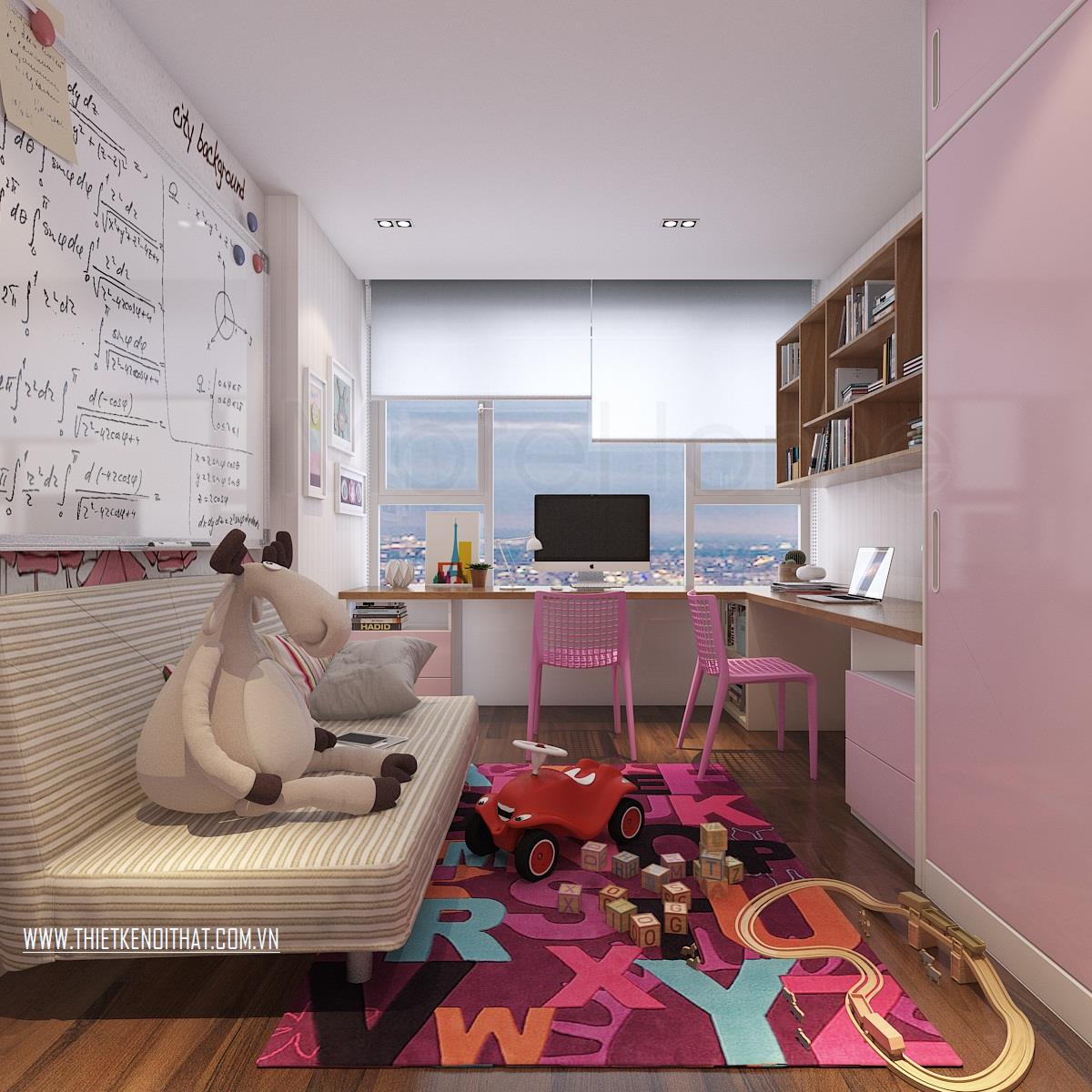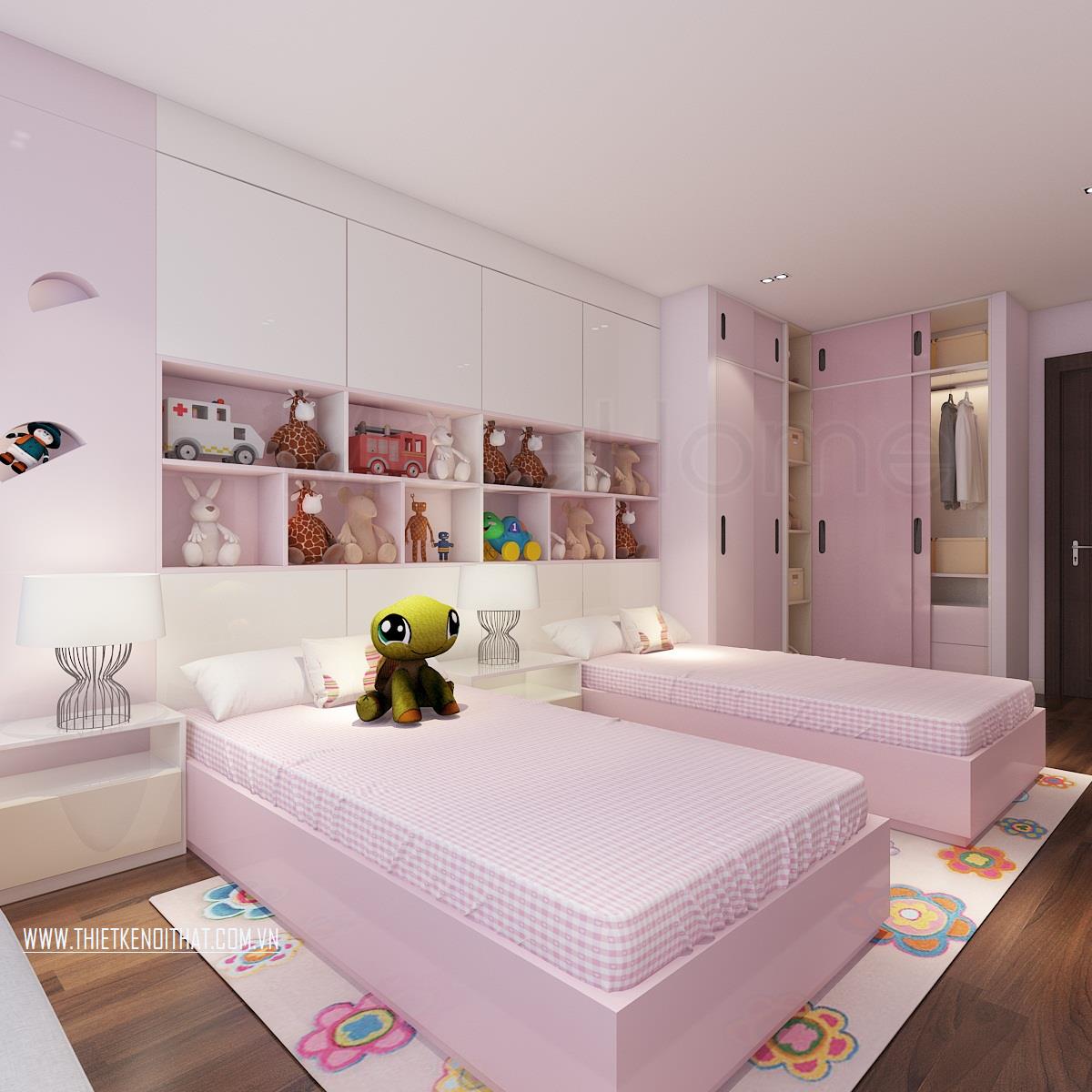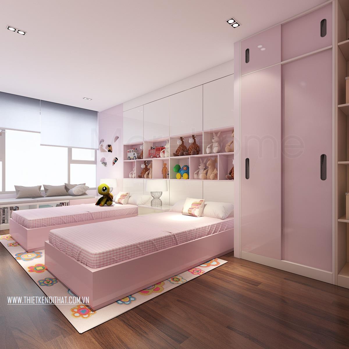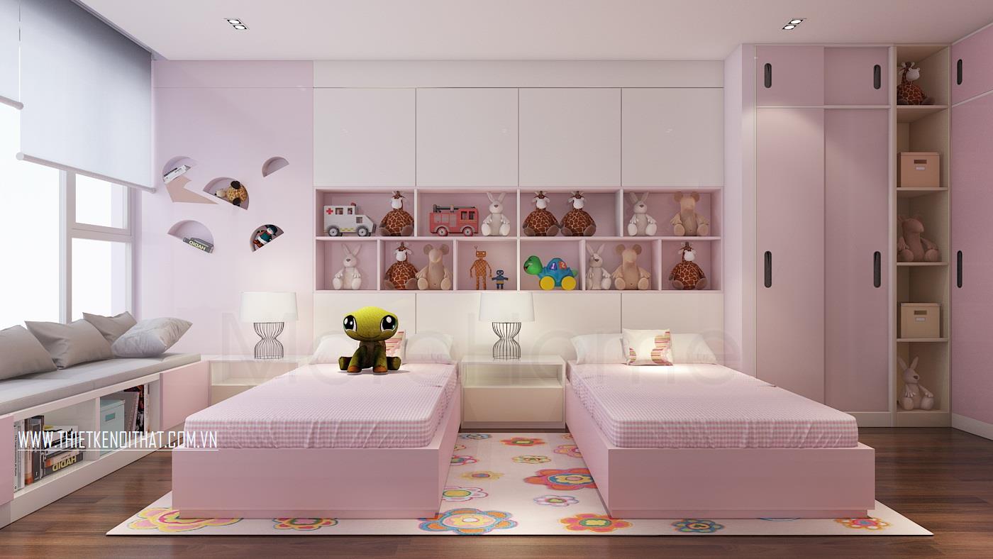 Thiết kế phòng ngủ phong cách hiện đại sử dụng tone màu lạnh làm chủ đạo, tạo cảm giác đơn giản, không gò bó, đúng theo phong cách và sở thích của gia chủ. Ánh sáng tự nhiên từ khung cửa kính rộng mang lại sức sống và sự cân bằng cho căn phòng. Ngoài ra, thiết kế phòng ngủ cho trẻ cũng vô cùng ấn tượng. Tone màu hồng dịu nhẹ cũng như các hoa văn trang trí nhẹ nhàng gợi mở một trí tưởng tượng bay bổng và một thế giới yên bình. Tủ gỗ kết hợp kệ đồ và tủ quần áo luôn phát huy được cả thế mạnh về không gian và thẩm mỹ.