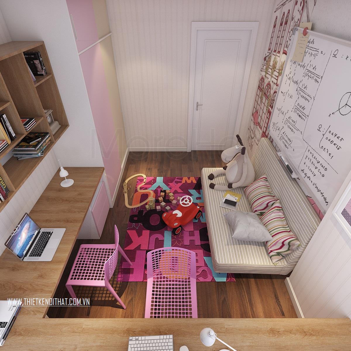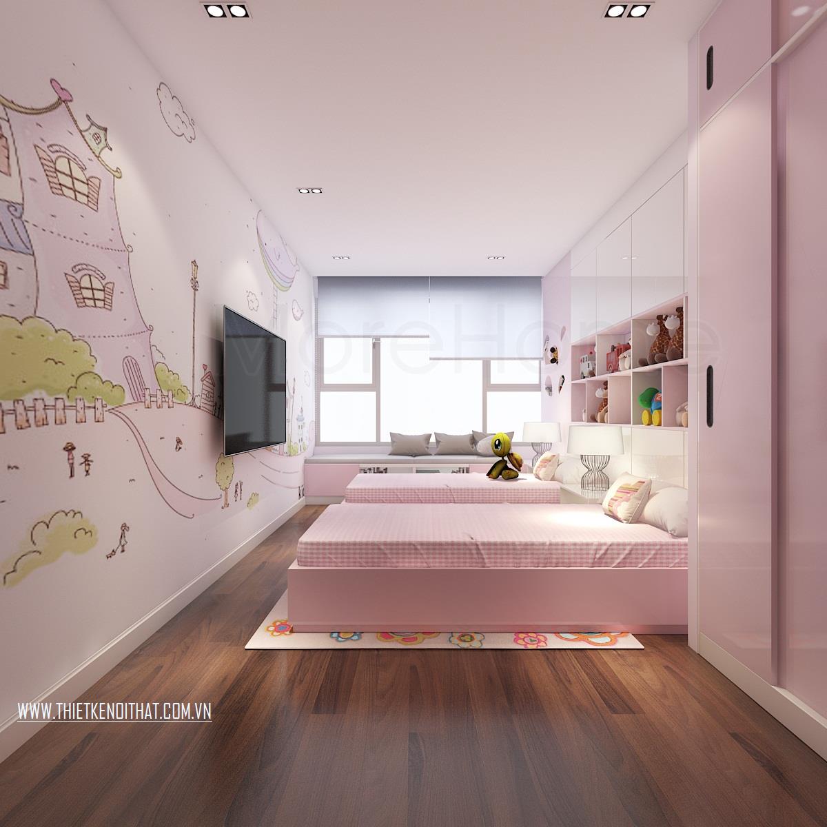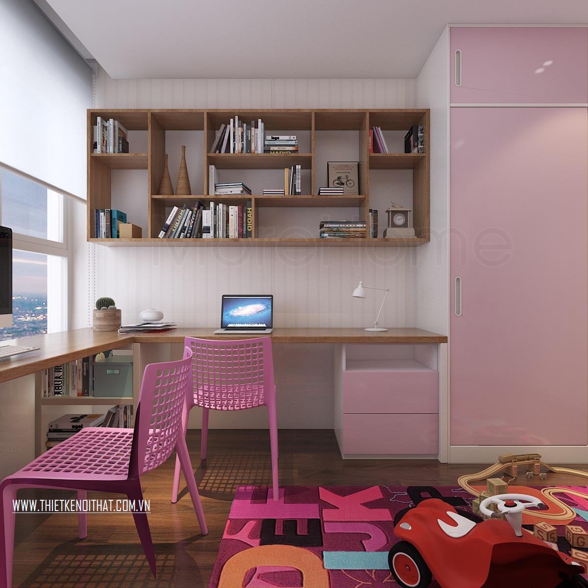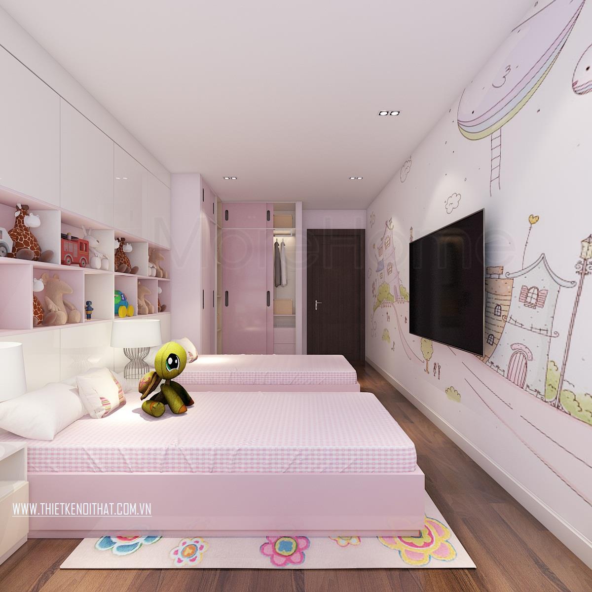 Thiết kế phòng ngủ phong cách hiện đại sử dụng tone màu lạnh làm chủ đạo, tạo cảm giác đơn giản, không gò bó, đúng theo phong cách và sở thích của gia chủ. Ánh sáng tự nhiên từ khung cửa kính rộng mang lại sức sống và sự cân bằng cho căn phòng. Ngoài ra, thiết kế phòng ngủ cho trẻ cũng vô cùng ấn tượng. Tone màu hồng dịu nhẹ cũng như các hoa văn trang trí nhẹ nhàng gợi mở một trí tưởng tượng bay bổng và một thế giới yên bình. Tủ gỗ kết hợp kệ đồ và tủ quần áo luôn phát huy được cả thế mạnh về không gian và thẩm mỹ.
