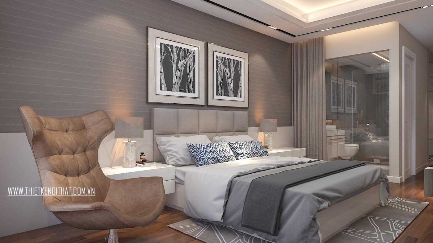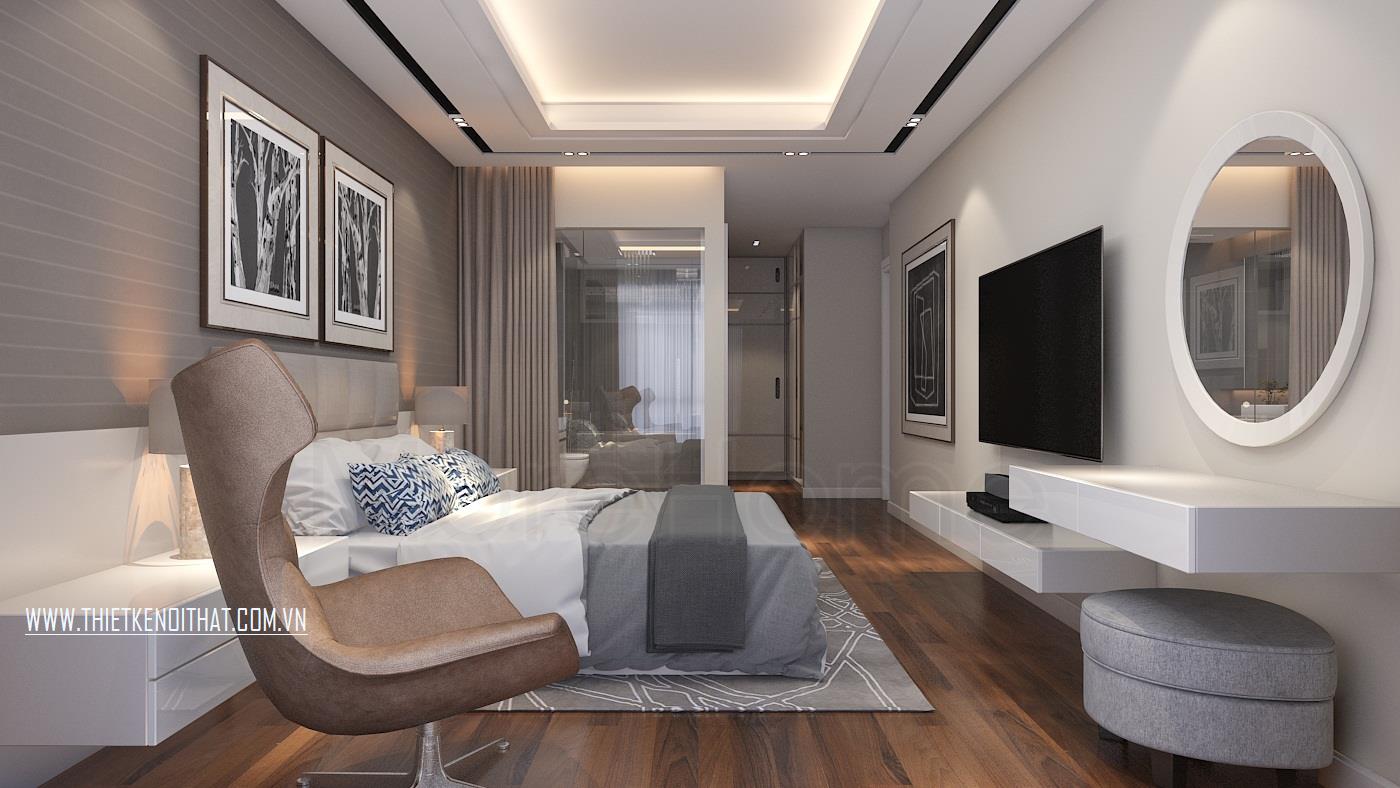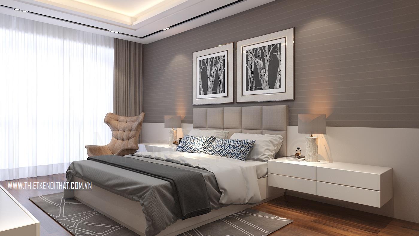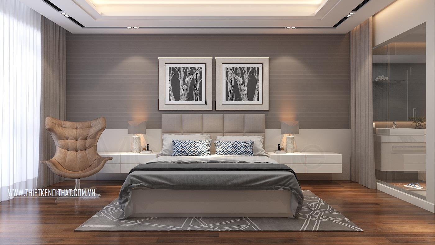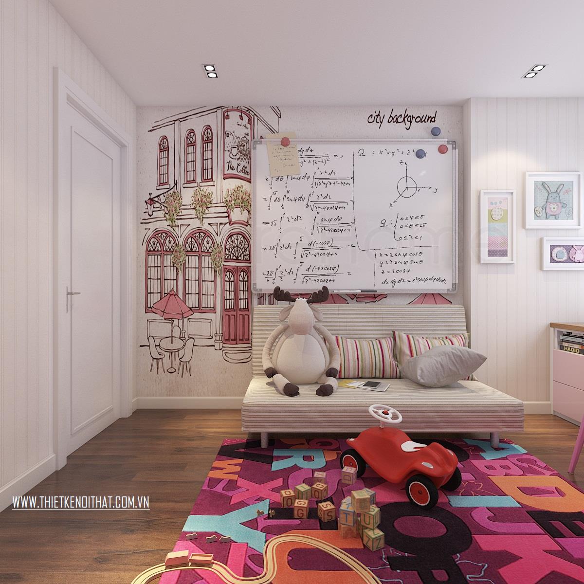 Thiết kế phòng ngủ phong cách hiện đại sử dụng tone màu lạnh làm chủ đạo, tạo cảm giác đơn giản, không gò bó, đúng theo phong cách và sở thích của gia chủ. Ánh sáng tự nhiên từ khung cửa kính rộng mang lại sức sống và sự cân bằng cho căn phòng. Ngoài ra, thiết kế phòng ngủ cho trẻ cũng vô cùng ấn tượng. Tone màu hồng dịu nhẹ cũng như các hoa văn trang trí nhẹ nhàng gợi mở một trí tưởng tượng bay bổng và một thế giới yên bình. Tủ gỗ kết hợp kệ đồ và tủ quần áo luôn phát huy được cả thế mạnh về không gian và thẩm mỹ.