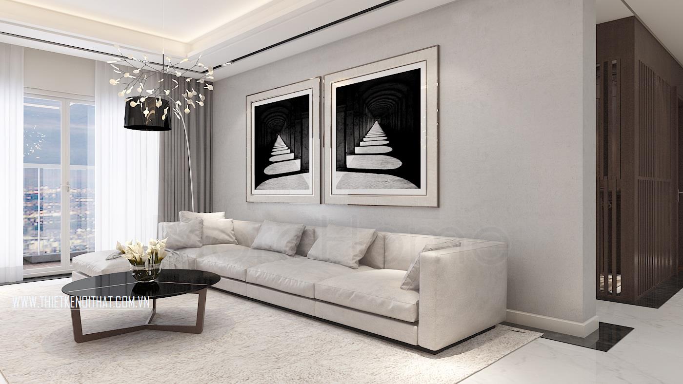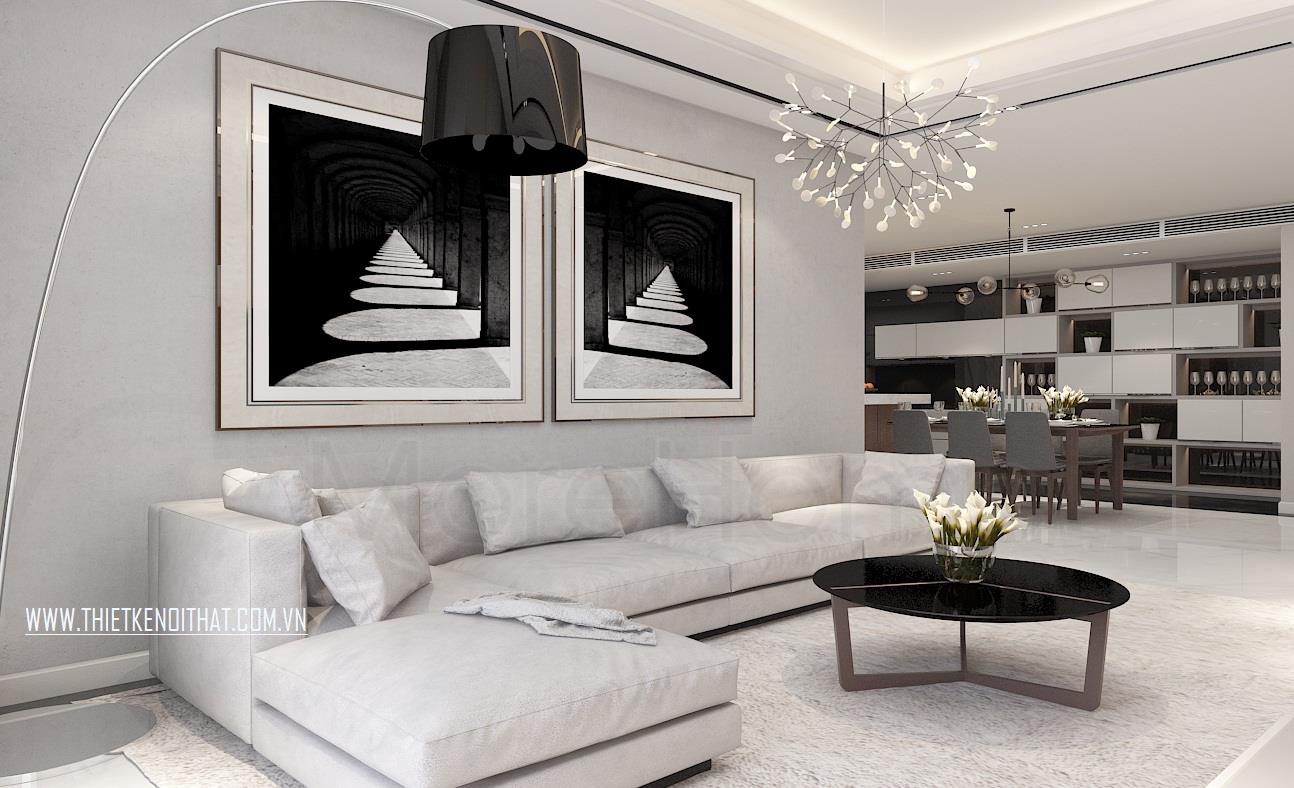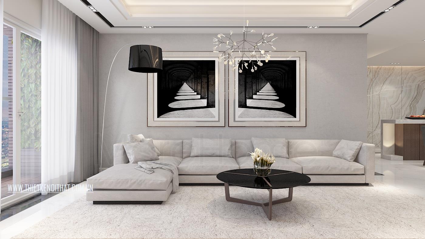 Thiết kế nội thất phòng khách hiện đại sử dụng bộ sofa chữ L điển hình với tone màu xám sáng. Việc sử dụng khéo léo màu sắc đồng nhất với tone màu tường và thảm trải sàn là một ý tưởng không tồi để mang đến cảm giác cơi nới về không gian và mở hơn trong thiết kế. Tuy nhiên, với thiết kế màu đồng nhất như vậy, nếu không khéo léo điều phối sẽ dễ mang đến cảm giác đơn điệu, không tạo sự nổi bật.
