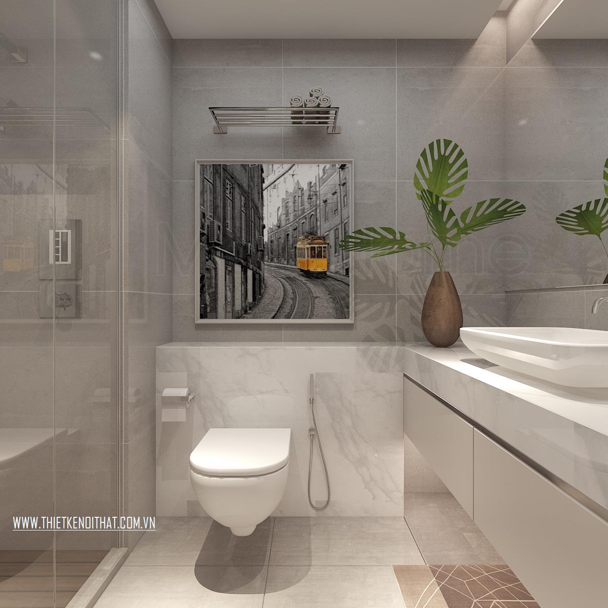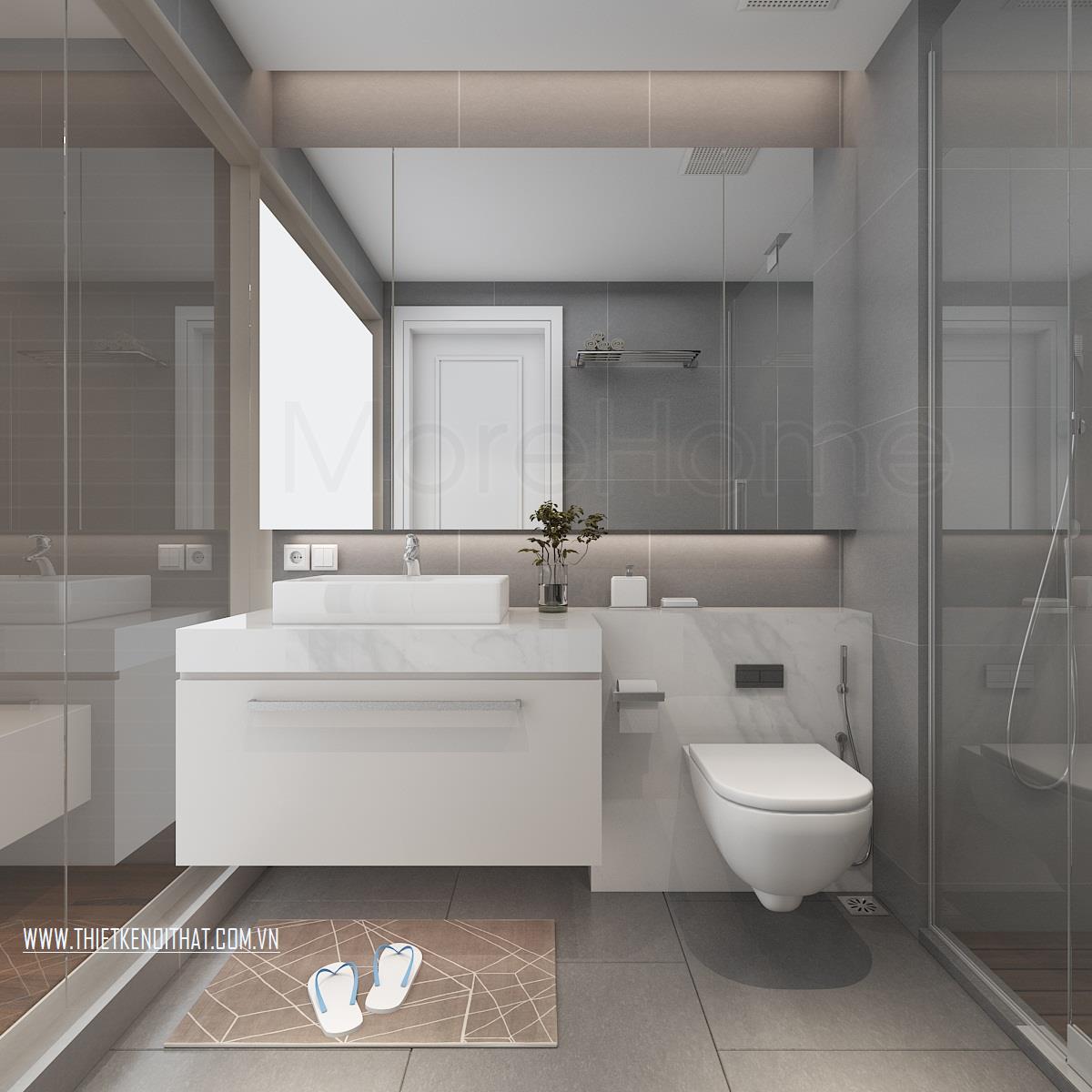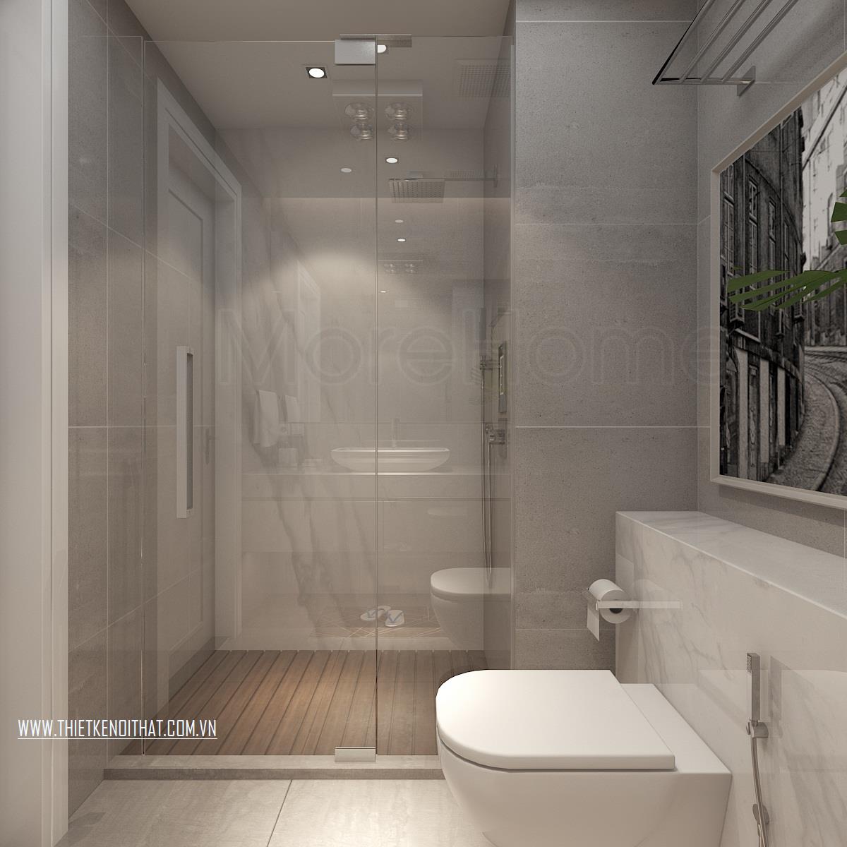 Nội thất phòng tắm hiện đại sử dụng kính, gương và đá tự nhiên làm các vật liệu chính. Đây là những vật liệu có tính chất phù hợp với không gian. Không gian tuy nhỏ nhưng các thiết kế được đơn giản hóa cộng với độ phản chiếu và trong suốt của vật liệu thiết kế mà căn phòng có độ thoáng nhất định, không tạo sự bí bách, khó chịu.