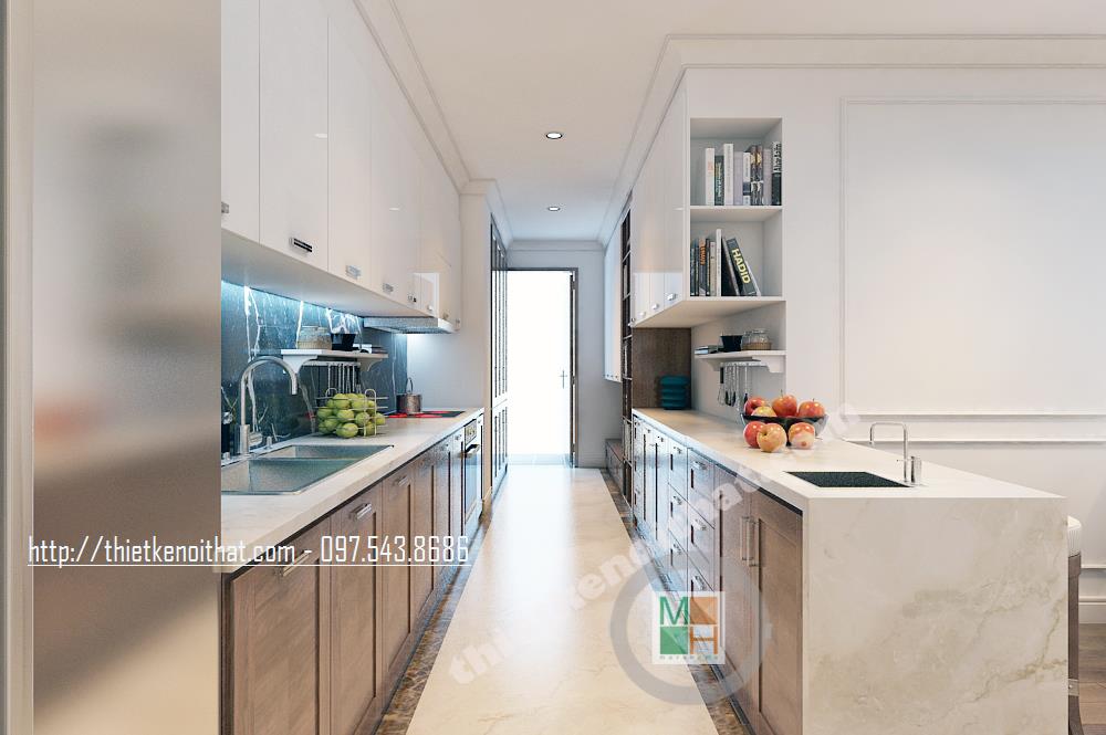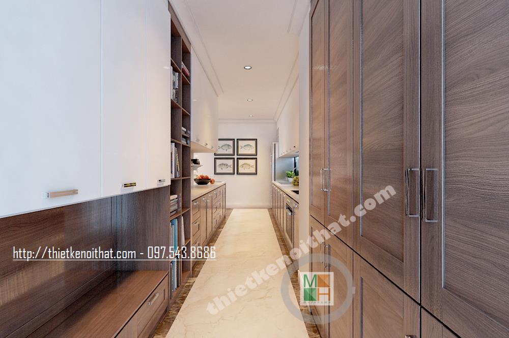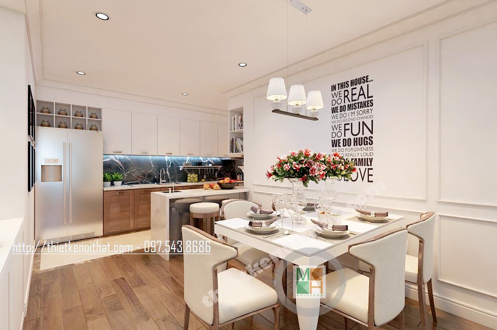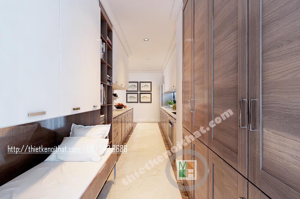 Thiết kế phòng bếp và bàn ăn liền kề với phòng khách. Với đặc điểm hạn chế về mặt diện tích, kiến trúc sư đã khắc phục bằng cách tạo mặt phẳng rộng cho kiến trúc đa năng và liền kề, loại bỏ các vách ngăn cứng và thô từ đó không gian trở nên thoáng hơn và tạo độ mở cho căn phòng. Phòng bếp với hệ thống tủ đứng cao cấp mang đến sự tiện nghi cho gia chủ. Một điểm rất thú vị ẩn trong không gian phòng bếp đó là hệ thống tủ đồ thiết kế sáng tạo kết hợp với không gian nghỉ ngơi kín đáo. Đây là thiết kế sáng tạo nhằm mang đến sự tiện nghi cho gia chủ ở mọi nơi và mọi thời điểm.