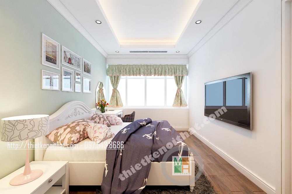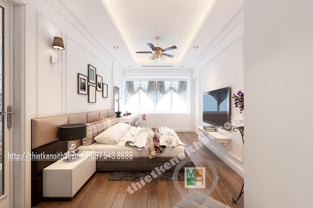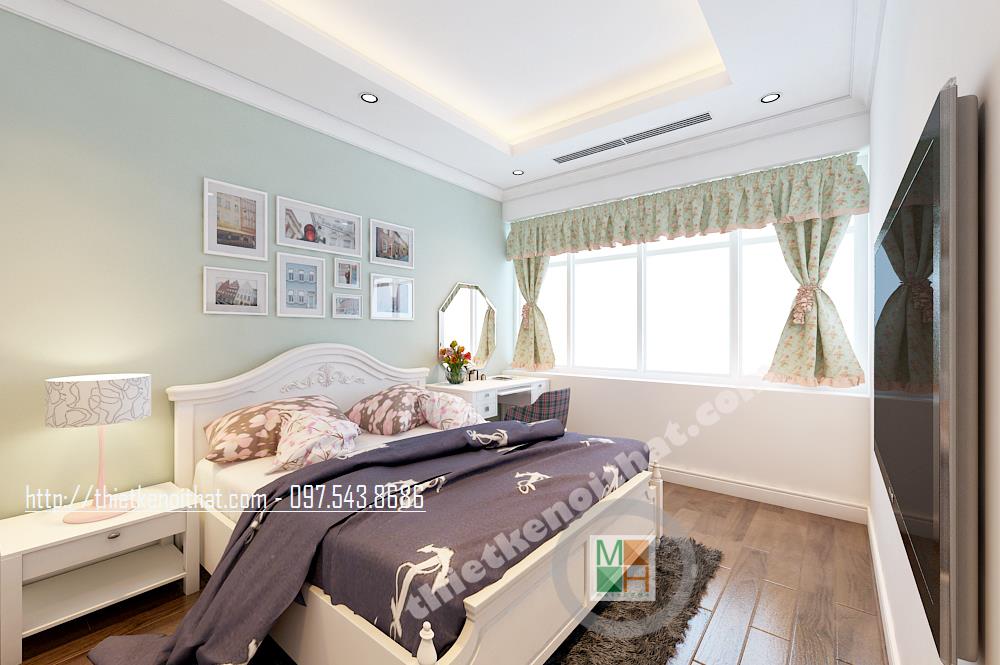 Thiết kế phòng ngủ đơn giản mang tông màu pastel nhẹ nhàng. Khung cửa rộng và kéo dài giúp tạo cảm giác cơi nới về diện tích. Thiết kế tạo điểm nhấn ở các đường nét trang trí trên rèm cửa hay trạm trổ chi tiết trên giường ngủ mang đến không gian thư giãn và tinh tế cho gia chủ.