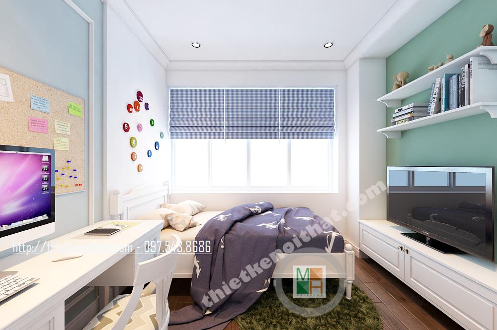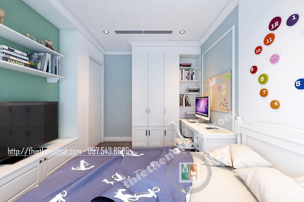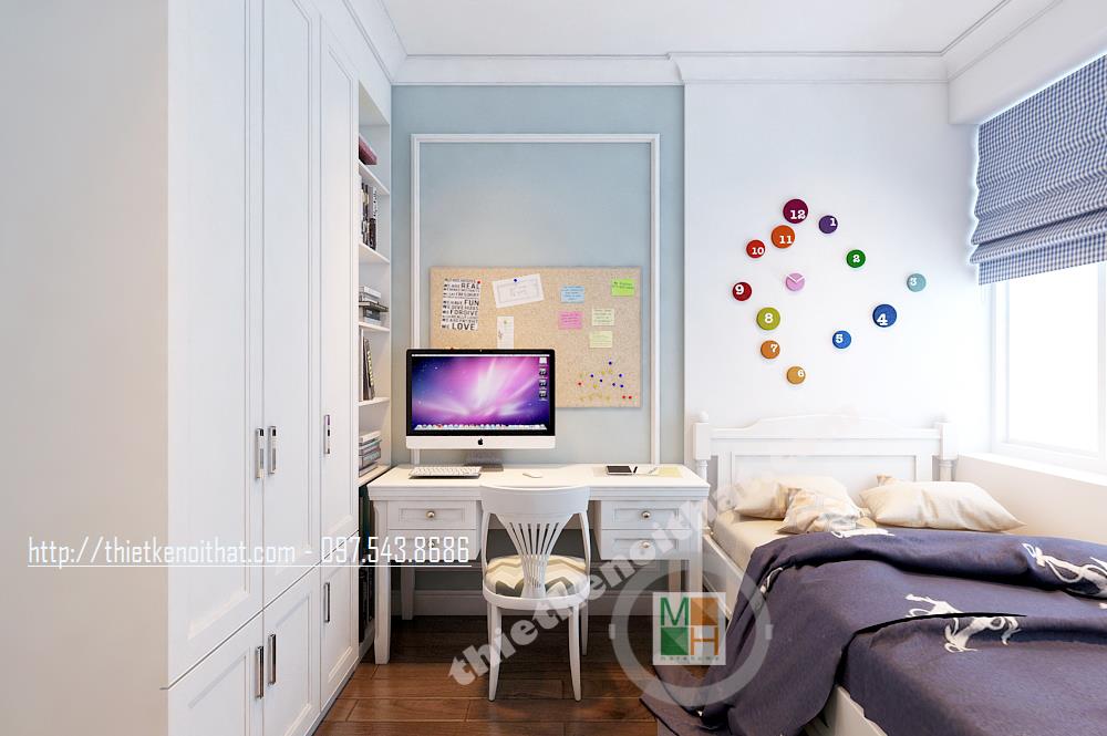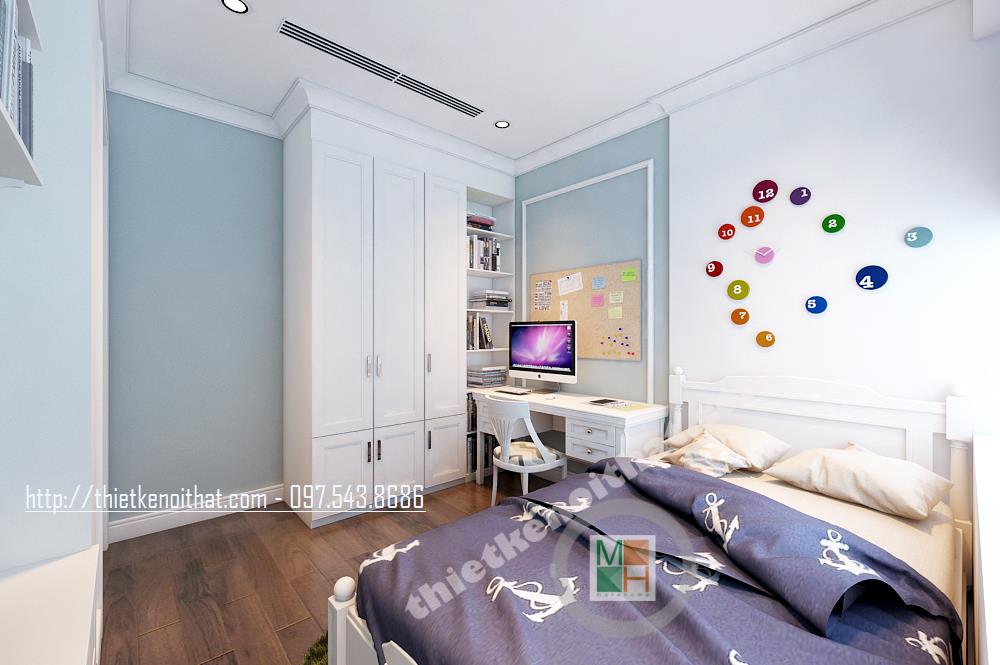 Phòng ngủ tiếp theo được thiết kế khá gọn gàng. Điểm thu hút hơn cả đó là chiếc đồng hồ thiết kế lạ mắt với màu sắc rực rỡ trên tường. Thiết kế kệ và tủ quần áo được sắp xếp gọn gàng tạo không gian mở cho các hoạt động khác.