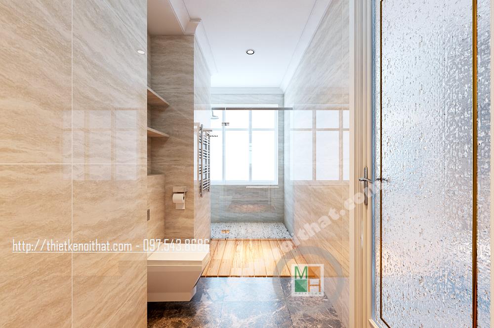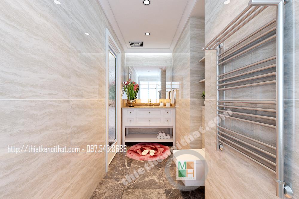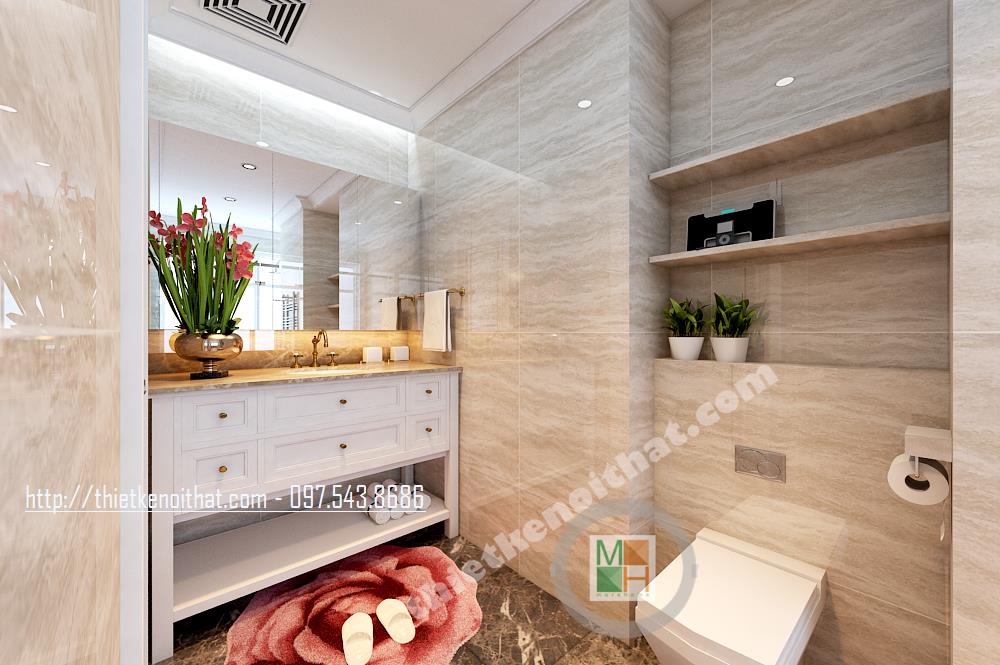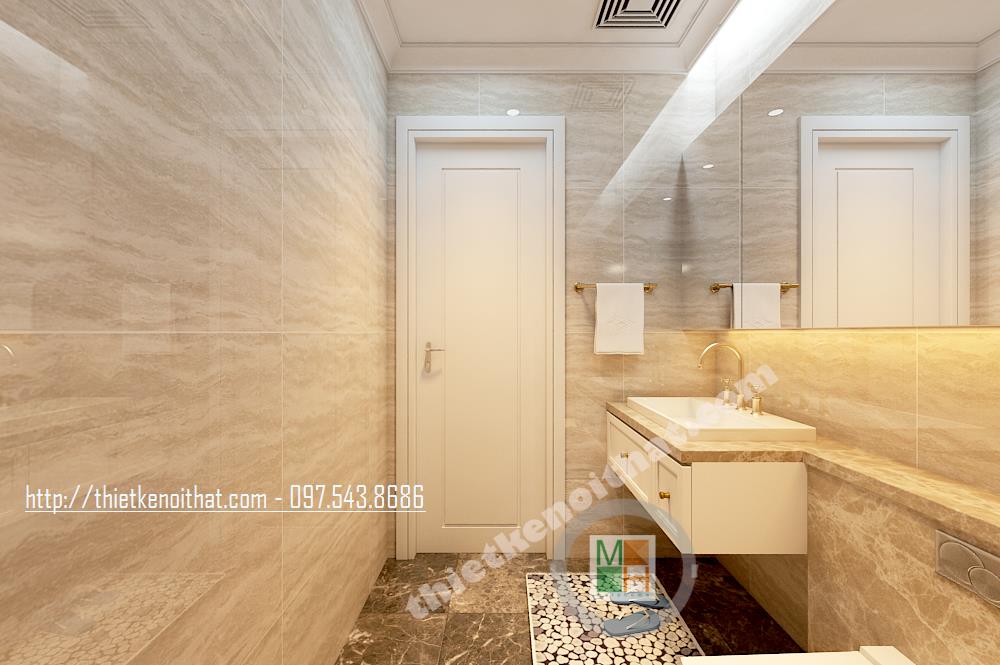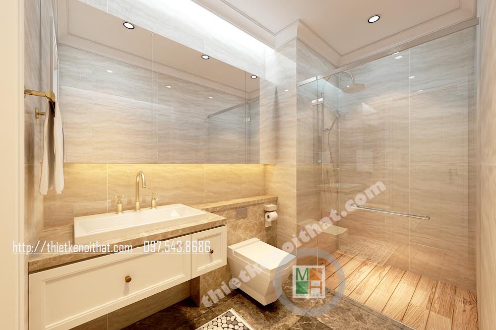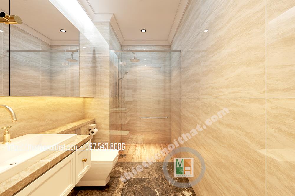 Thiết kế phòng tắm sử dụng hệ thống kính, gạch ốp và gương tạo độ phản chiếu và mang đến cảm giác cơi nới không gian. Các thiết bị cao cấp và hiện đại được lắp đặt mang lại tiện nghi cho gia chủ.