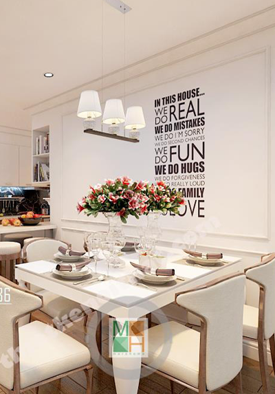 Thiết kế bàn ăn trang trọng với đường nét cổ điển theo phong cách châu Âu mang đến một không gian sang trọng và hiện đại. Để tránh không gian trống và đơn điệu, kiến trúc sư đã khéo léo sử dụng giấy dán tường để kéo sư thu hút và tò mò.