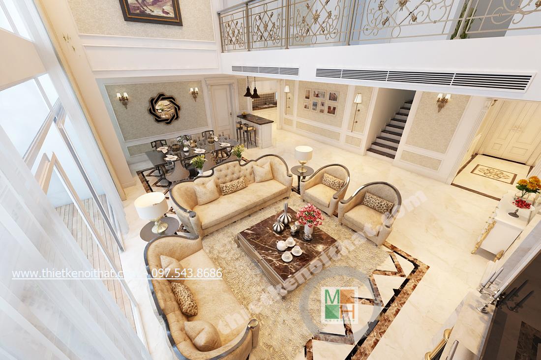 Đồng thời đặt chiếc thảm lông ở phòng khách cũng càng làm tăng thêm sự sang trọng cho căn nhà. Thảm lông được lựa chọn màu xám rất hợp với chi tiết đá hoa cương ở dưới sàn. Nhân đây nói về lựa chọn sàn đá hoa cương là một trong những đặc trưng bóng bẩy của thiết kế tân cổ điển giúp căn nhà mang đậm nét sang trọng hơn. Sofa cũng sử dụng các chi tiết cầu kỳ với các đường nét uốn lượn đặc trưng của vương giả.
