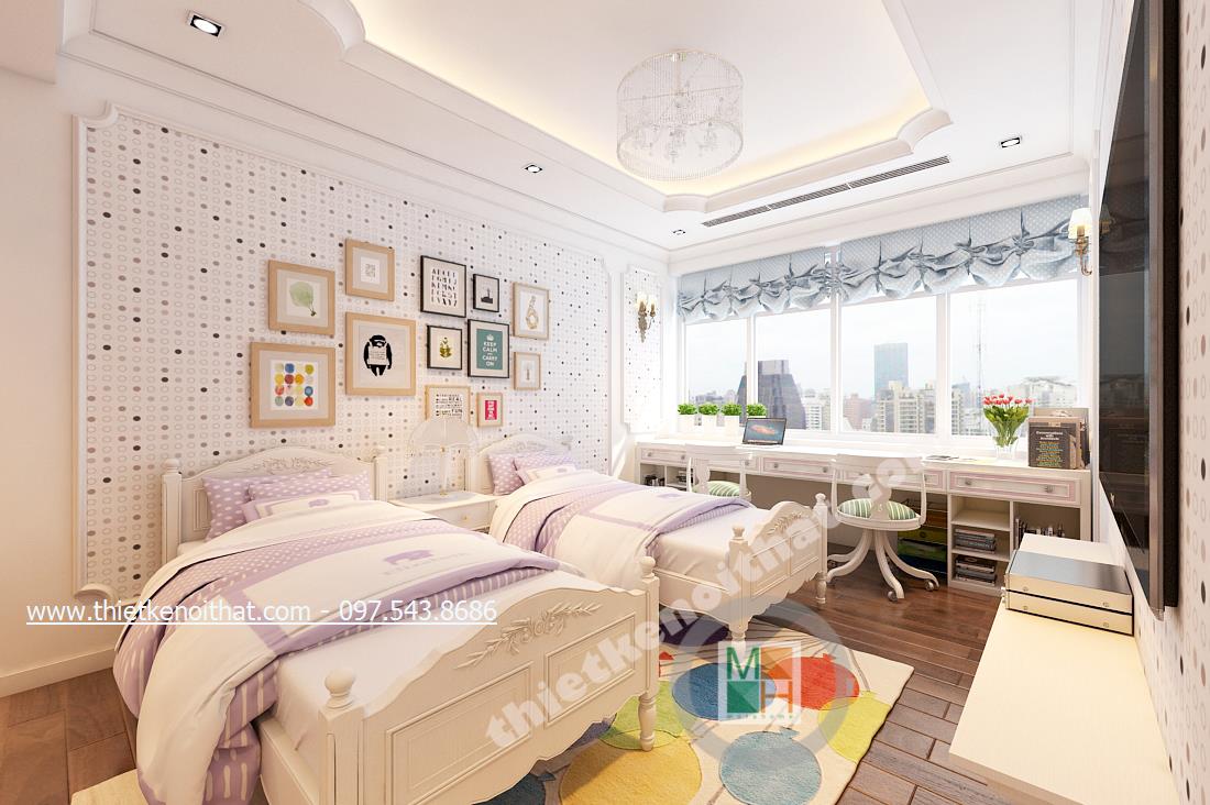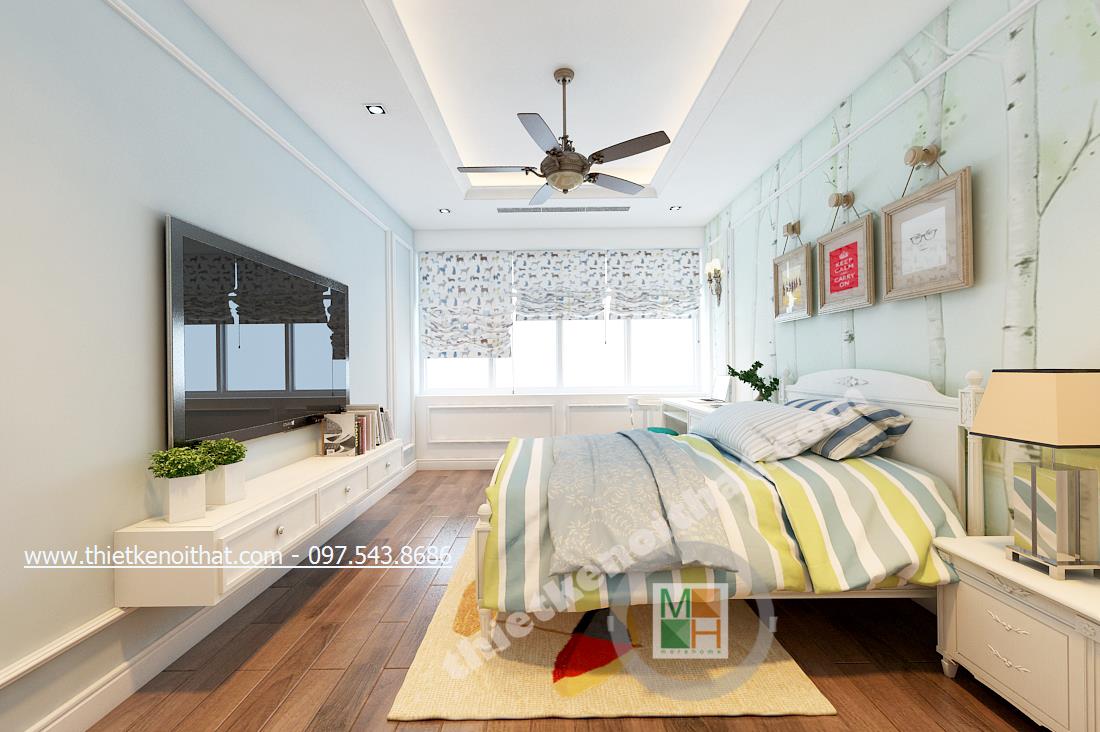 Thiết kế nội thất phòng ngủ tiếp theo mang đến nhiều cảm giác cuả thiên nhiên hơn và ngả nhiều về phía hiện đại của thiết kế theo phong cách tân cổ điển. Điều này thể hiện ở bức tường in ảnh thiên nhiên đằng sau cùng màu sắc của bộ ga giường và chậu cây khéo léo đặt cạnh TV. Tổng thể căn phòng giúp gợi cho người nhìn và chủ nhân căn phòng cảm giác nhẹ nhàng như bước vào một căn phòng nhỏ với chiếc rèm xinh xinh trong những bộ phim của Studio Ghibli.