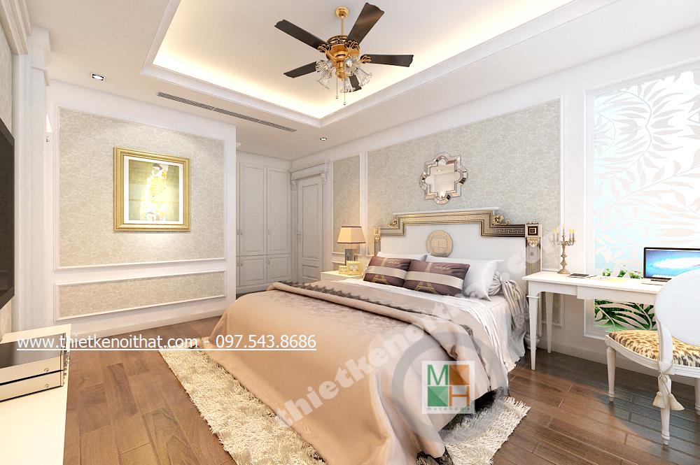 Thiết kế nội thất phòng ngủ Master của gia chủ lại lựa chọn tone màu sáng và gold nhẹ vừa có sự liên kết với thiết kế tân cổ điển chung của cả căn nhà mà vẫn tạo cảm giác nhẹ nhàng, thư thái. Ở đây chiếc thảm giả lông được lồng khéo léo dưới chân giường cầu kỳ giúp mang đến cảm giác đế vương. Các chi tiết khác như đèn giả quạt và gương trên đầu giường đều là sự kết hợp hài hòa và thanh lịch giữa thiết kế nội thất tân cổ điển và thiết kế nội thất phong cách hiện đại.