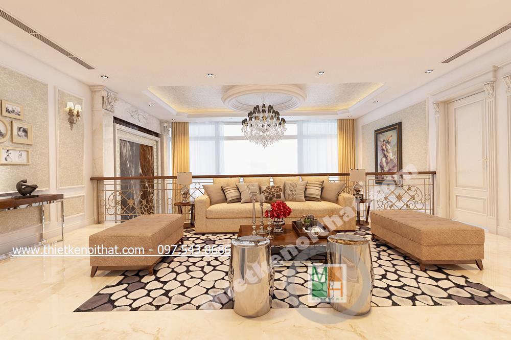 Bước lên tầng hai từ chiếc cầu thang đá cẩm thạch, ta như đi giữa không gian của một vương triều La Mã cổ đại để bước ra không gian rộng lớn của thảo nguyên xung quanh. Đến đây, giữa những căn phòng là bộ sofa tạo một căn phòng ảo nhỏ với liên tưởng như một gia phòng khách nhỏ vừa thuận tiện đón tiếp khách nếu cả khách của bố mẹ và bạn bè của con đến thăm nhà vừa là nơi quây quần gia đình xem bộ phim tối trước khi cả nhà về phòng ngủ. Ở đây mang nhiều nét mới của cuộc sống hiện đại với chi tiết thảm cách tân, chiếc ghế lạ…nhưng vẫn hài hòa tinh tế với chi tiết đèn đồng kiểu dáng và hình thức với chiếc đèn phòng khách chính.