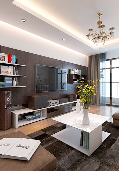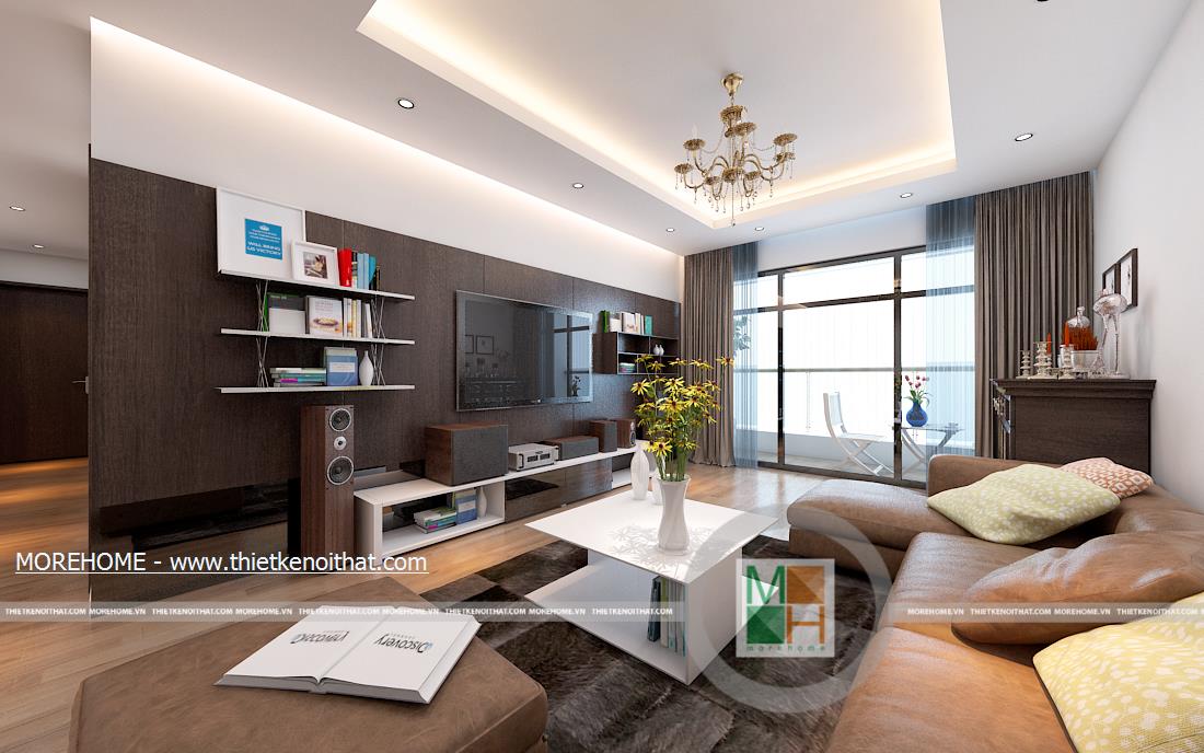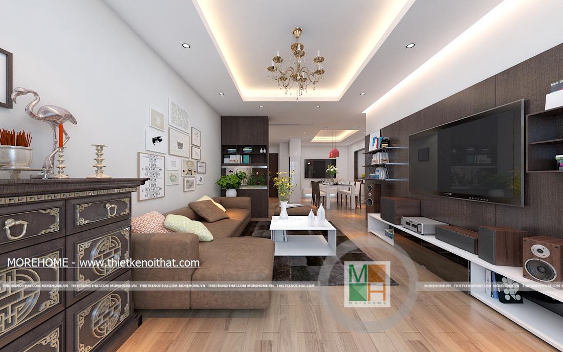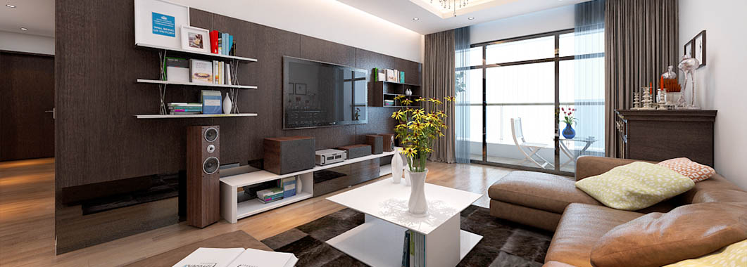 Phòng khách đem lại cảm giác ấm cúng với bàn uống nước và hệ thống kệ hiện đại. Màu nâu của chiếc sofa nâu nổi bật trên nền tường trắng, trở thành tâm điểm của căn phòng. Bên cạnh sofa là tủ thờ với những hoa văn trang trí đậm chất Á Đông. Có thể trang trí thêm cho những mảng tường trống bằng tranh ảnh gần gũi mà không kém phần sang trọng. Từ phòng khách nhìn ra là không gian xanh mát của ban công, bạn cũng có thể nhâm nhi tách trà, đọc báo thư giãn trong không gian ban công xanh và thoáng này.