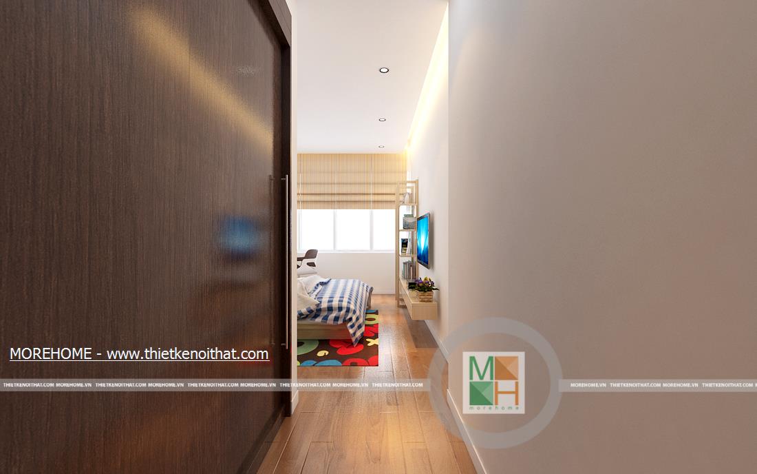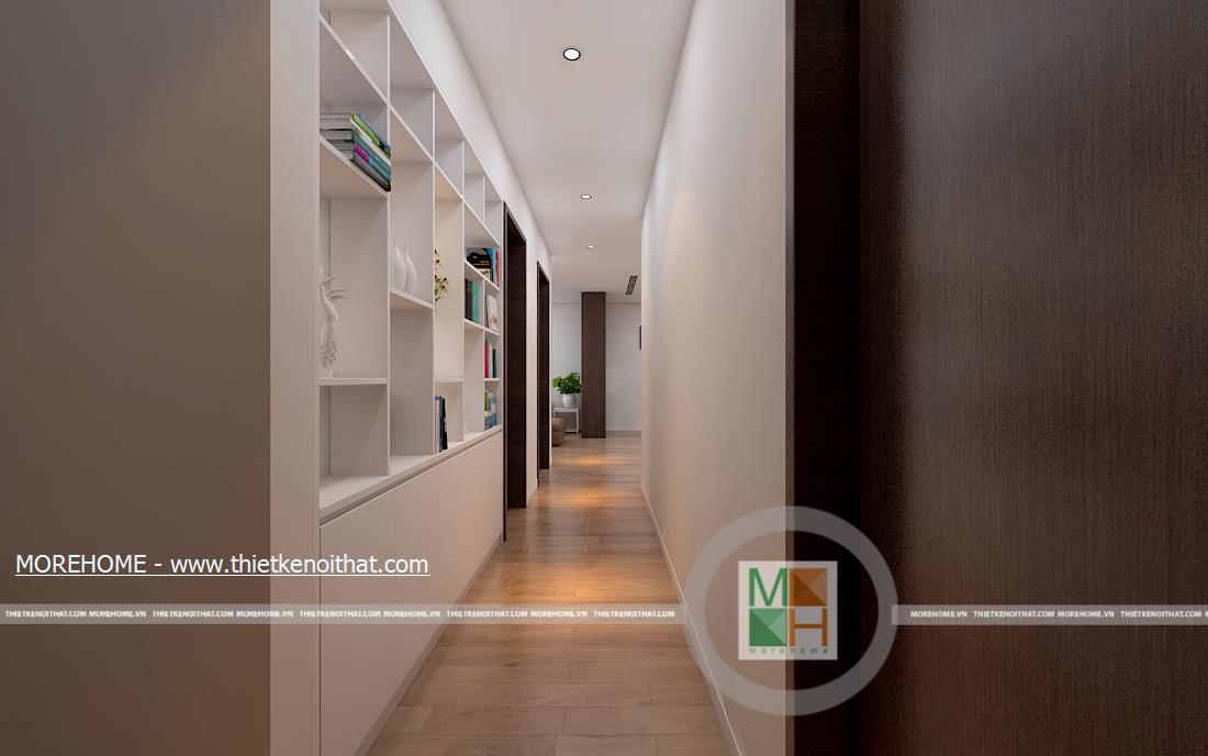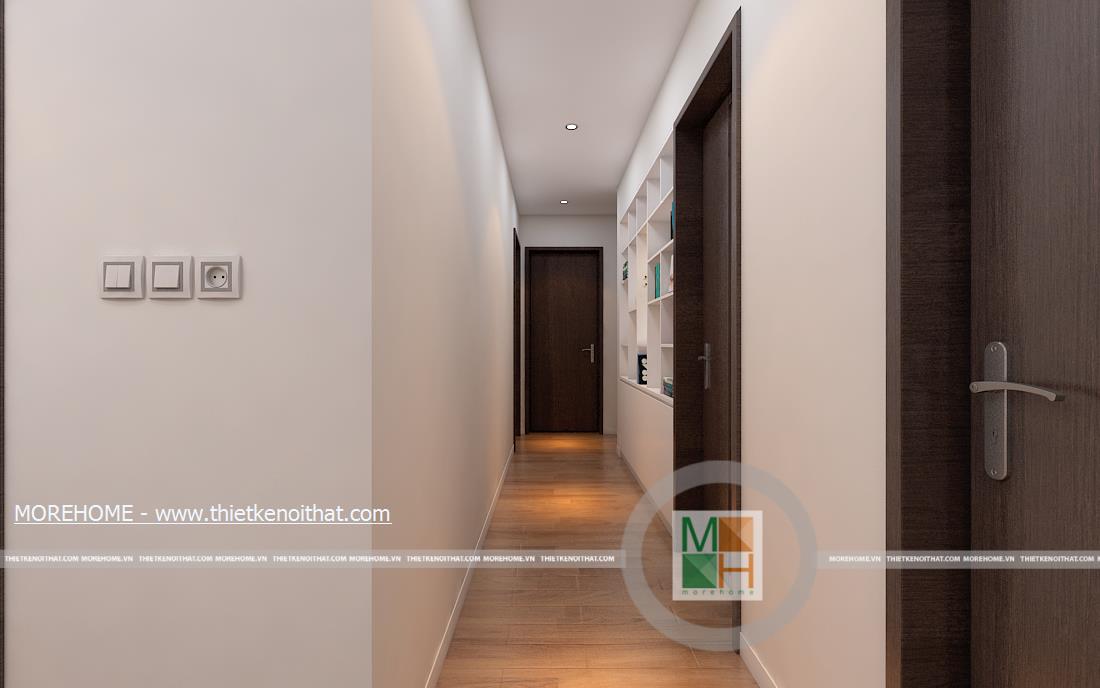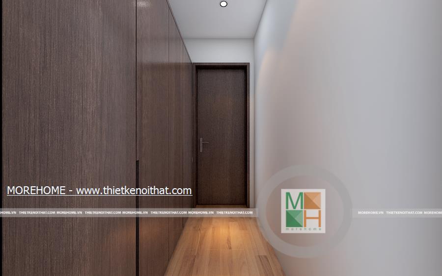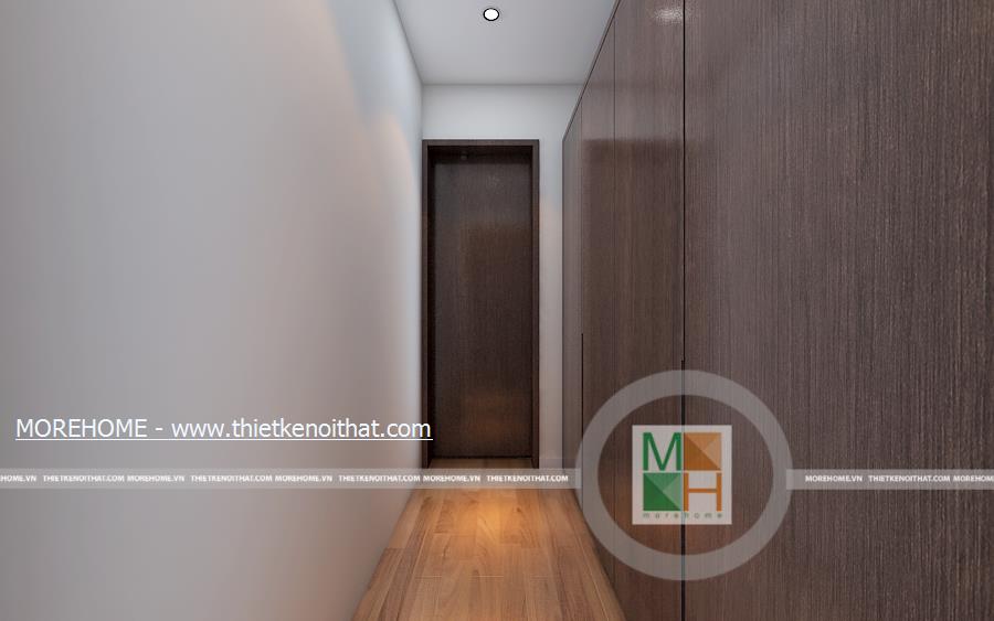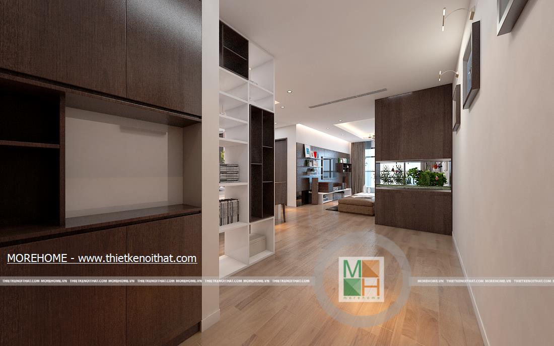 Bước vào căn hộ là tiền phòng với hệ thống tủ giày dẫn thằng tới không gian phòng khách rộng rãi.