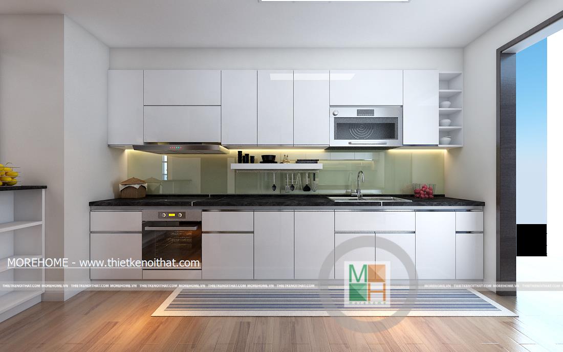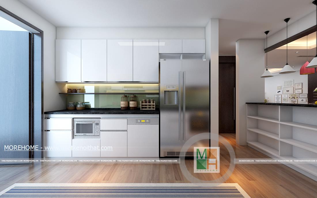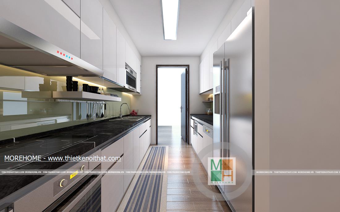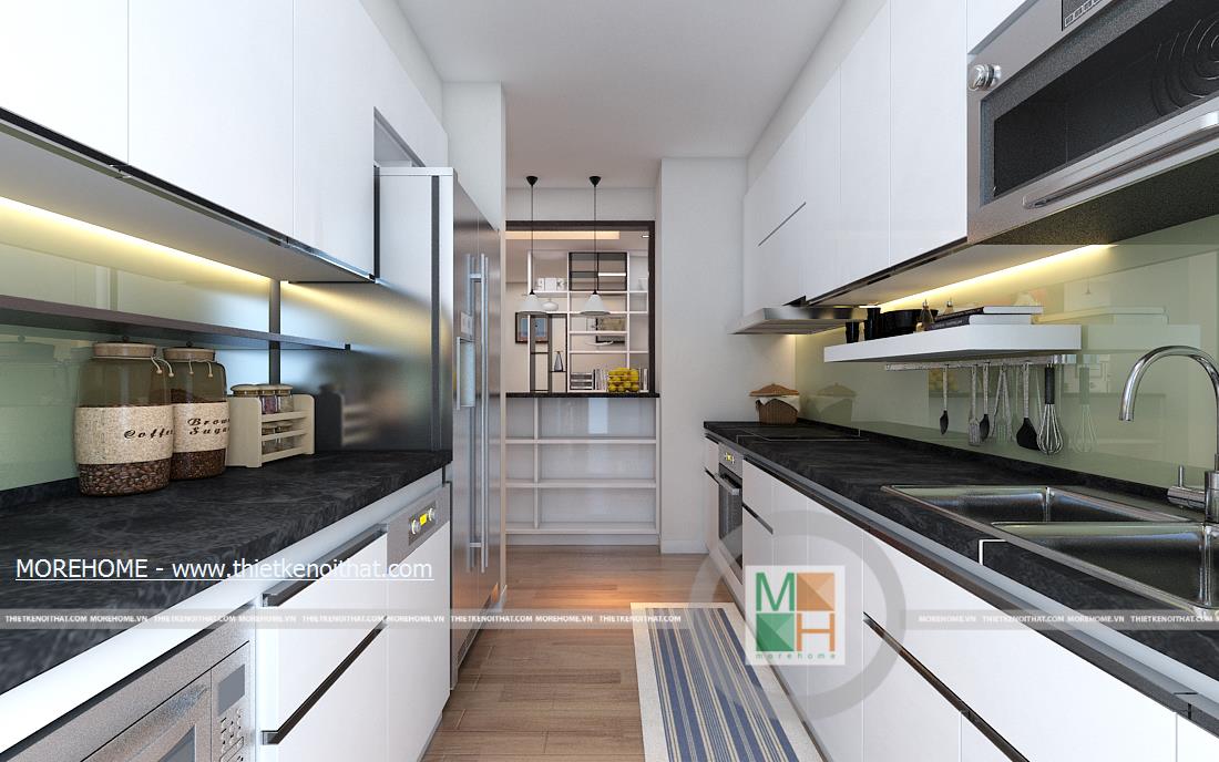 Gian bếp được ngăn cách với phòng khách bằng một quầy bar nhỏ, nơi gia chủ có thể ngồi tiếp rượu với bạn bè và người thân. Nội thất bếp được thiết kế dọc theo hành lang rộng dẫn ra ban công nhằm tiết kiệm diện tích. Hệ thống tủ đồ và các tiện nghi công nghệ, điện tử có thể làm hài lòng những bà nội trợ khó tính nhất.