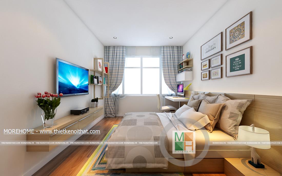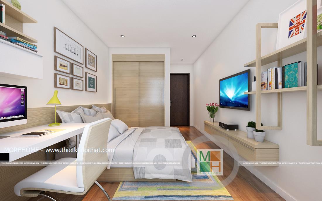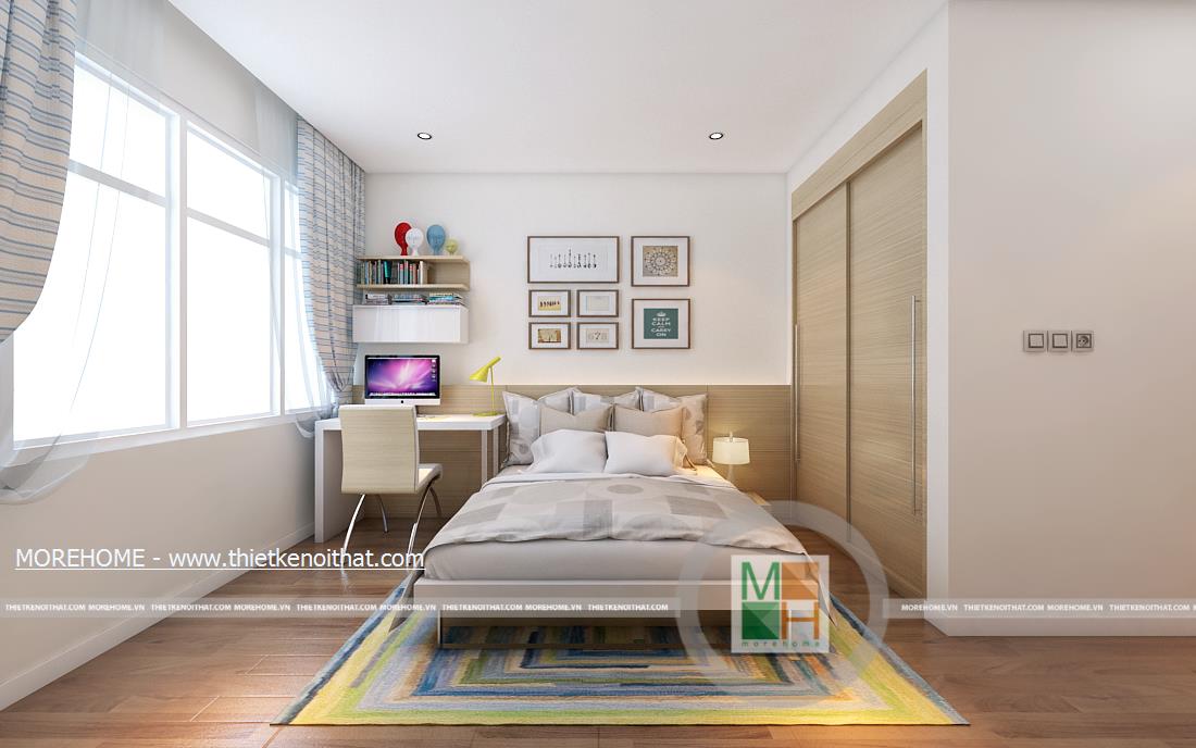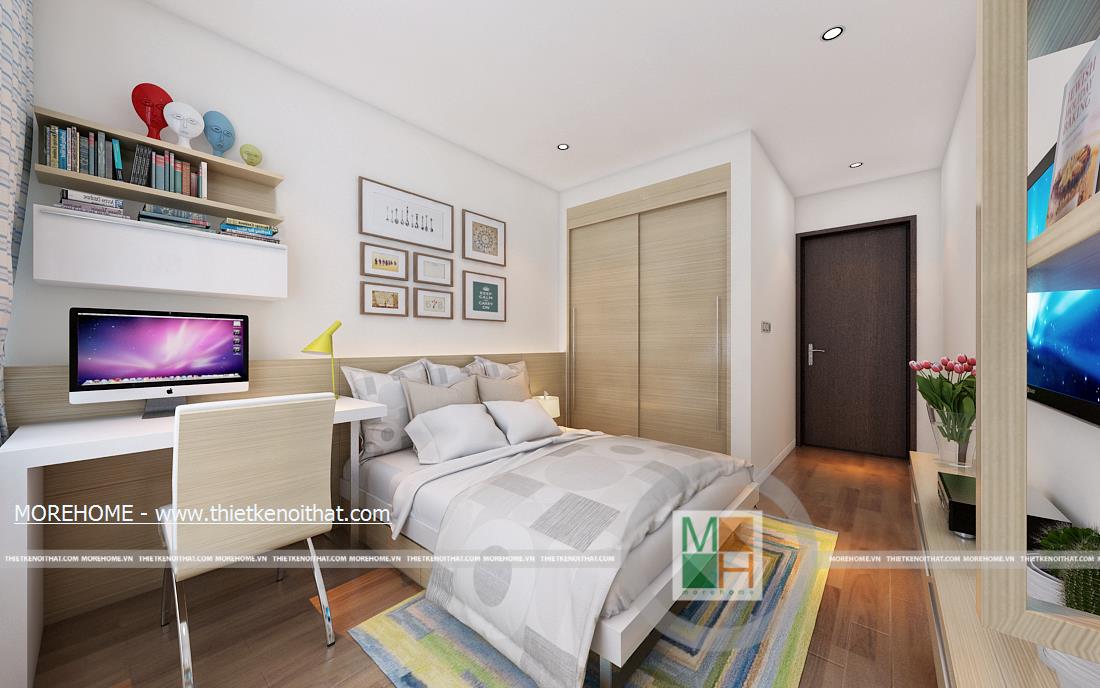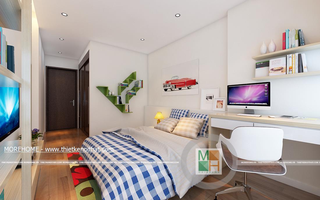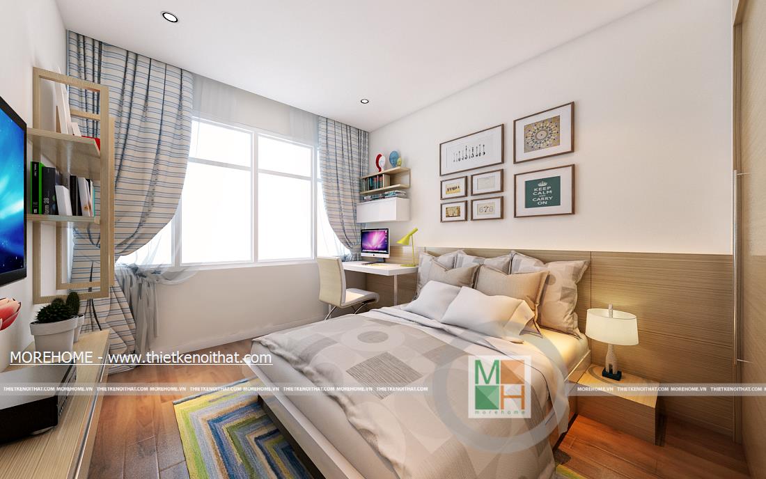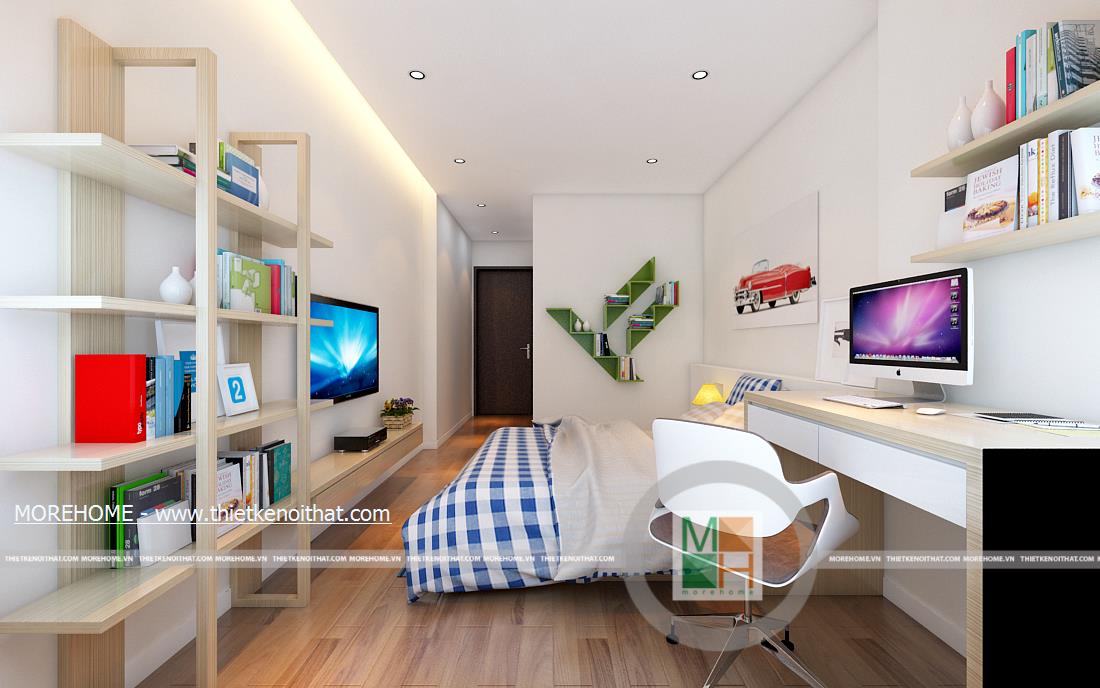Phòng ngủ của con lớn có màu sắc tươi sáng, với nội thất đơn giản nhưng vẫn đảm bảo được công năng và tính thẩm mỹ. Bàn học cùng với giá sách được kê sát với cửa sổ nhằm tận dụng thêm ánh sáng thiên nhiên, có lợi cho sự tập trung. Có thể trang trí thêm cho mảng tường đầu giường bằng những bức tranh trẻ trung để không mang lại cảm giác đơn điệu.