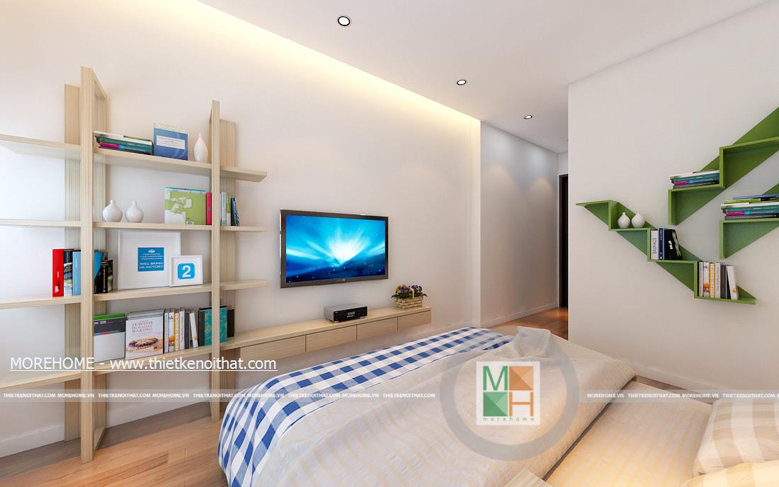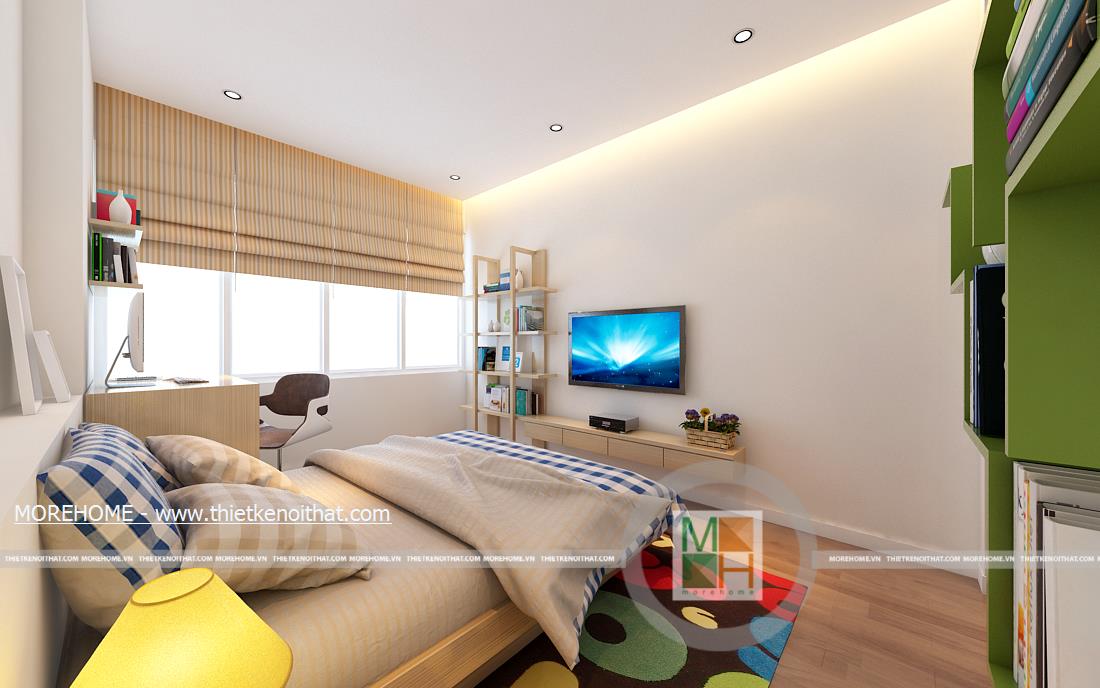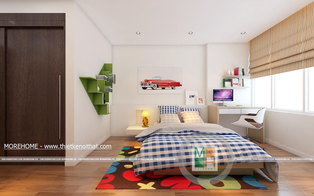 Phòng ngủ con nhỏ cũng được bài trí tương tự nhưng hơi khác biệt về phong cách để phù hợp với lứa tuổi. Ga giường, gối hay chiếc thảm đều mang những màu sắc trẻ trung và sinh động. Điểm nhấn dễ gây chú ý nhất có lẽ chính là chiếc kệ sách được sơn xanh lá với thiết kế độc đáo. Không gian trống trong phòng cũng được thiết kế vừa đủ để con có thể vui chơi và vận động trong phòng.