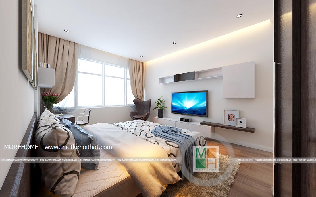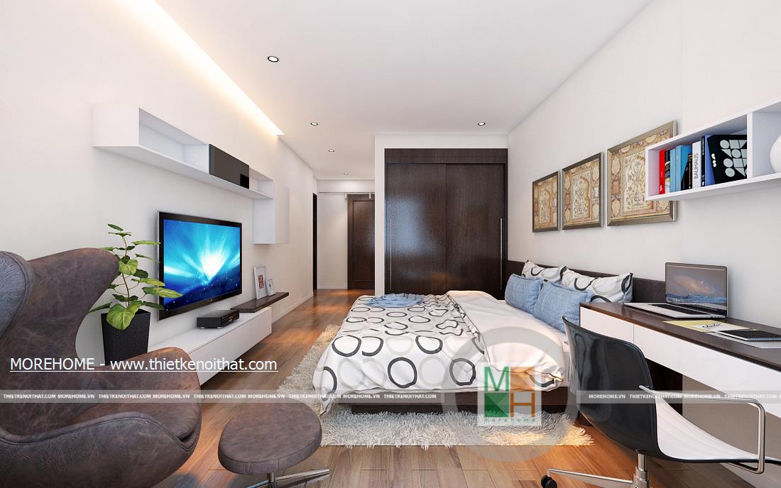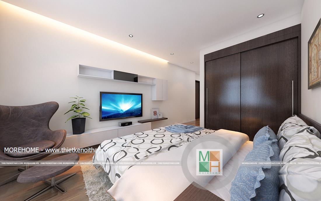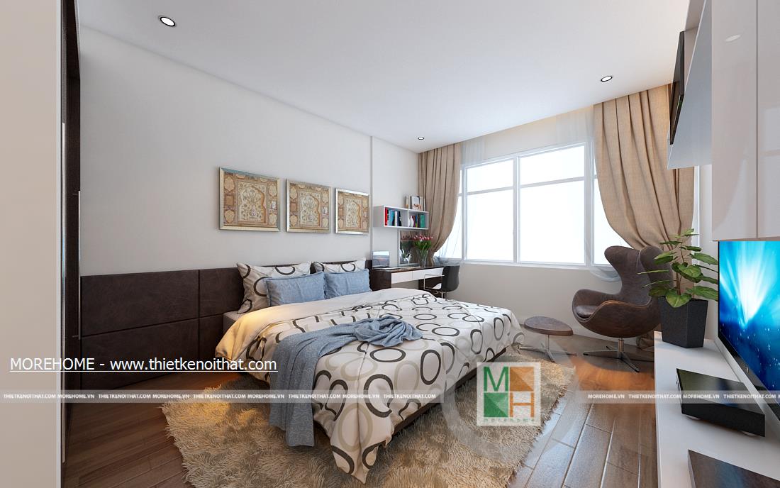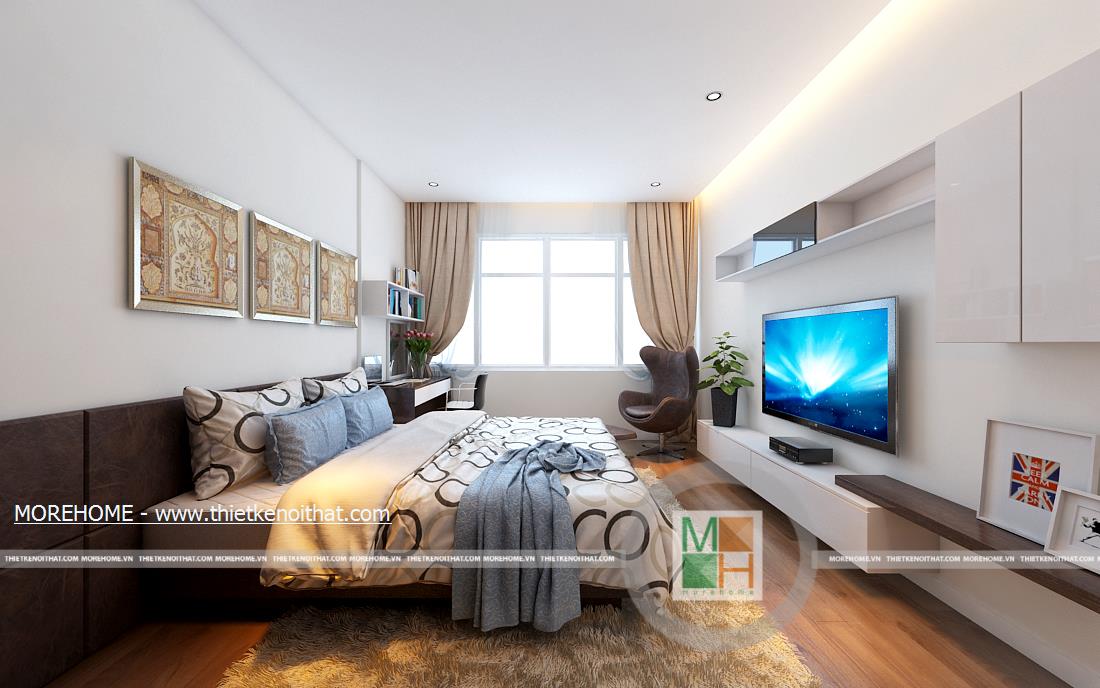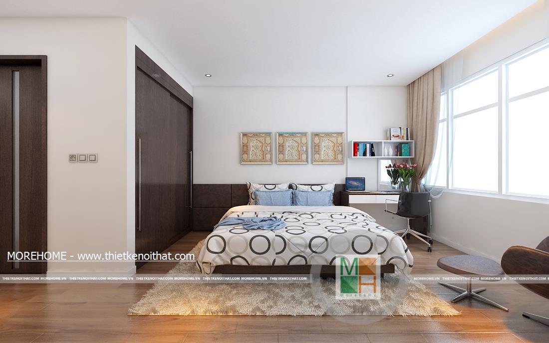 Phòng ngủ của bố mẹ sử dụng gam màu trầm sang trọng và đẳng cấp. Nội thất phòng ngủ được thiết kế môt cách chắc chắn, có sự liên kết để tạo cảm giác an toàn khi sử dụng.