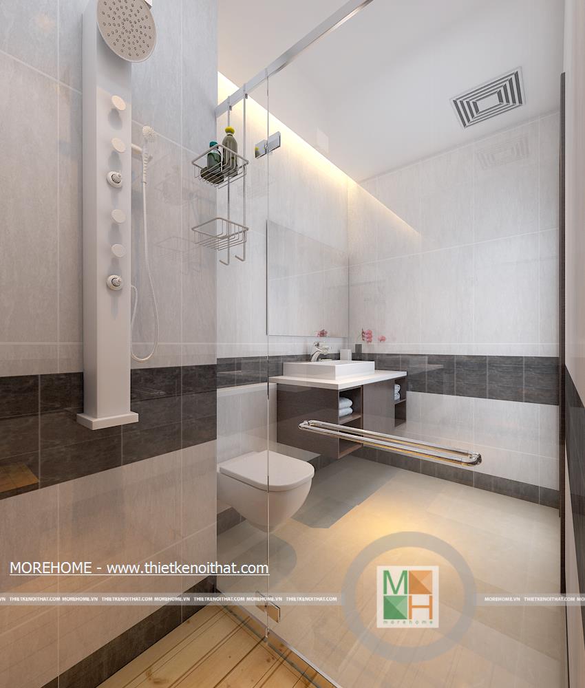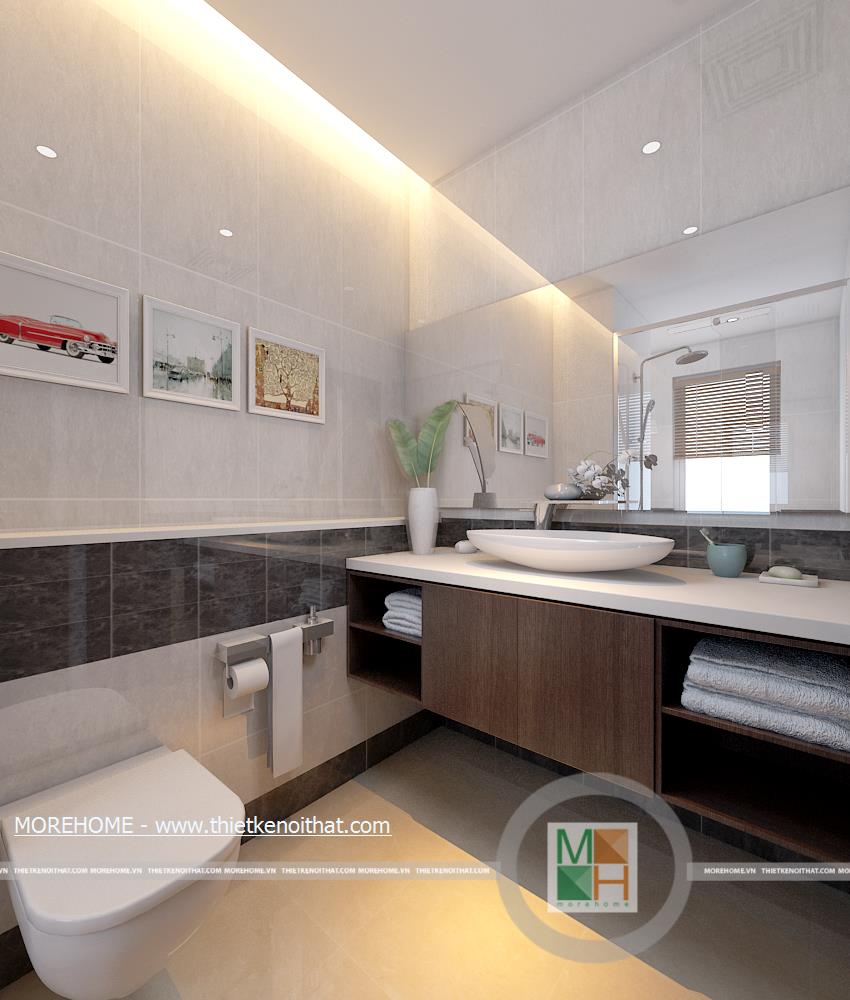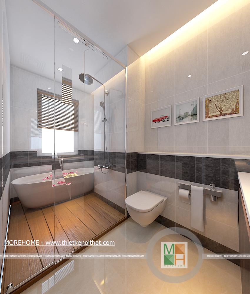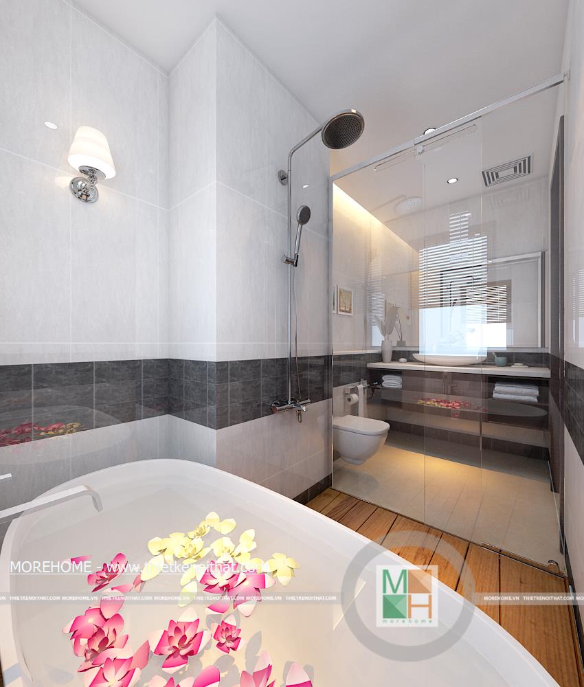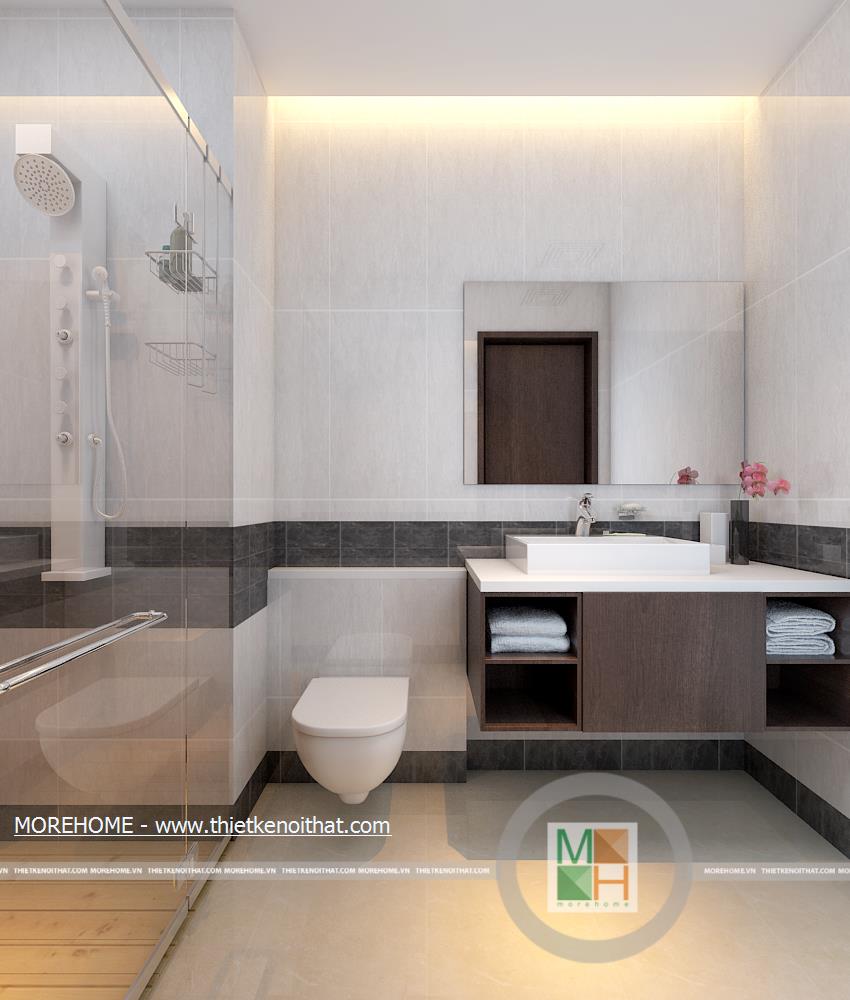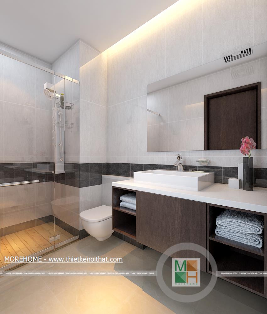 Phòng tắm của căn hộ được thiết kế thanh thoát và đầy đủ tiện nghi. Bồn tắm nằm và đứng đươc tích hợp trong cùng một không gian đem đến sự thư giãn tuyệt đối sau một ngày làm việc mệt mỏi.