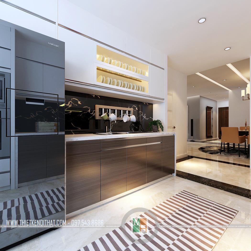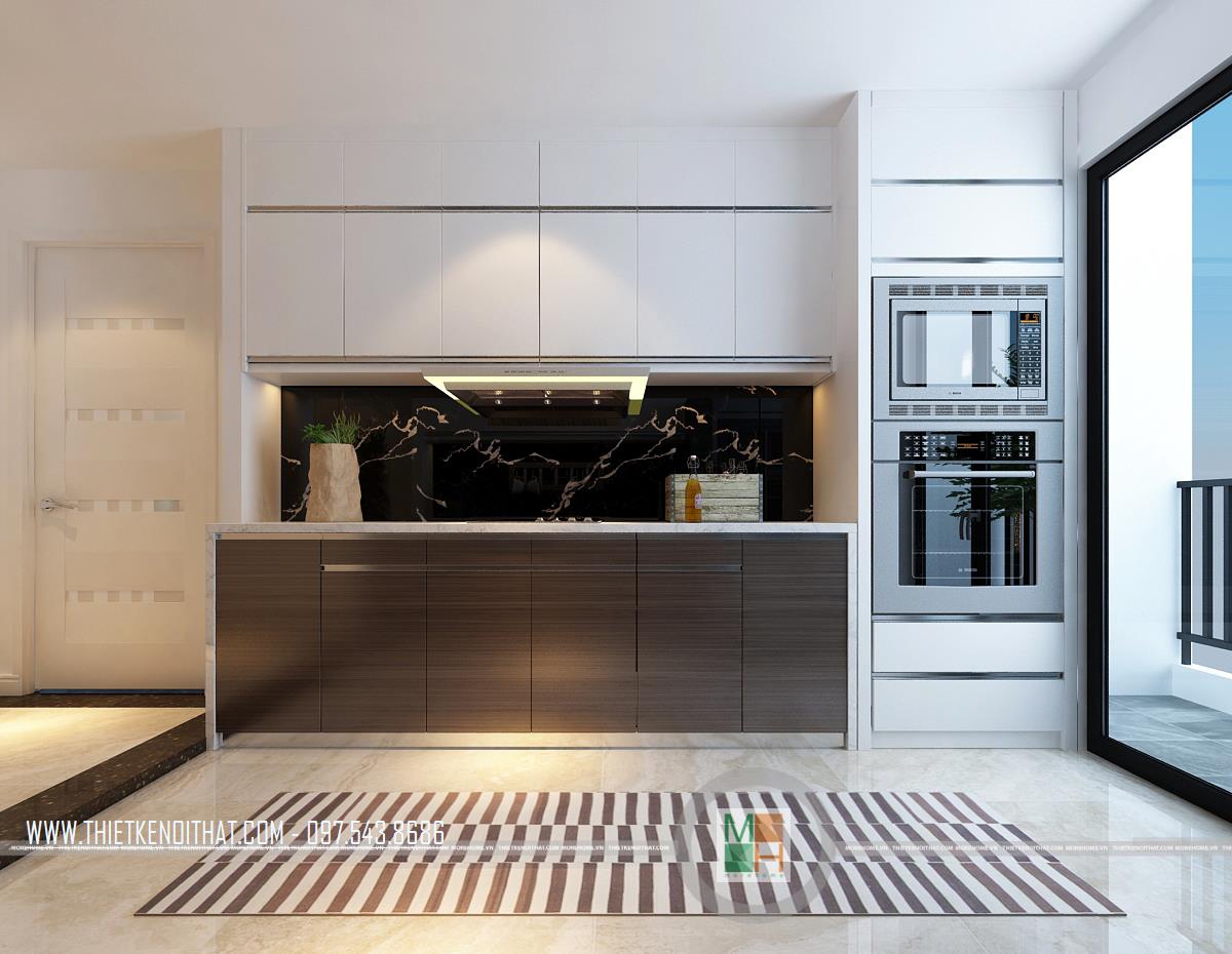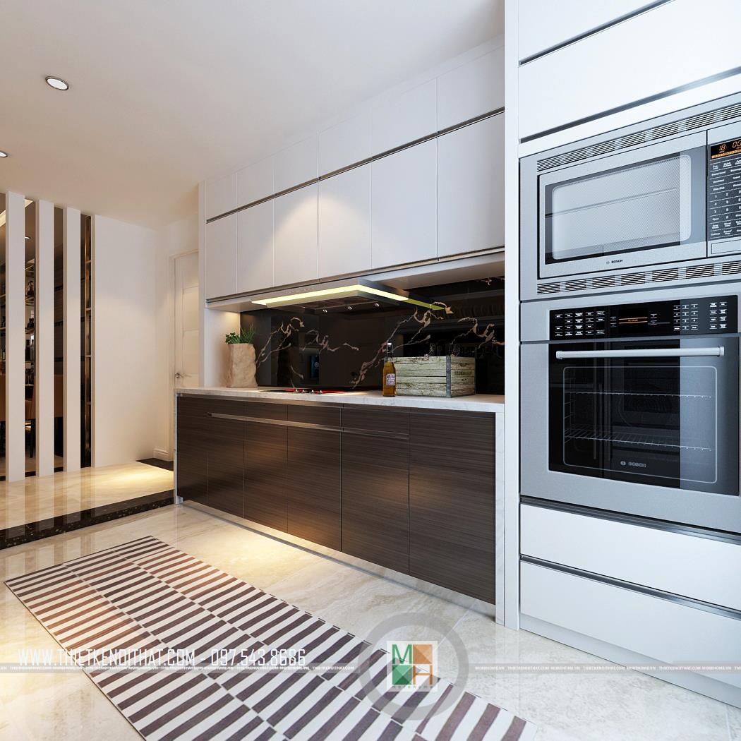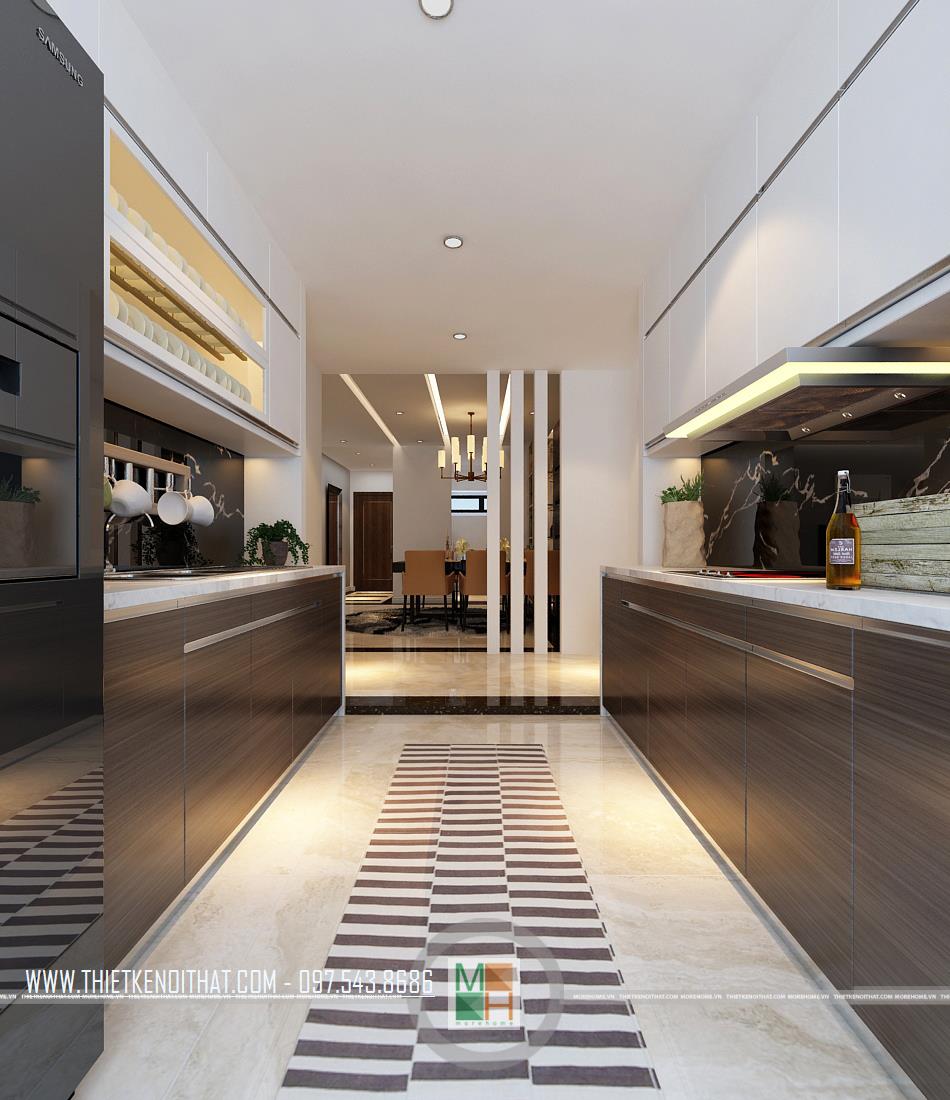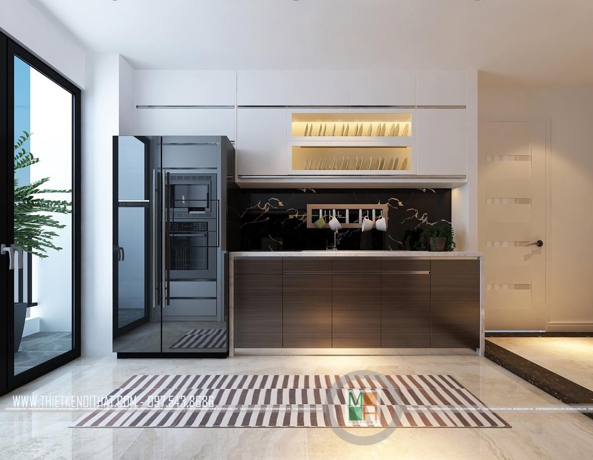 Bàn ăn và phòng bếp được thiết kế liên thông với nhau tạo không gian đồng nhất và thuận tiện cho gia chủ. Hệ thống gương, kính, ánh sáng và cả màu sắc kết hợp với nhau tạo sự tương phản vừa phải đem đến cho gia chủ cảm giác mới lạ, không nhàm chán mà vẫn định hình được phong cách thiết kế hiện đại, lịch lãm cho căn nhà.