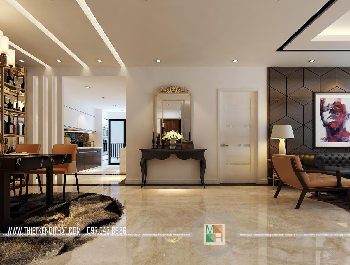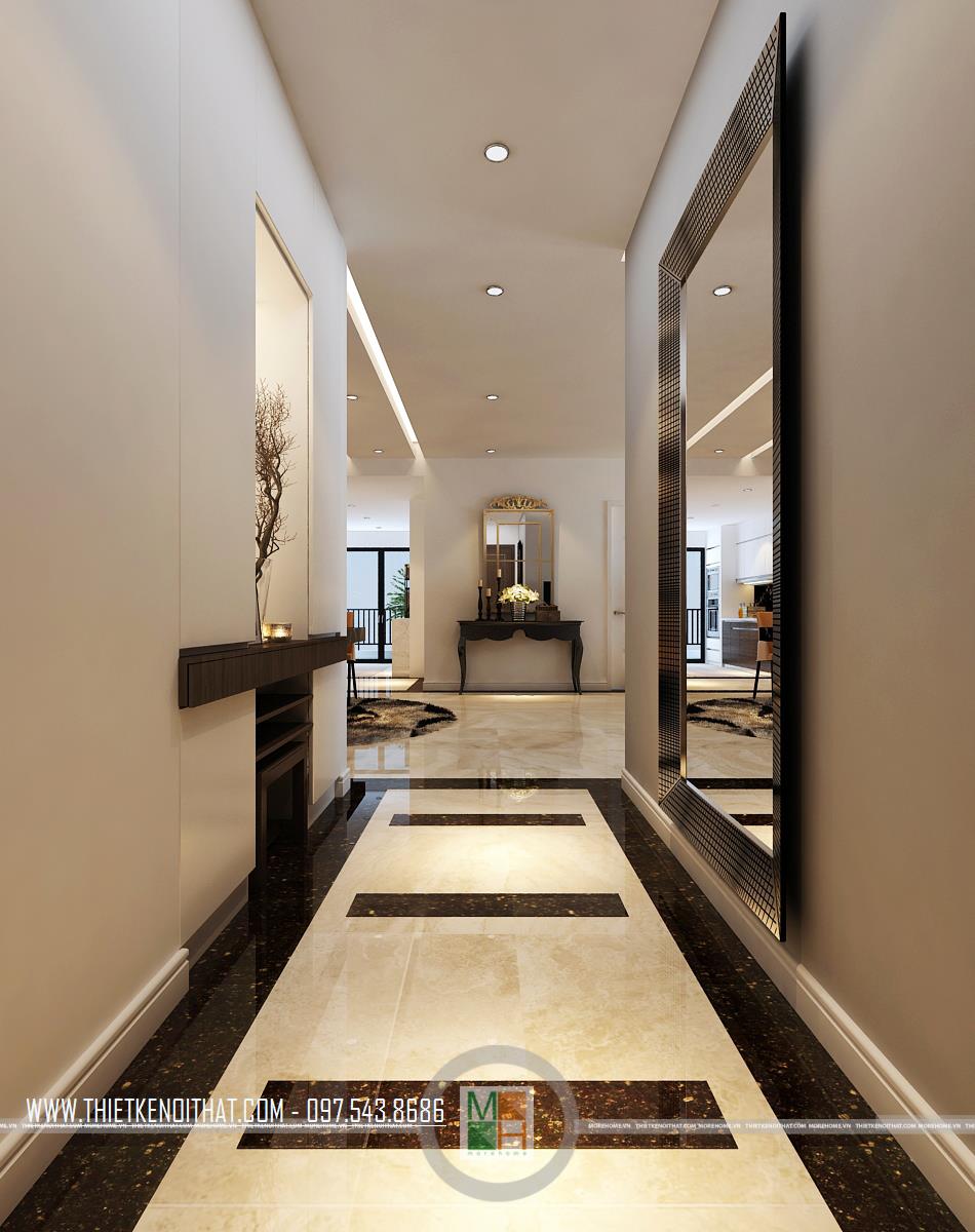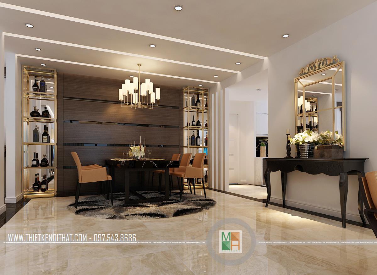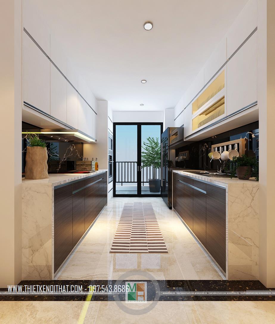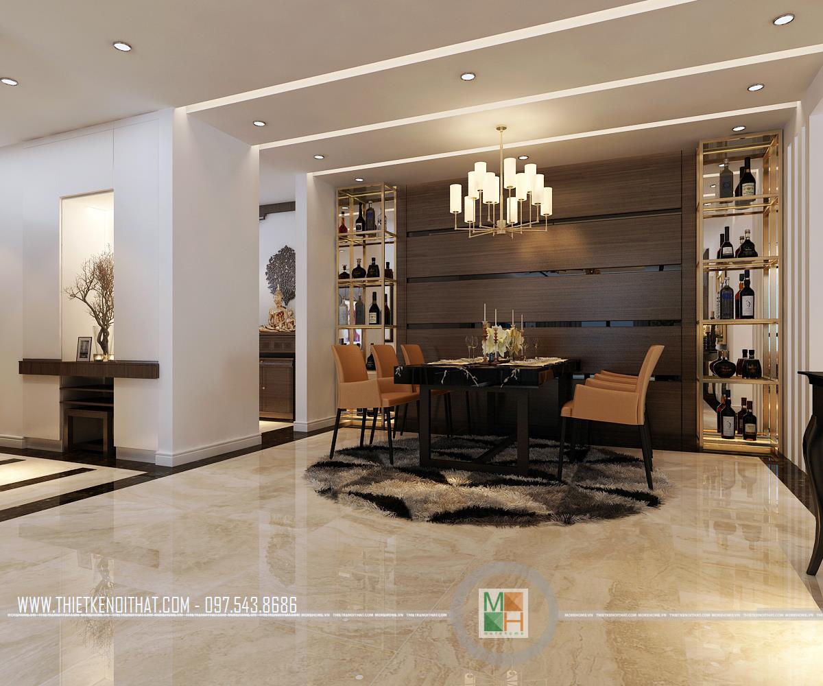 Bàn ăn và phòng bếp được thiết kế liên thông với nhau tạo không gian đồng nhất và thuận tiện cho gia chủ. Hệ thống gương, kính, ánh sáng và cả màu sắc kết hợp với nhau tạo sự tương phản vừa phải đem đến cho gia chủ cảm giác mới lạ, không nhàm chán mà vẫn định hình được phong cách thiết kế hiện đại, lịch lãm cho căn nhà.