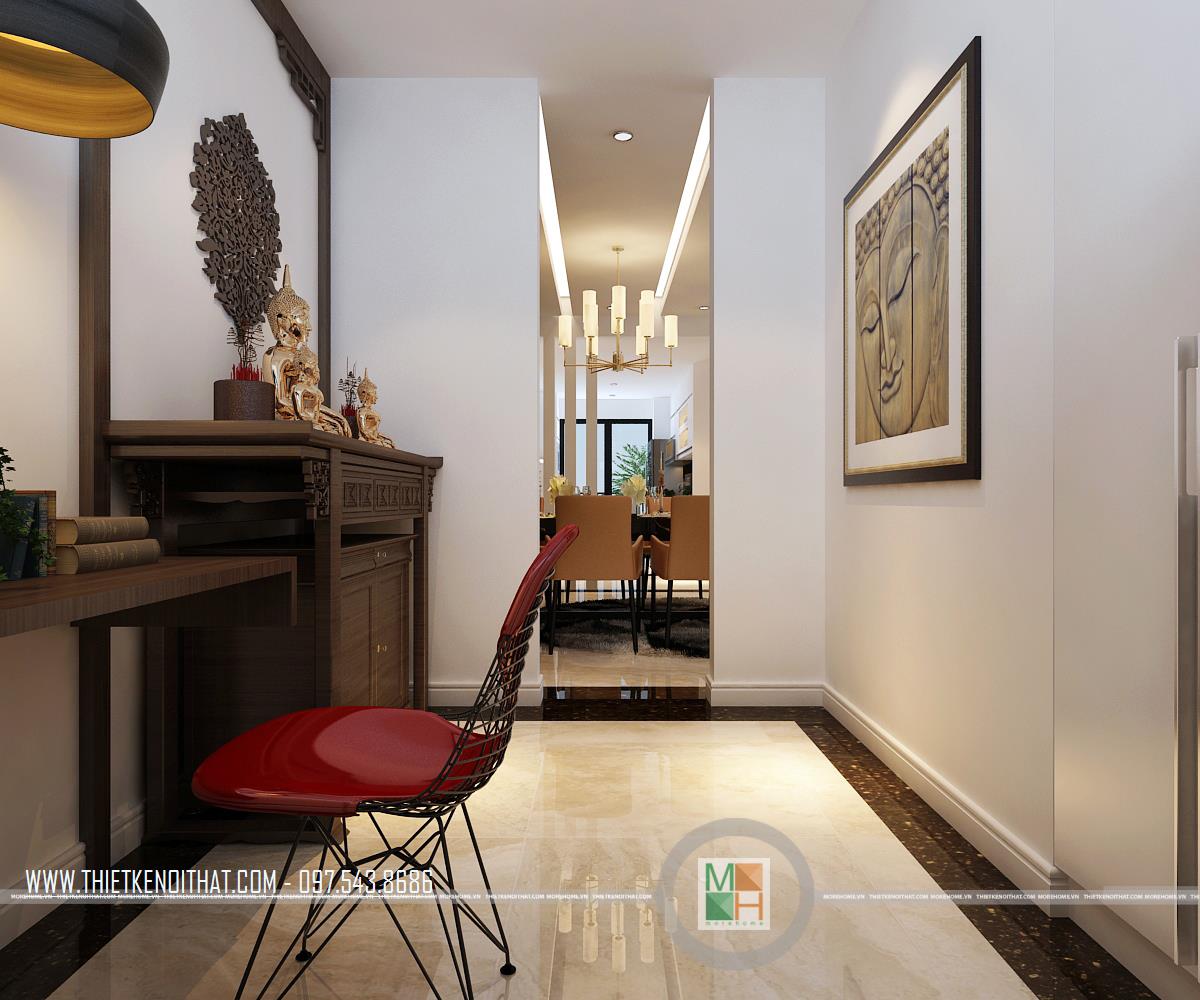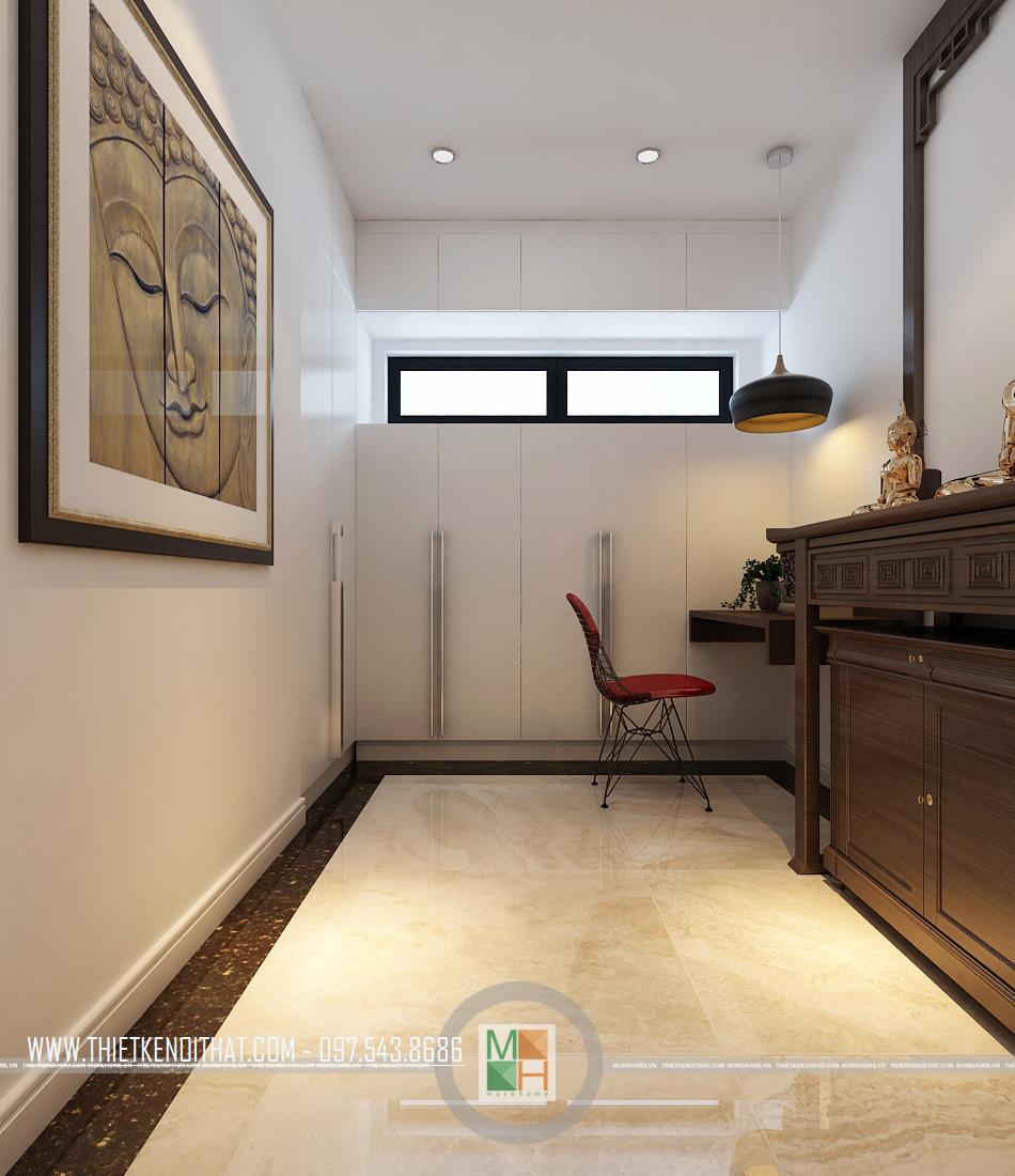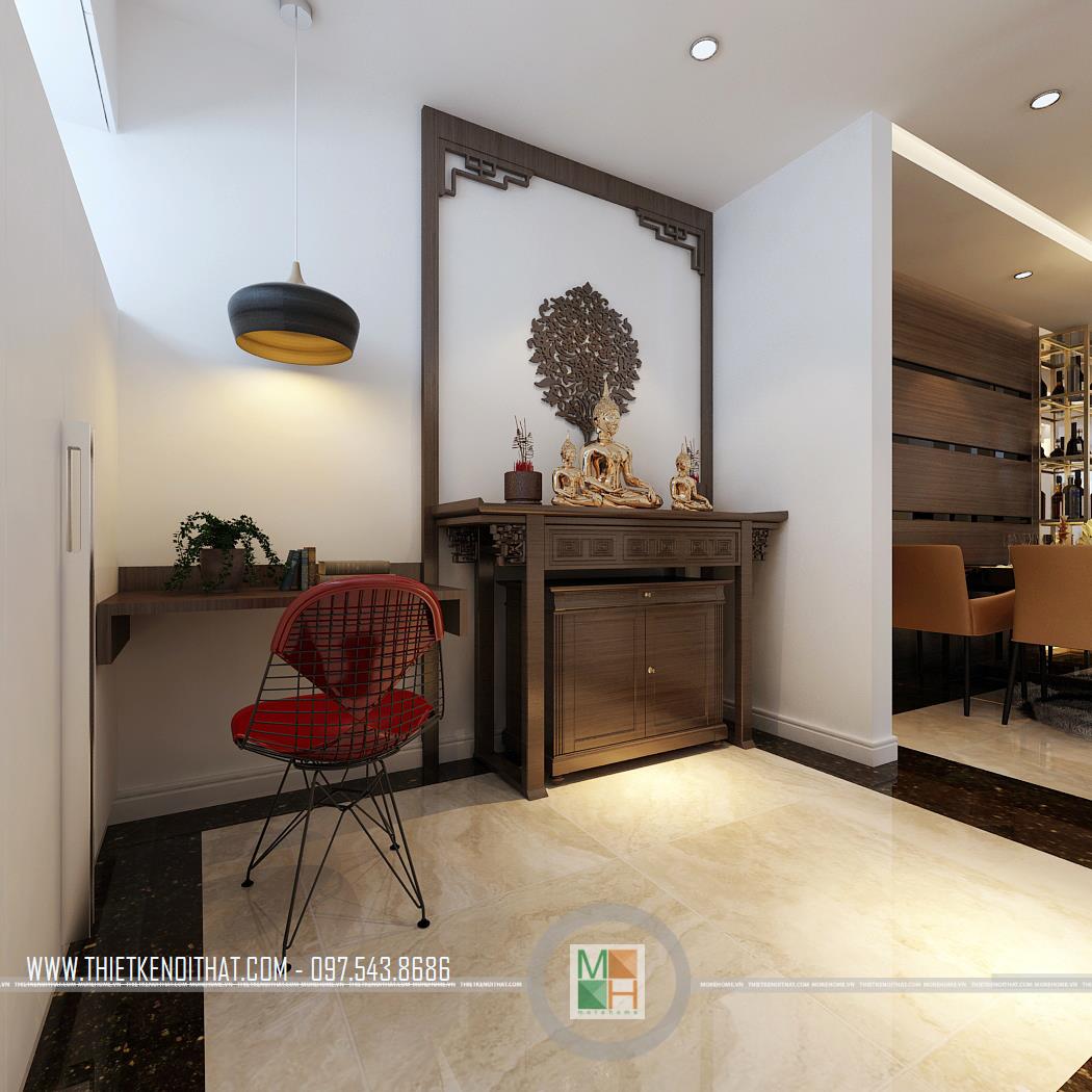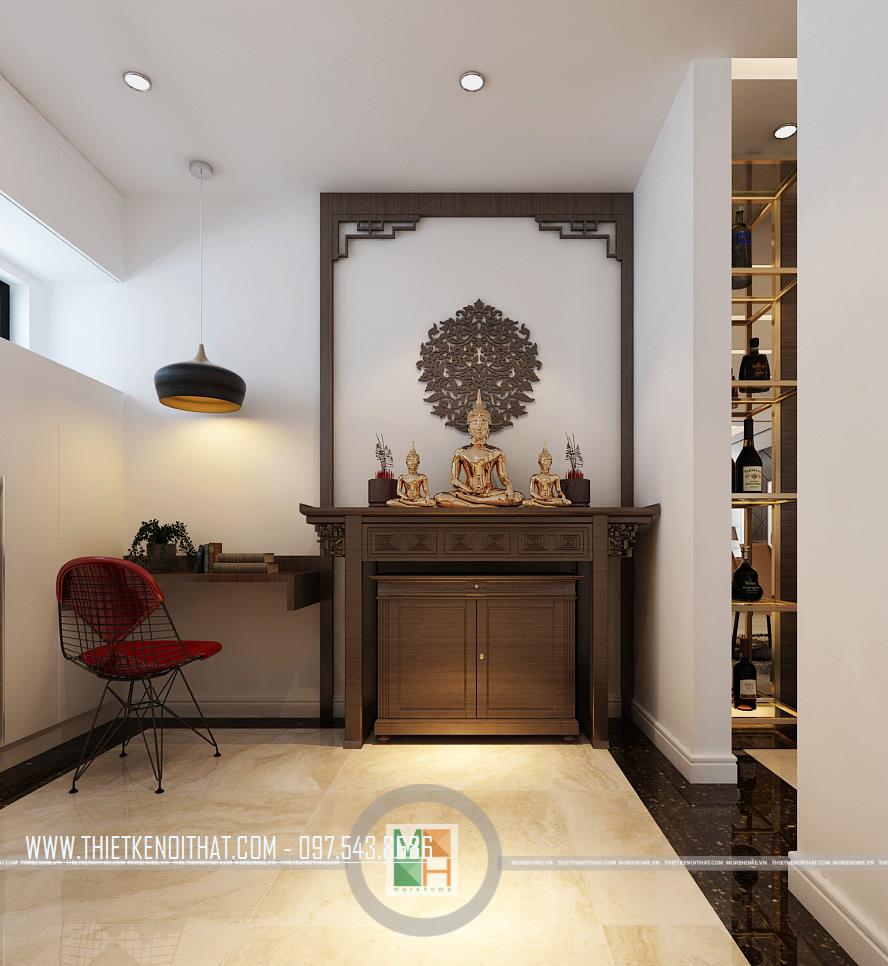 Một trong những không gian đem lại nhiều bất lợi nhất trong quá trình thiết kế chính là khu vực bàn thờ. Với đặc điểm diện tích hẹp và bị chia cắt, việc tìm một vị trí thích hợp về cả phong thủy và tiện nghi về không gian nhưng cũng đáp ứng tính thẩm mỹ là vô cùng khó khăn. Chính vì vậy, kiến trúc sư đã khéo léo sắp đặt phòng thờ ở một căn phòng nhỏ ngay gần bàn ăn, tạo ra một không gian tâm linh yên tĩnh trong căn nhà.