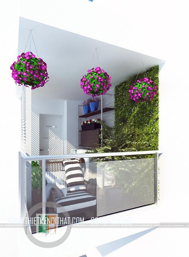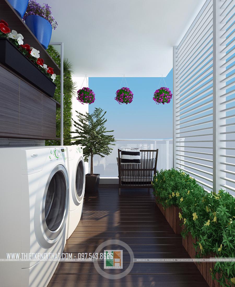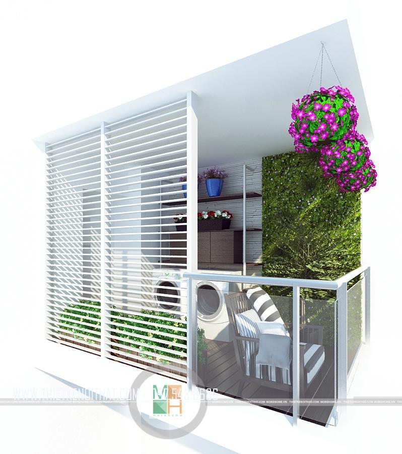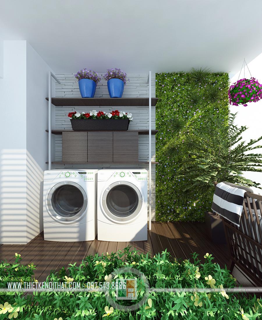 Một điểm nhấn trong căn nhà đó là thiết kế logia xanh độc đáo với hệ thống vườn đứng đầy sáng tạo. Không gian giặt giũ cũng được kết hợp và sắp xếp một cách gọn gàng. Một không gian xanh yên tĩnh và thanh bình cho gia chủ.