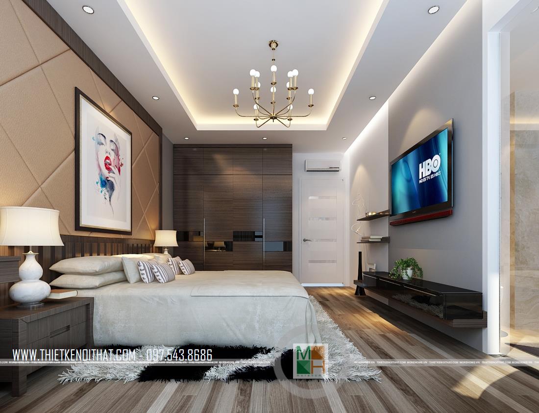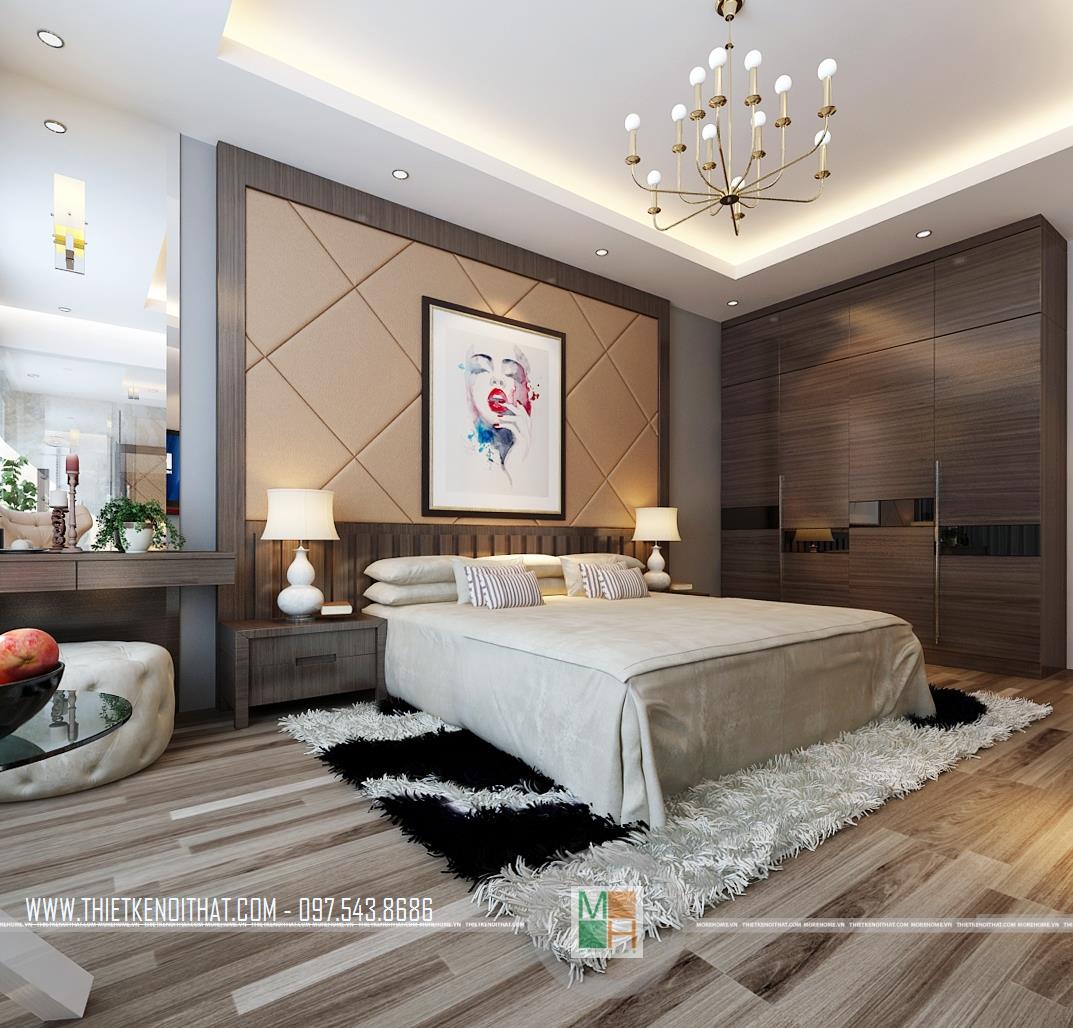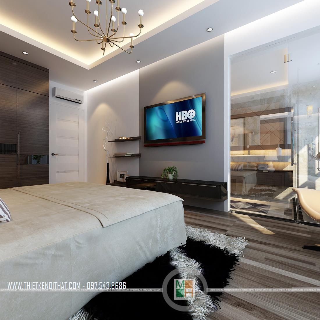 Phòng ngủ thứ nhất được thiết kế với gam màu nâu sáng và vàng nâu khá đồng nhất. Hệ thống tủ đựng đồ với thiết kế đơn giản và xếp đặt đồng nhất với tường tạo không gian riêng đầy tinh tế, đơn giản và sang trọng. Thiết kế nhà vệ sinh được sắp xếp khéo léo ngay trong căn phòng. Với ưu điểm về thời gian thi công, độ che phủ rộng, tính hiện đại và tiện dụng, kính cường lực đã được kiến trúc sư sử dụng làm cửa ngăn giữa phòng ngủ và nhà vệ sinh. Dù là vậy nhưng không gian riêng tư vẫn được đảm bảo.