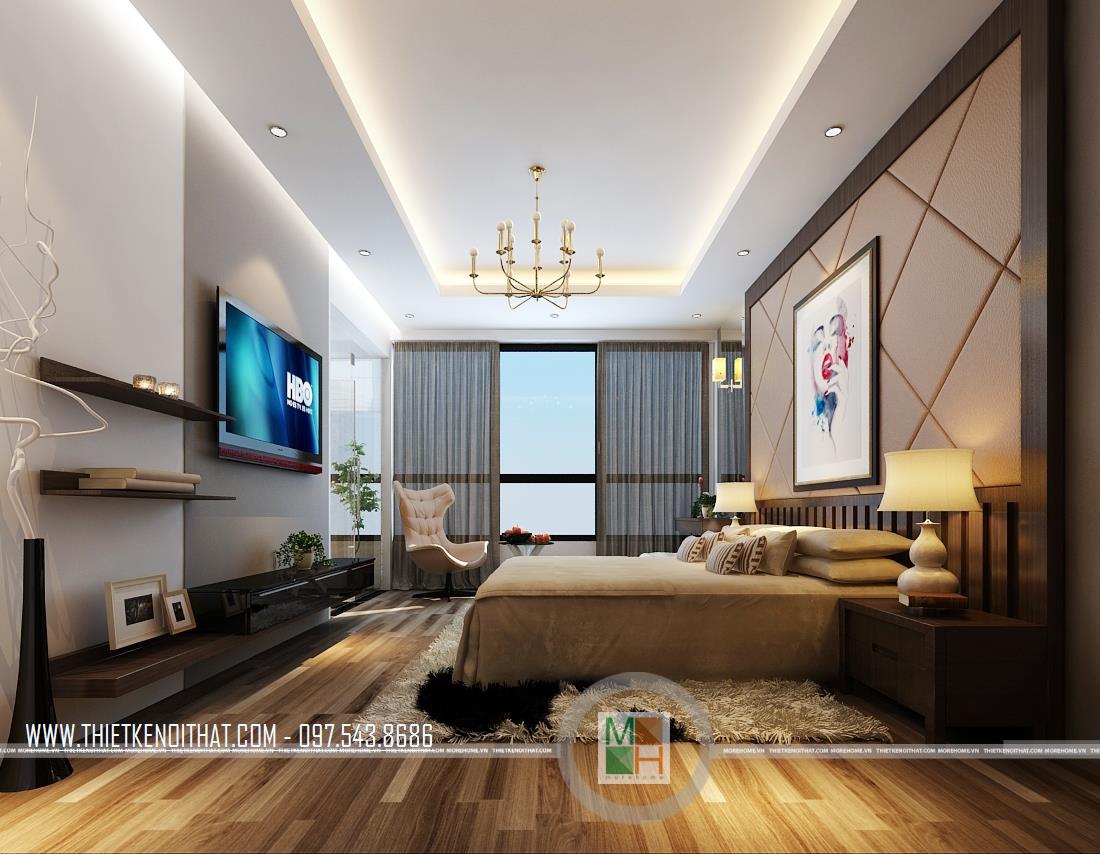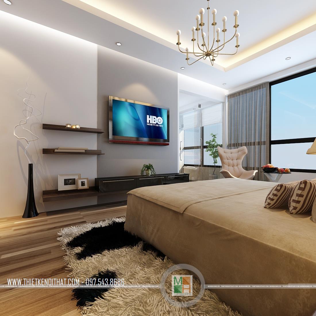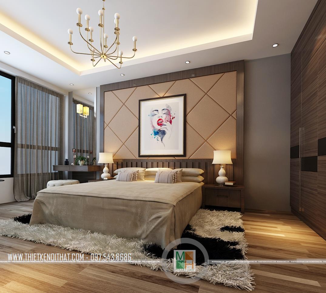 Phòng ngủ thứ nhất được thiết kế với gam màu nâu sáng và vàng nâu khá đồng nhất. Hệ thống tủ đựng đồ với thiết kế đơn giản và xếp đặt đồng nhất với tường tạo không gian riêng đầy tinh tế, đơn giản và sang trọng. Thiết kế nhà vệ sinh được sắp xếp khéo léo ngay trong căn phòng. Với ưu điểm về thời gian thi công, độ che phủ rộng, tính hiện đại và tiện dụng, kính cường lực đã được kiến trúc sư sử dụng làm cửa ngăn giữa phòng ngủ và nhà vệ sinh. Dù là vậy nhưng không gian riêng tư vẫn được đảm bảo.