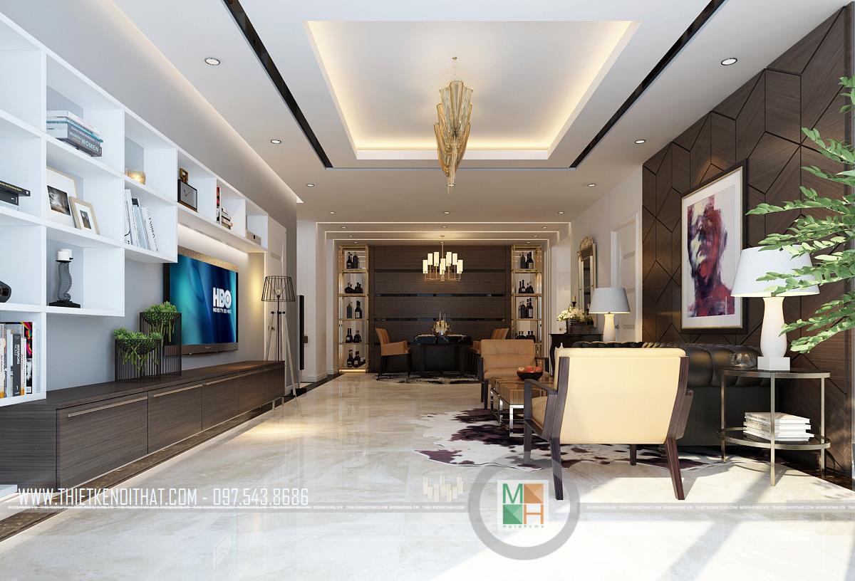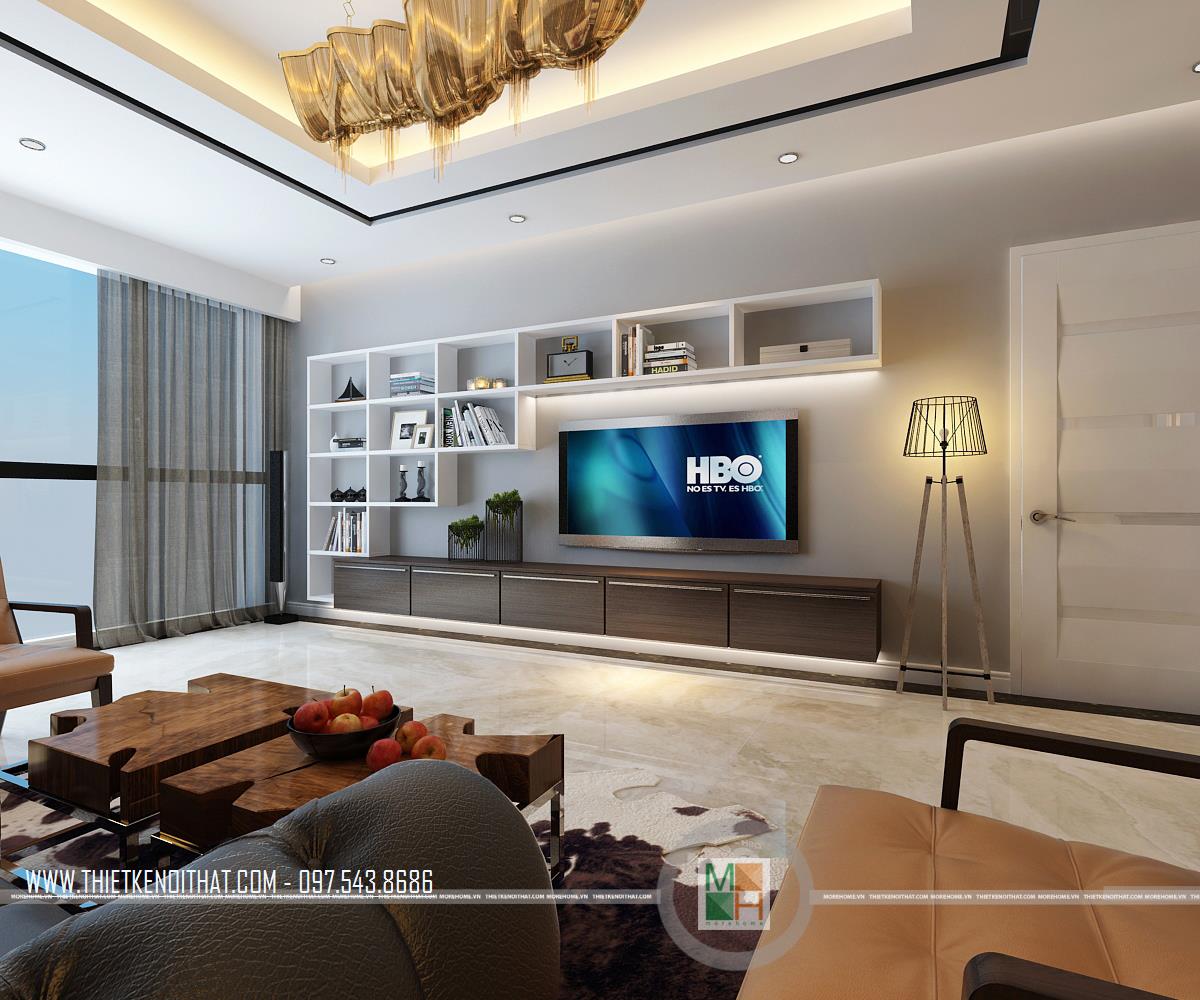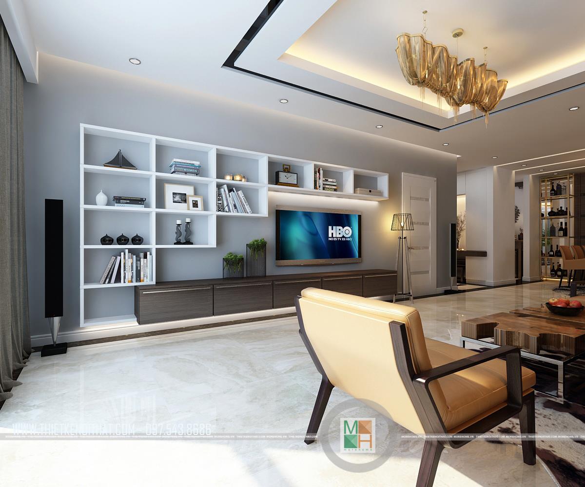 Với mong muốn đem lại sự tiện nghi tối đa cho căn phòng, kiến trúc sư đã khéo léo thiết kế một tủ sách đặt ngay phía trên tivi. Chính những sự kết hợp này đã tạo ra một không gian tiếp đón và sinh hoạt chung thật ấm cúng và tinh tế.