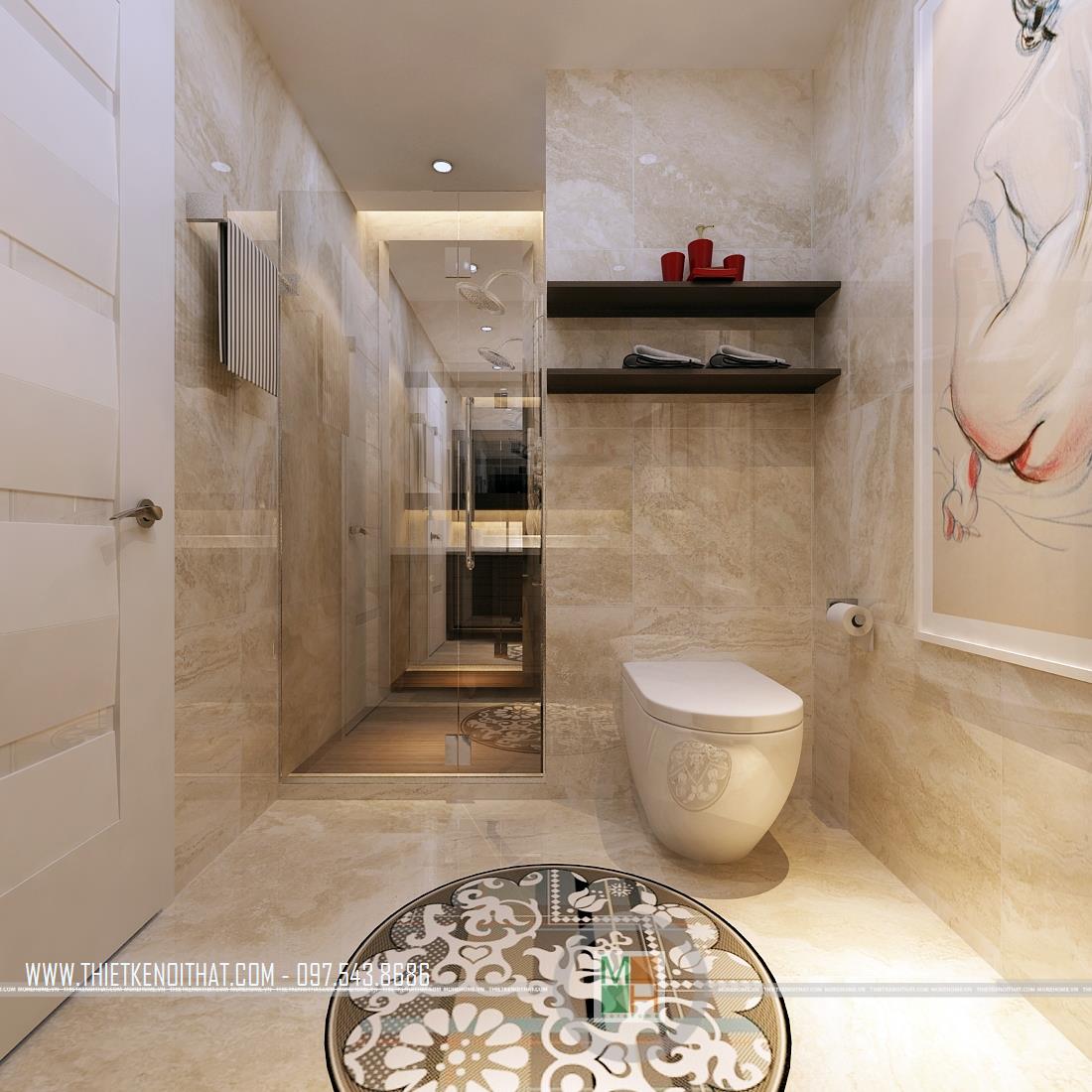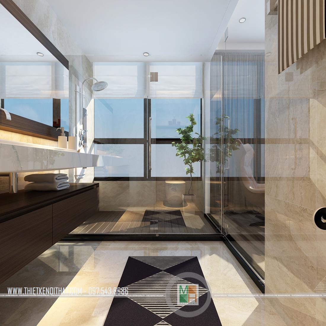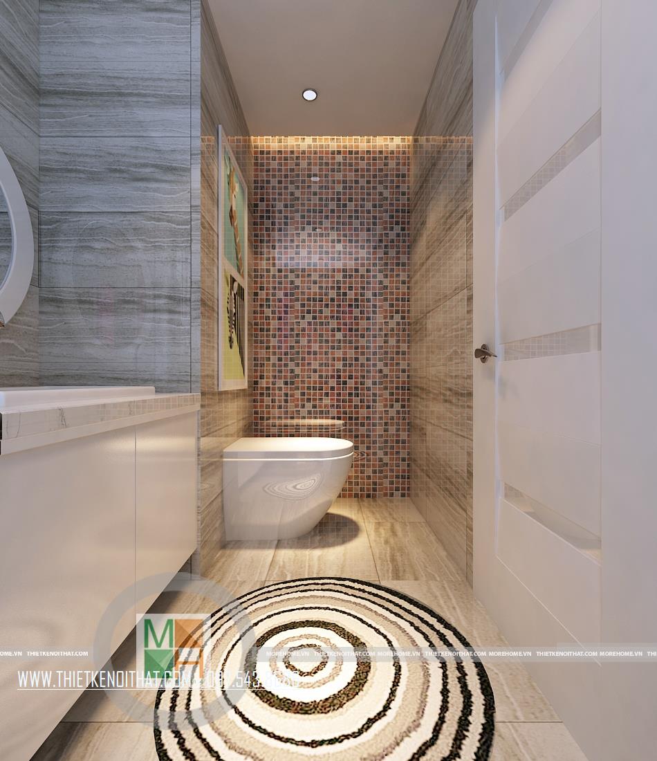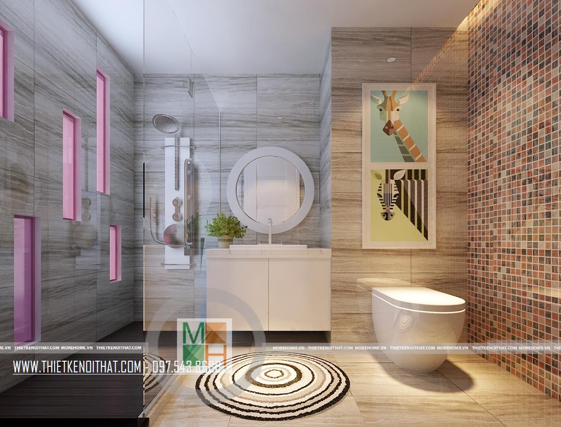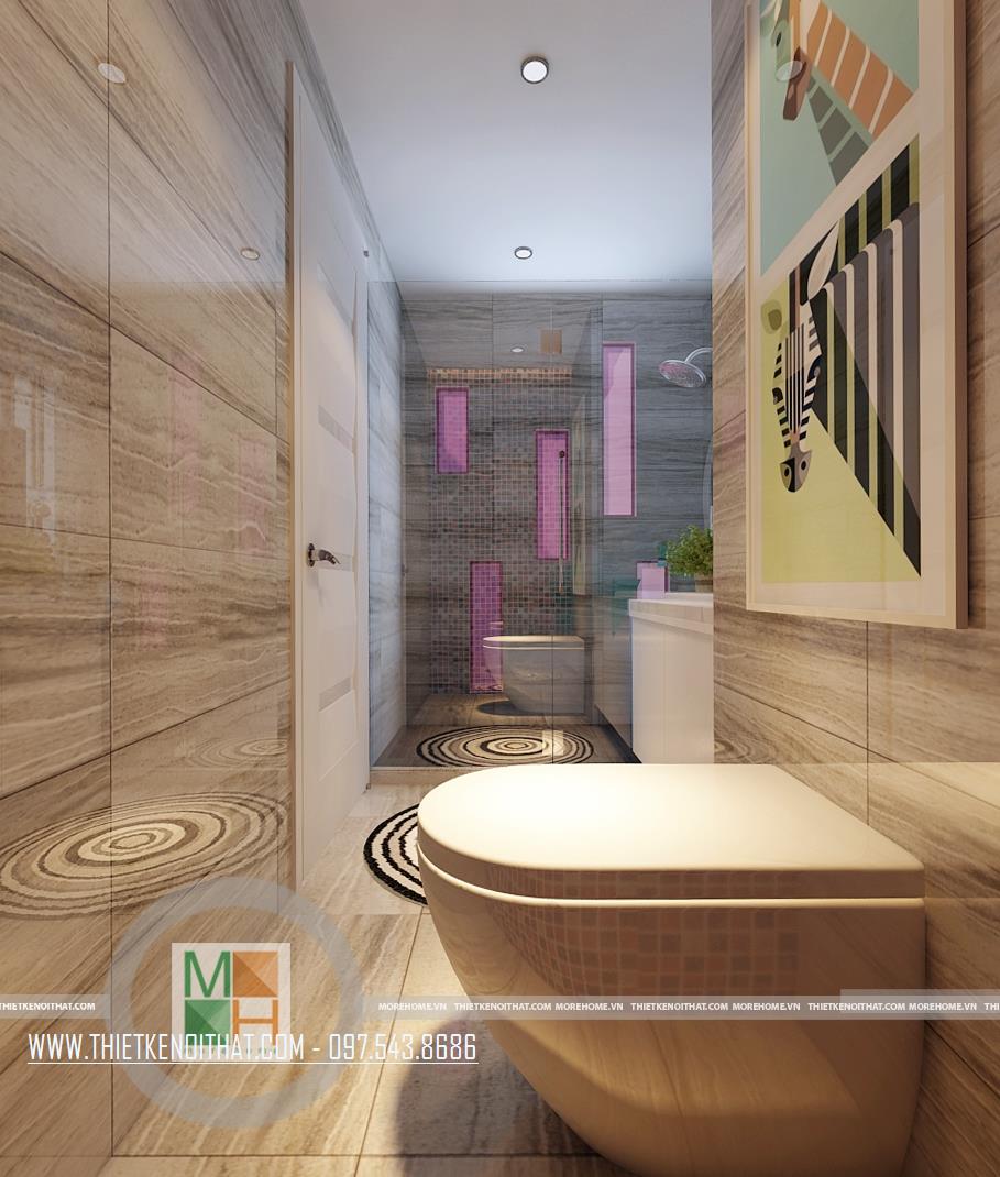 Cuối cùng đó là khu phòng tắm, nhà vệ sinh với thiết kế nội thất hướng tới trẻ trung, hiện đại với các vách ngăn bằng kính, trang trí hoa văn và kệ tủ giúp nới rộng thêm không gian và tạo sự ngăn nắp, tiện nghi.
