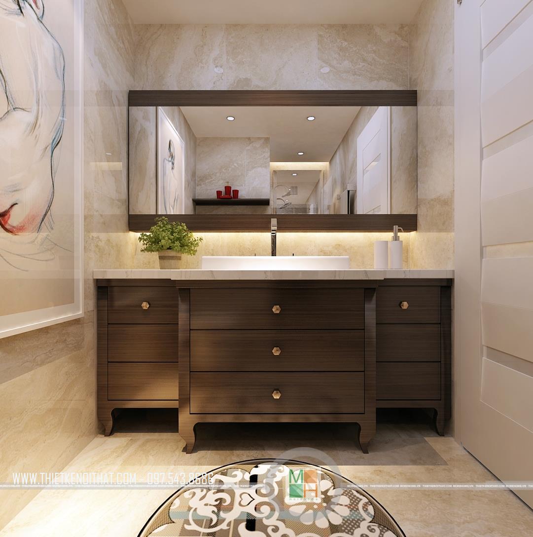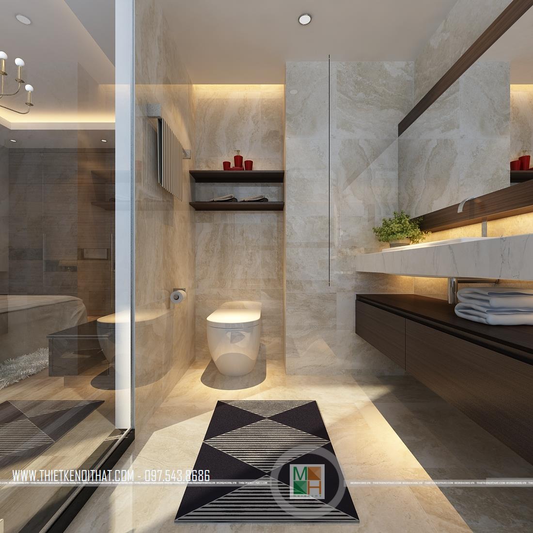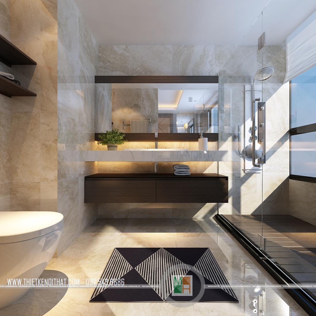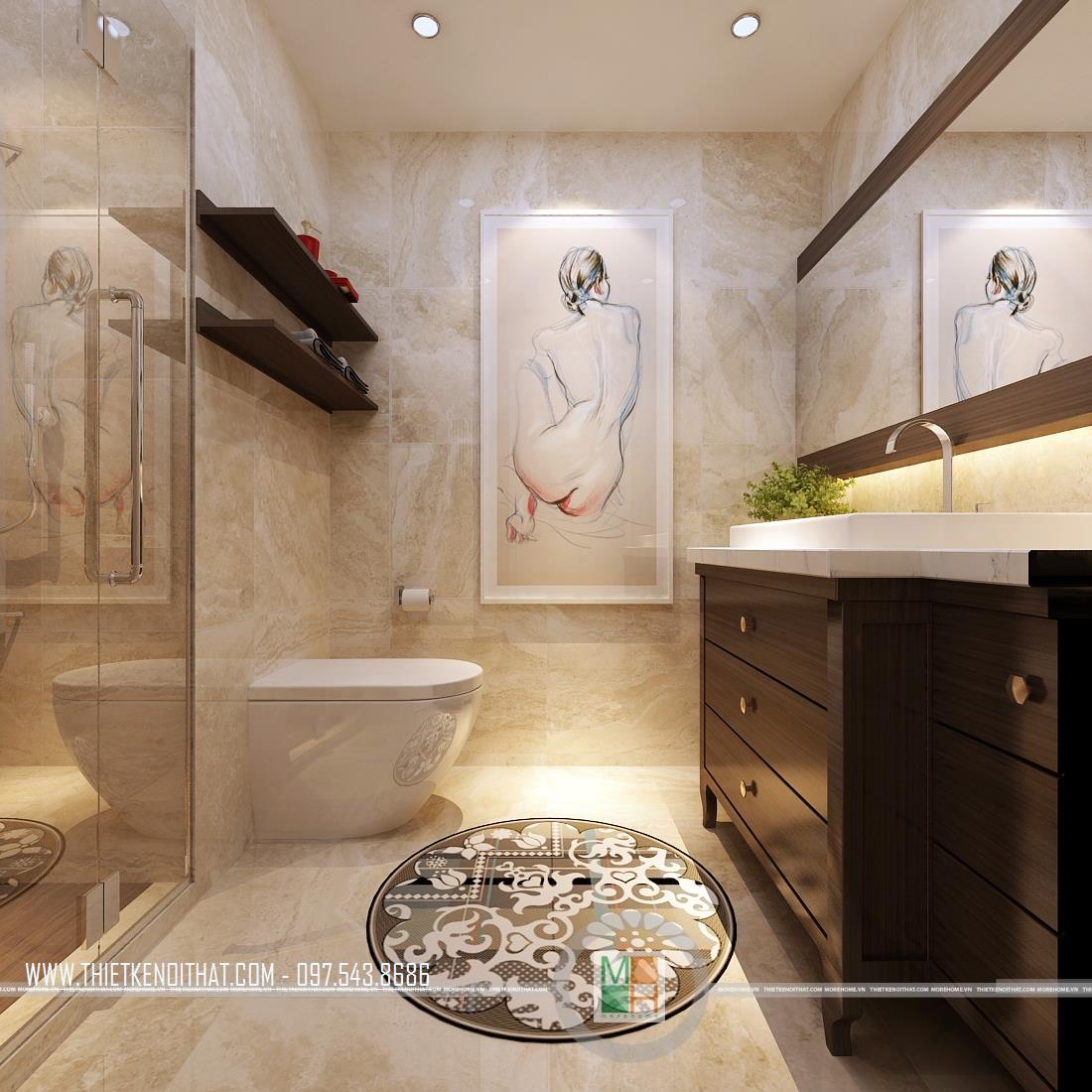 Cuối cùng đó là khu phòng tắm, nhà vệ sinh với thiết kế nội thất hướng tới trẻ trung, hiện đại với các vách ngăn bằng kính, trang trí hoa văn và kệ tủ giúp nới rộng thêm không gian và tạo sự ngăn nắp, tiện nghi.