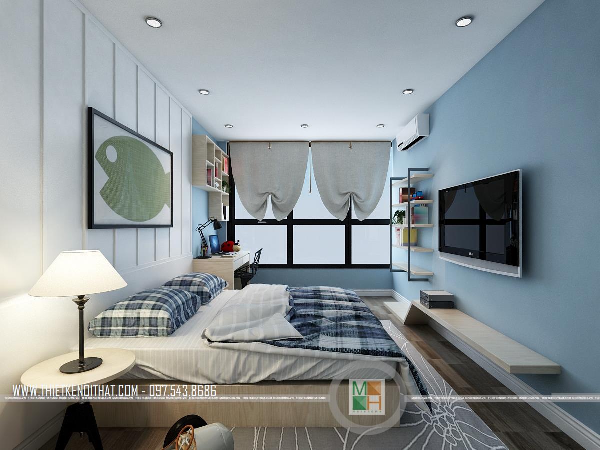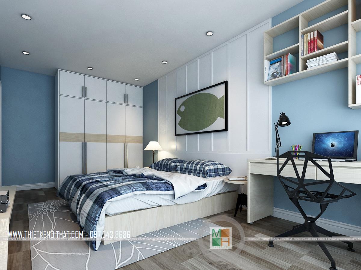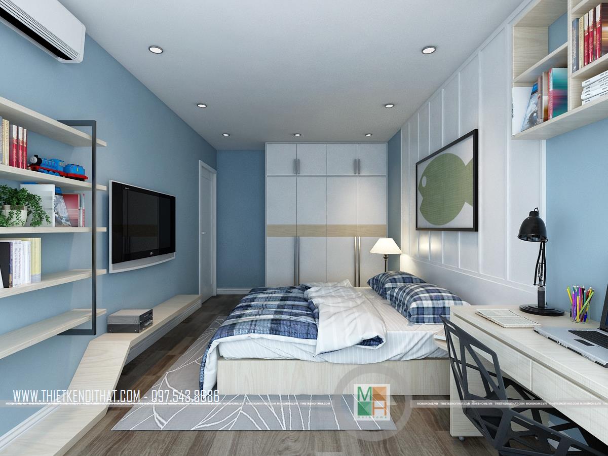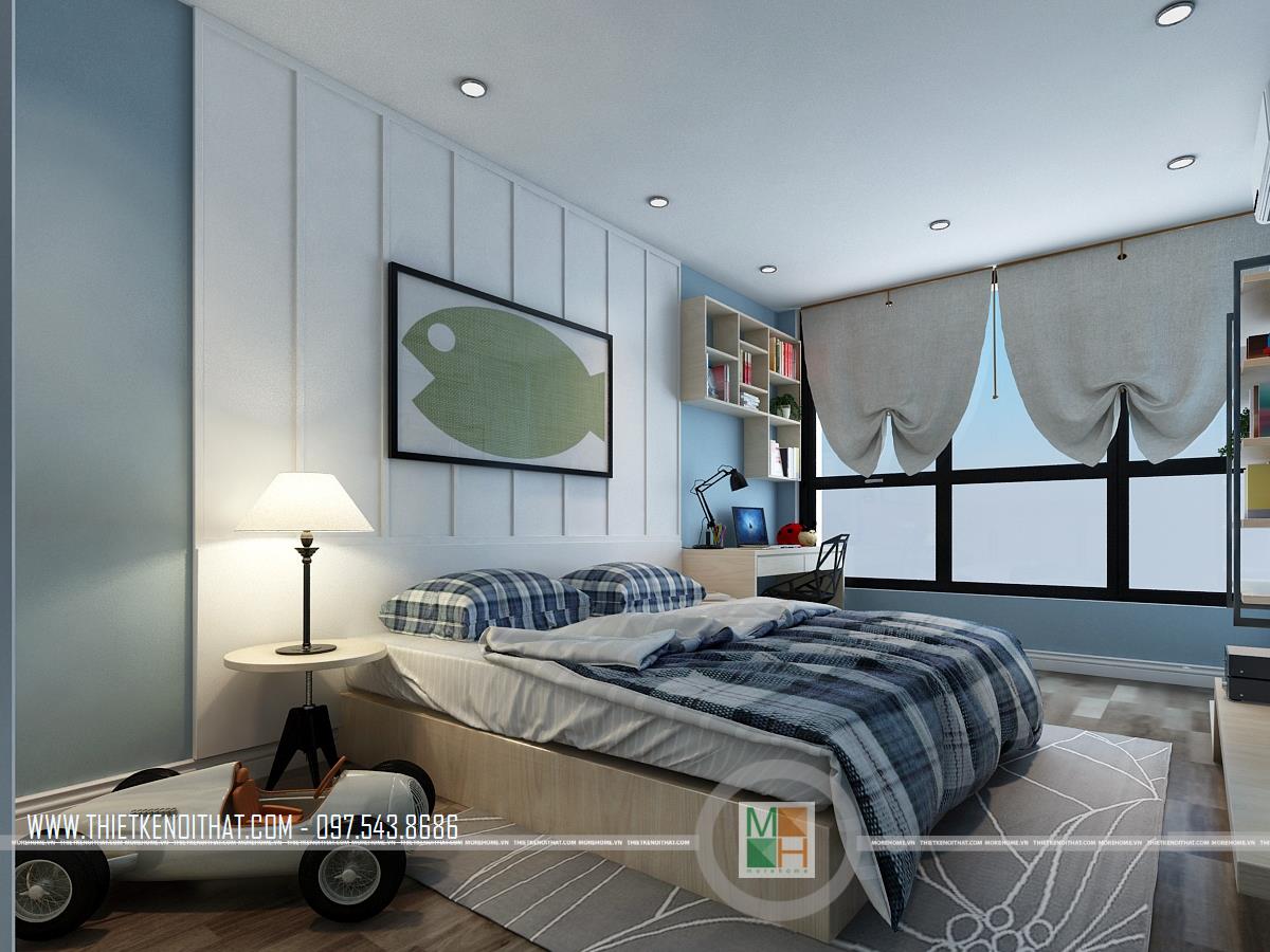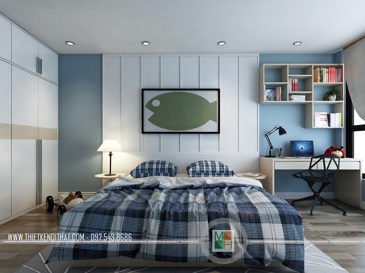 Phòng ngủ thứ hai với thiết kế màu sắc khá năng động giúp gợi mở khả năng sáng tạo và kích thích trí tò mò của trẻ. Sắc xanh tràn ngập phòng kết hợp với ánh sáng vừa đủ tạo nên sự đồng nhất và tinh tế cho căn phòng. Hệ thống tủ và kệ được sắp đặt hợp lý mang lại tiện nghi cho gia chủ.