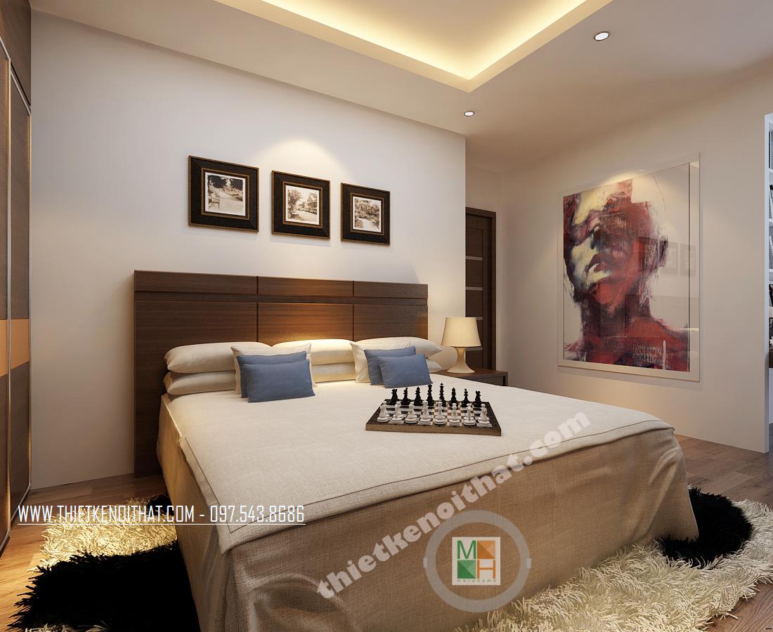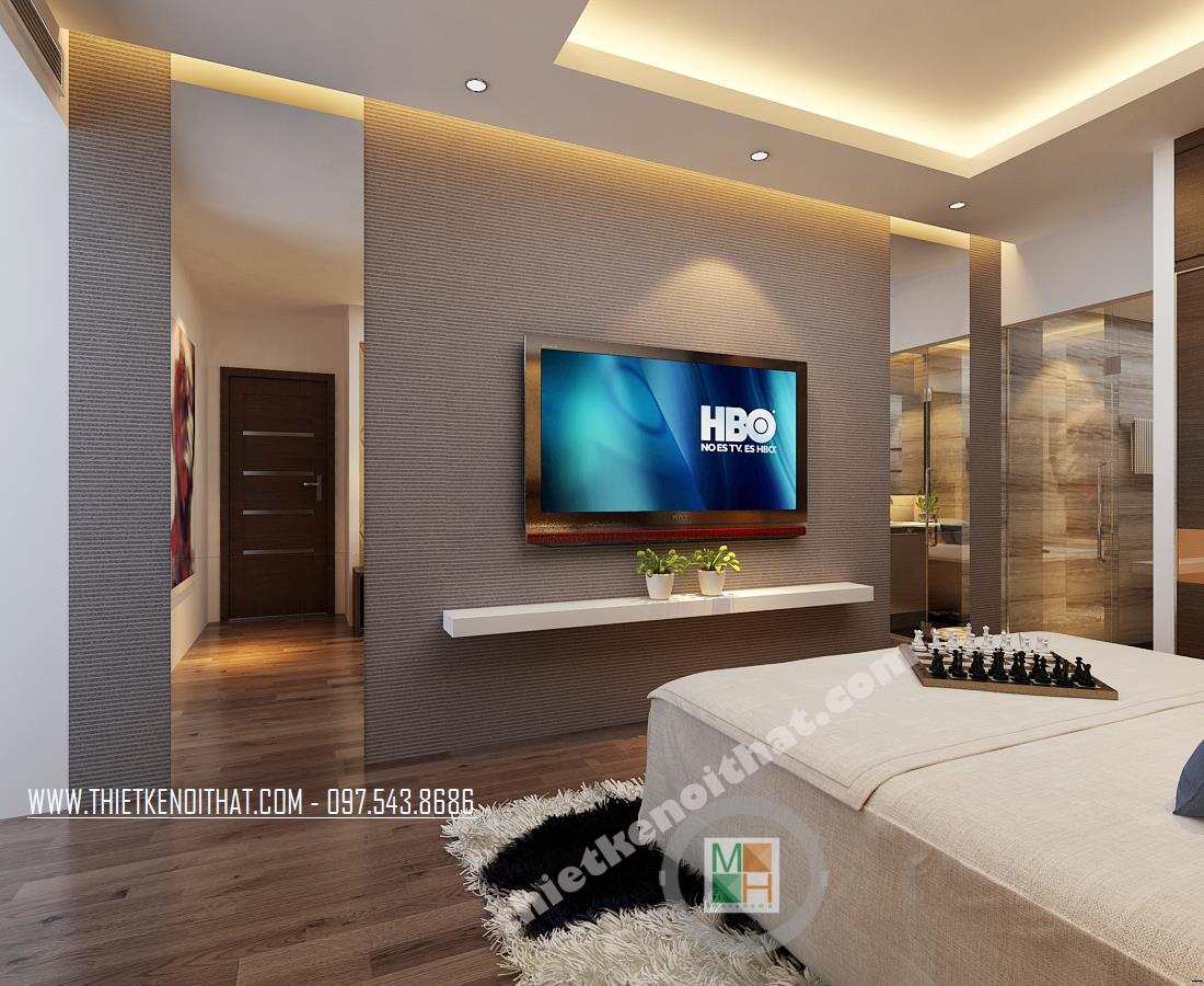 Phòng ngủ cũng với thảm lông trải sàn song sử dụng tông màu trầm ấm tạo cám giác dễ chịu và ấm cúng cho căn phòng. Hệ thống đèn được khéo léo đưa vào các hốc tường trần nhà và phân bổ đều giúp ánh sáng phân tán và gia chủ không bị lóa mắt mỗi khi đèn bật. Tranh tường lạ và thiết kế chậu cây nhỏ xinh dưới TV giúp ngôi nhà thêm phần thiên nhiên.