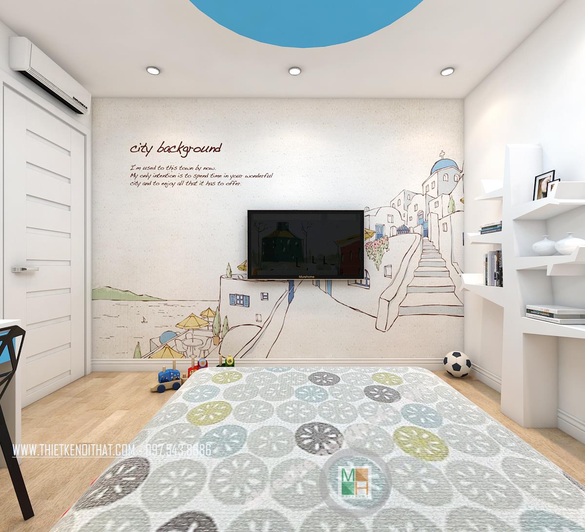 Phòng ngủ của bé gần như tách biệt với không gian lịch lãm, tinh tế ngòa kia mà hòa với sắc xanh và tường vẽ tạo nên không khí sáng tạo kích thích trí tưởng tượng của trẻ nhỏ. Các chi tiết phụ như giá để sách hay ghế cũng được thiết kế lạ mắt kích thích trẻ tư duy và phát triển.