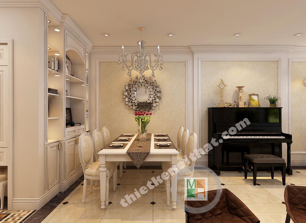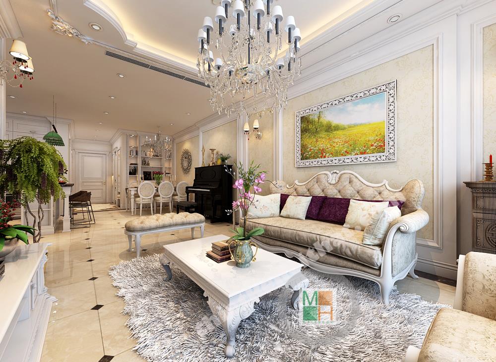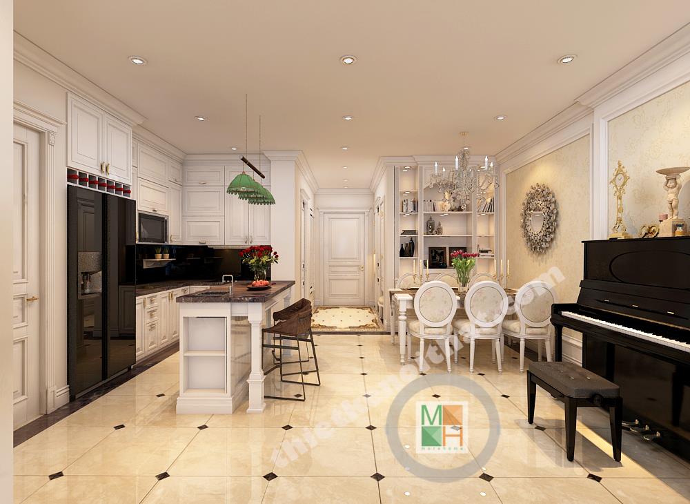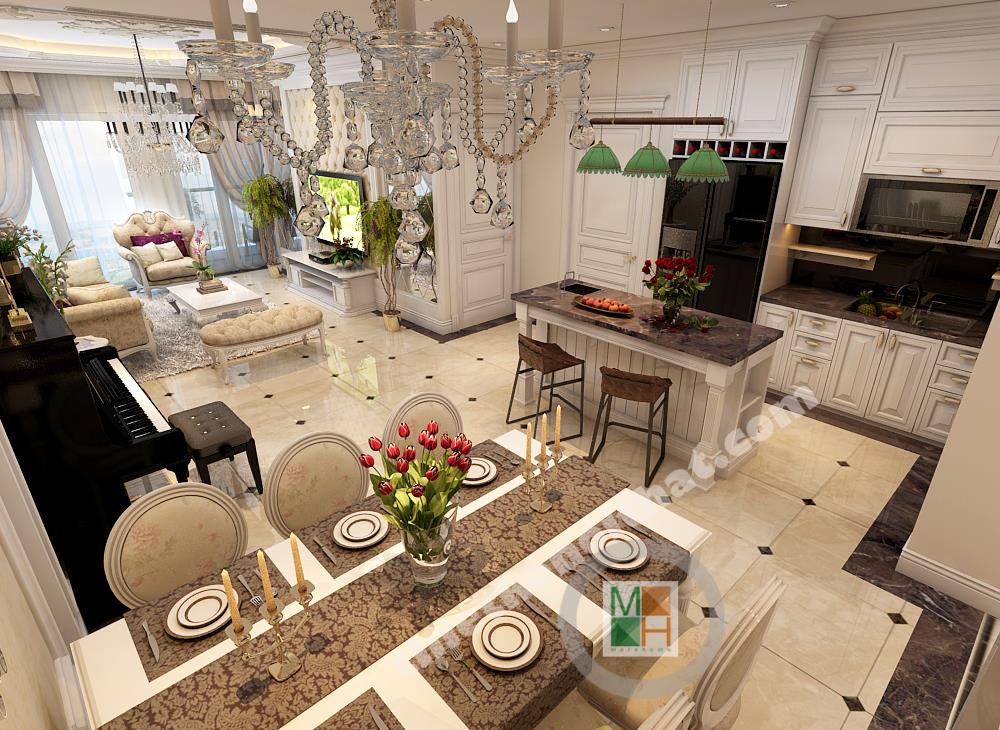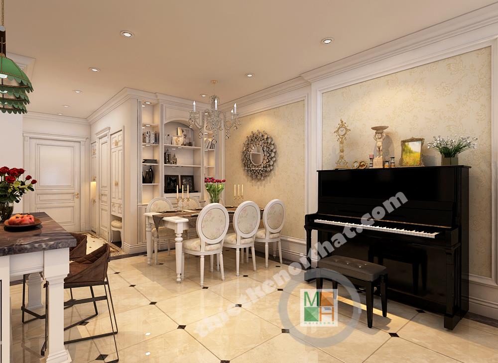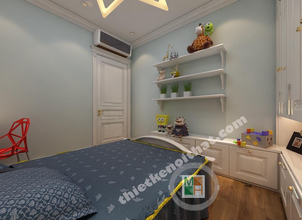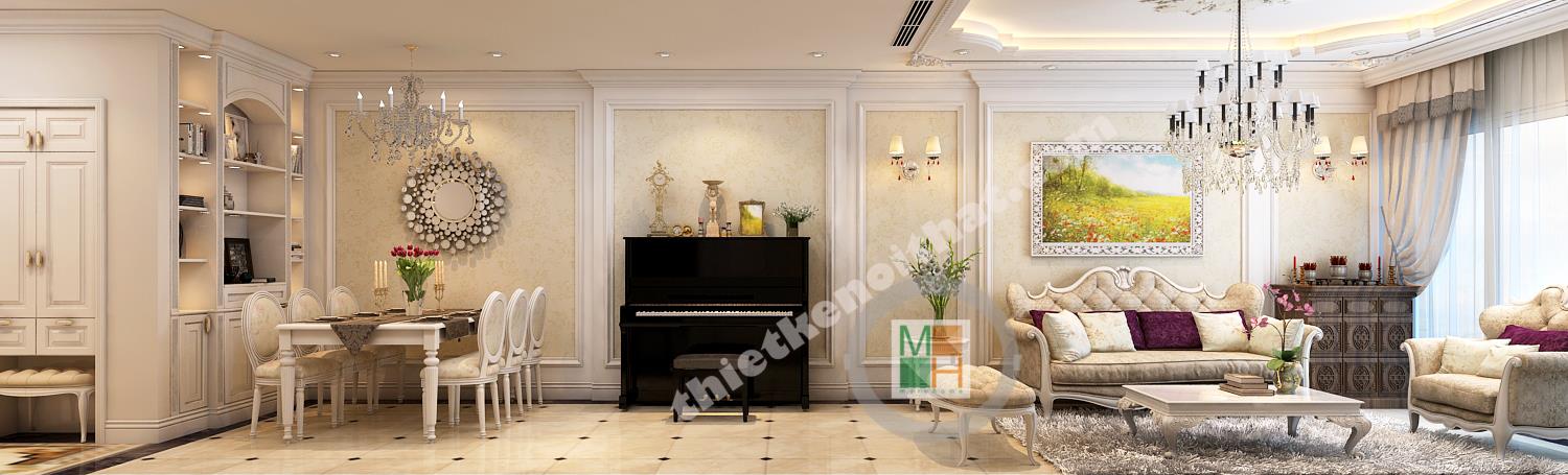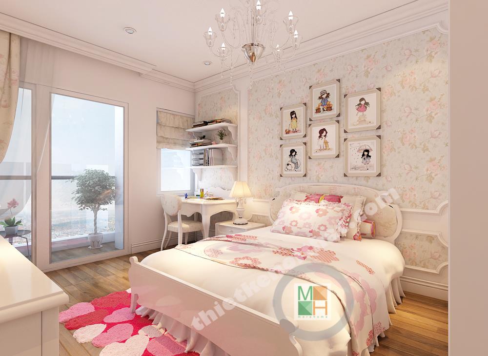 Ban công: Căn hộ nằm ở một vị trí khá cao của tòa nhà, do đó view rất rộng và đẹp. Nắm rõ điều này, các nhà thiết kế đã tận dụng đó để làm một thế mạnh cho ban công của căn hộ. Ban công không quá rộng, tuy nhiên lan can được thiết kế hoàn toàn bằng kính cường lực đã giúp cho tầm nhìn và không gian từ ban công dường như không có giới hạn. Để tạo được độ chịu lực cao cho vách kính của ban công thì khung đỡ kính, giá thép là những gì cần phải có. Tuy nhiên ở đây, những thiết kế giá thép cũng như khung đỡ kính được tối giản hết sức mà vẫn đủ độ vững, tạo sự thẩm mỹ cần phải có để tôn lên sự sang trọng của thiết kế kính này. Tổ hợp phòng khách – phòng bếp không được tách biệt mà nằm trong cùng một không gian khá rộng. Đây là nơi được coi là điểm nhấn trong thiết kế tân cổ điển của căn hộ. Phòng khách: Diện tích rộng và thiết kế theo lối không gian mở càng khiến căn phòng càng rộng hơn. Sự sang trọng của căn phòng đáng để nói đến đầu tiên đó là màu gạch lát. Màu gold nhẹ với những đường vân đá luôn tạo được sự sang trọng và quý phái, đồng thời việc phối màu nội thất với màu gạch cũng rất được chú ý. Toàn bộ nội thất của căn phòng đều được đi theo một phong cách đó là phong cách nội thất của Pháp cổ điển. Salon lớn, thảm lông lớn với những đường cong mềm mại và màu trắng pha vàng sâm panh là đặc trưng của lối kiến trúc này. Đối diện sô pha lớn là vách ngăn được trang trí bằng tấm đệm simili tán âm, đồng thời cũng là một chi tiết trang hoàng cho căn phòng. Màn hình TV lớn ốp tường, phía dưới là kệ nhỏ để các thiết bị điện tử, giải trí. Đèn chúm lớn khá nhiều chi tiết nhưng không hề rối mắt mà càng tôn thêm vẻ sang trọng cho căn phòng. Ánh sáng của căn phòng được cung cấp bởi đèn chúm lớn và hệ thống đèn mắt trâu ốp trần, đèn hắt trần và đèn ốp tường. Ngoài ra, để có được lượng ánh sáng tự nhiên nhiều nhất thì cửa sổ của căn phòng được thiết kế gần như hoàn toàn bằng kính. Kính tạo nên sự hiện đại còn rèm cửa lại tạo nên sự quý phái đặc trưng của lối kiến trúc này. Nổi bật trong căn phòng với tông trắng – vàng là chiếc piano đen quý phái. Đây là một điểm gây chú ý trong kiến trúc nội thất của căn phòng. Nó vừa là để tô điểm cho căn phòng, vừa là khoảng giao giữa khu vực phòng khách và khu vực bếp – phòng ăn. Gian bếp: Mặc dù có một không gian khá rộng nhưng để mọi thứ được gọn gàng và trật tự hơn thì các nhà thiết kế đã đưa vào một hệ thống tủ ốp tường cho gian bếp. Hệ thống tủ này vẫn là những chiếc tủ theo lối nội thất Pháp cổ với màu trắng sang trọng, được lắp lên gần như toàn bộ diện tích tường của khu bếp. Những không gian trống được tận dụng tối đa như là khoảng trống dưới tủ có thể cất một chiếc ghế nhỏ hoặc để những vật dụng nhỏ trong nhà bếp hoặc để các đồ trang trí. Do đó căn phòng rất gọn gàng và sắp xếp rất khoa học. Hệ thống bếp chìm mặt đá đen sang trọng, màu đen nổi hẳn lên tông trắng của bộ tủ. Tủ lạnh 2 cánh lớn màu đen được đặt chìm vào trong bộ tủ tường cũng là một điểm nhấn của căn phòng trên nên trắng. Cạnh bàn ăn là kệ đồ để rượu và các vật trang trí nhỏ, tránh được sự trống trải nơi bàn ăn. Một điểm nhấn cạnh bàn ăn đó là bộ gương trang trí với một chùm các tấm gương tròn lớn nhỏ, trang trí như một bông hoa lớn, rất lạ mắt và đặc biệt. Chiếu sáng cho bàn ăn là đèn chùm cỡ nhỏ nhưng vẫn là mẫu đèn chùm cổ điển và chiếu sáng cho cả căn bếp là hệ thống đèn mắt trâu gắn chìm trên trần, giúp cho căn phòng luôn đủ ánh sáng và tạo sự ấm cúng. Phòng ngủ trẻ em 1: Phòng ngủ trẻ em 1 được thiết kế dành cho con gái với tông màu chủ đạo là trắng xen các chi tiết hồng nhẹ. Đồ dùng trong phòng được thiết kế rất nữ tính: Thảm trải sàn nhiều màu sắc với những hình trái tim sinh động; Ga giường màu sữa, kết hợp với chăn gối được trang trí với những chi tiết màu hồng dễ thương; những bức tranh tường nhỏ được gắn lên tường đầu giường. Nội thất căn phòng khá đơn giản, phù hợp với nhu cầu sử dụng của trẻ con. Tủ đồ được đặt sát góc tường để tiết kiệm tối đa diện tích cho căn phòng. Kệ sách và bàn học được kê sát cửa sổ để tận dụng ánh sáng tự nhiên. Cuối phòng là những tủ đồ nhỏ và kệ để các đồ trang trí cho căn phòng. Phòng có cửa sổ khá lớn bằng kính nên có được rất nhiều ánh sáng tự nhiên. Phòng ngủ trẻ em 2 Phòng ngủ trẻ em 2 được thiết kế dành riêng cho bé trai. Điều này được thể hiện trong các chi tiết nội thất và màu sắc của chúng. Màu tím đậm của ga – gối tương phản mạnh với nền trắng của căn phòng, tạo nên sự mạnh mẽ, cá tính hơn. Những chi tiết nội th