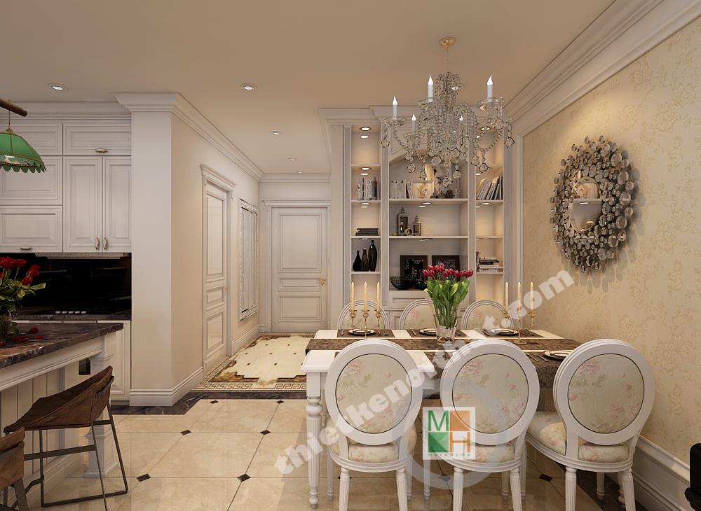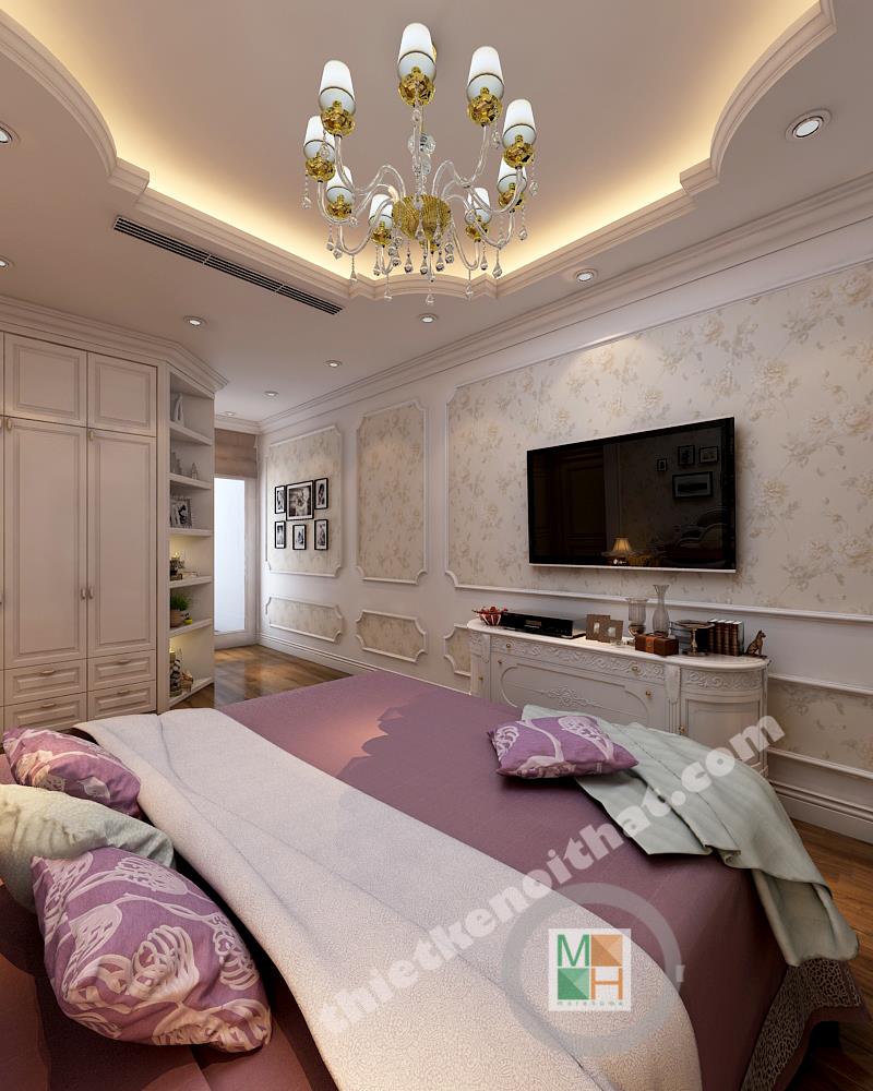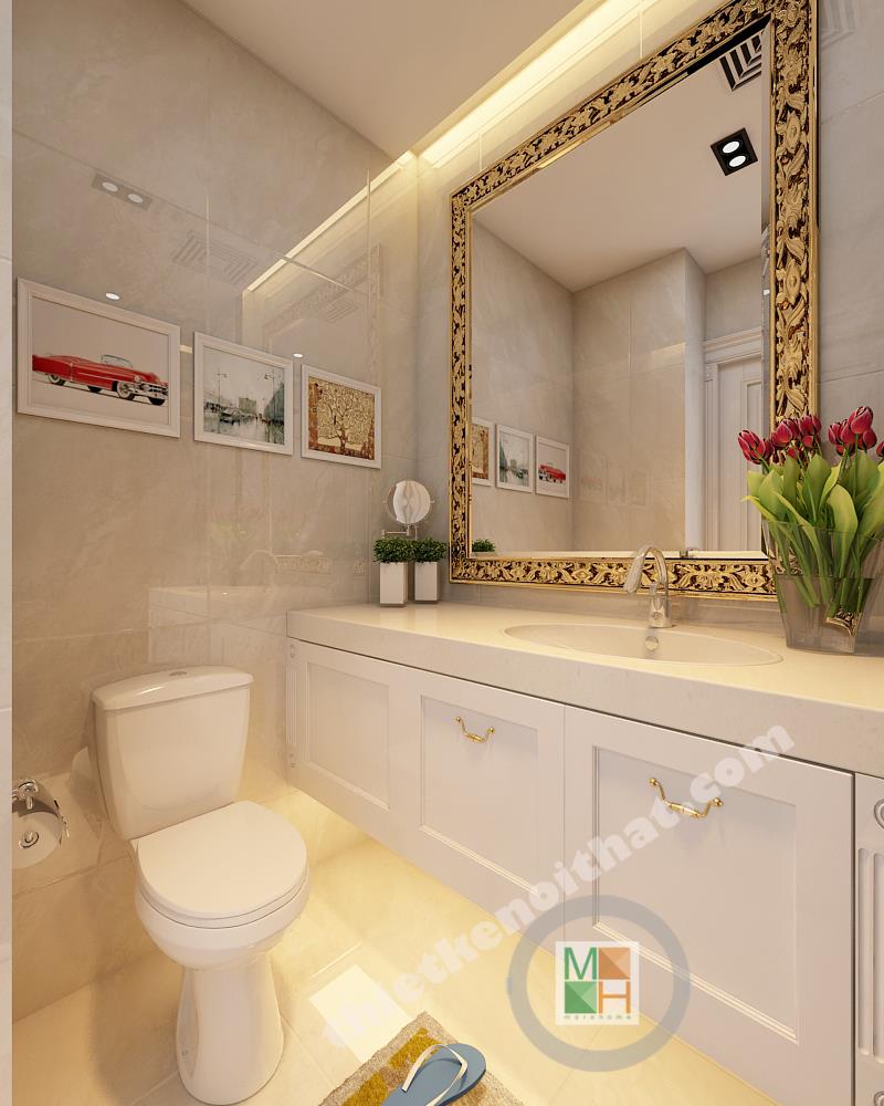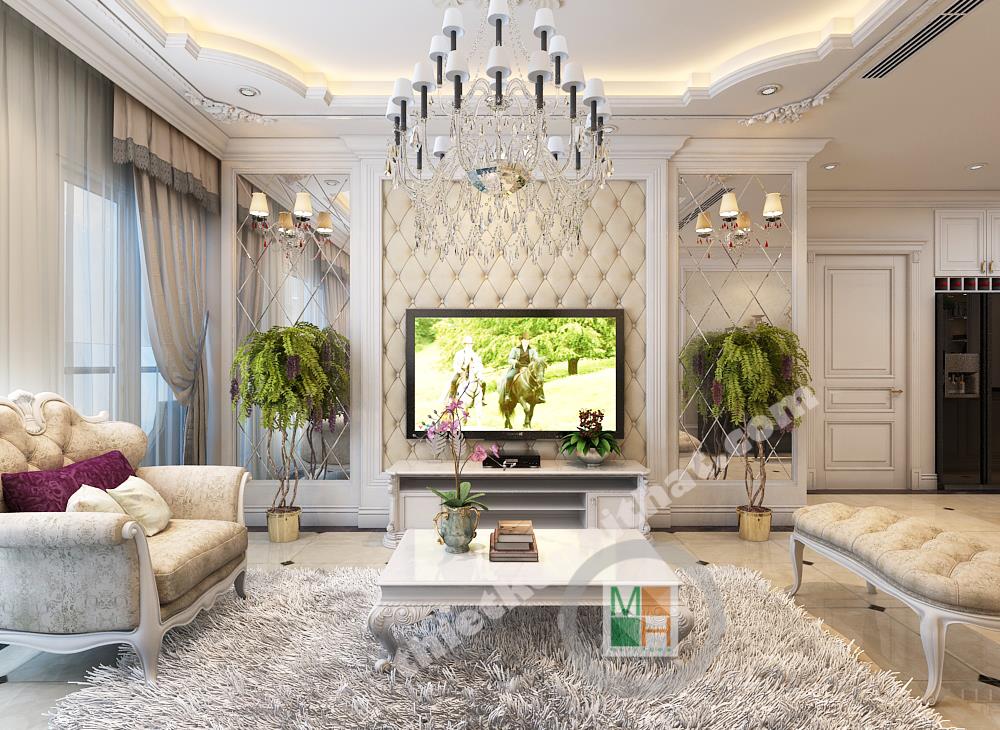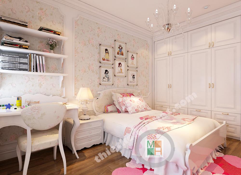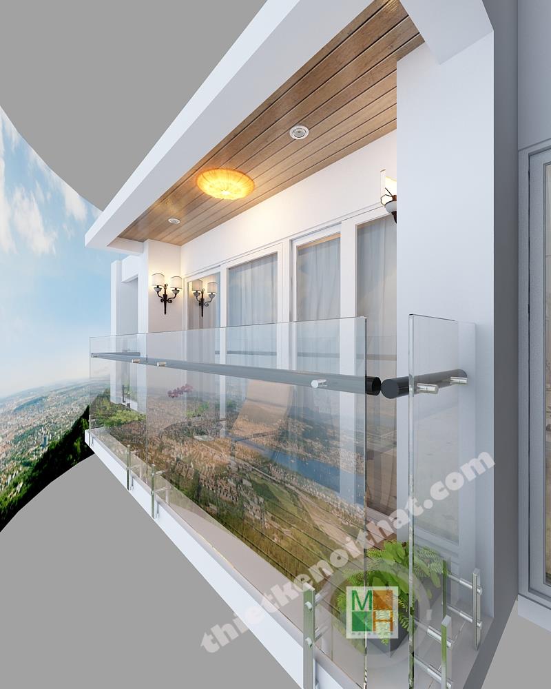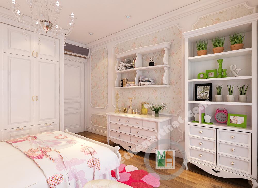 Ban công: Căn hộ nằm ở một vị trí khá cao của tòa nhà, do đó view rất rộng và đẹp. Nắm rõ điều này, các nhà thiết kế đã tận dụng đó để làm một thế mạnh cho ban công của căn hộ. Ban công không quá rộng, tuy nhiên lan can được thiết kế hoàn toàn bằng kính cường lực đã giúp cho tầm nhìn và không gian từ ban công dường như không có giới hạn. Để tạo được độ chịu lực cao cho vách kính của ban công thì khung đỡ kính, giá thép là những gì cần phải có. Tuy nhiên ở đây, những thiết kế giá thép cũng như khung đỡ kính được tối giản hết sức mà vẫn đủ độ vững, tạo sự thẩm mỹ cần phải có để tôn lên sự sang trọng của thiết kế kính này. Tổ hợp phòng khách – phòng bếp không được tách biệt mà nằm trong cùng một không gian khá rộng. Đây là nơi được coi là điểm nhấn trong thiết kế tân cổ điển của căn hộ. Phòng khách: Diện tích rộng và thiết kế theo lối không gian mở càng khiến căn phòng càng rộng hơn. Sự sang trọng của căn phòng đáng để nói đến đầu tiên đó là màu gạch lát. Màu gold nhẹ với những đường vân đá luôn tạo được sự sang trọng và quý phái, đồng thời việc phối màu nội thất với màu gạch cũng rất được chú ý. Toàn bộ nội thất của căn phòng đều được đi theo một phong cách đó là phong cách nội thất của Pháp cổ điển. Salon lớn, thảm lông lớn với những đường cong mềm mại và màu trắng pha vàng sâm panh là đặc trưng của lối kiến trúc này. Đối diện sô pha lớn là vách ngăn được trang trí bằng tấm đệm simili tán âm, đồng thời cũng là một chi tiết trang hoàng cho căn phòng. Màn hình TV lớn ốp tường, phía dưới là kệ nhỏ để các thiết bị điện tử, giải trí. Đèn chúm lớn khá nhiều chi tiết nhưng không hề rối mắt mà càng tôn thêm vẻ sang trọng cho căn phòng. Ánh sáng của căn phòng được cung cấp bởi đèn chúm lớn và hệ thống đèn mắt trâu ốp trần, đèn hắt trần và đèn ốp tường. Ngoài ra, để có được lượng ánh sáng tự nhiên nhiều nhất thì cửa sổ của căn phòng được thiết kế gần như hoàn toàn bằng kính. Kính tạo nên sự hiện đại còn rèm cửa lại tạo nên sự quý phái đặc trưng của lối kiến trúc này. Nổi bật trong căn phòng với tông trắng – vàng là chiếc piano đen quý phái. Đây là một điểm gây chú ý trong kiến trúc nội thất của căn phòng. Nó vừa là để tô điểm cho căn phòng, vừa là khoảng giao giữa khu vực phòng khách và khu vực bếp – phòng ăn. Gian bếp: Mặc dù có một không gian khá rộng nhưng để mọi thứ được gọn gàng và trật tự hơn thì các nhà thiết kế đã đưa vào một hệ thống tủ ốp tường cho gian bếp. Hệ thống tủ này vẫn là những chiếc tủ theo lối nội thất Pháp cổ với màu trắng sang trọng, được lắp lên gần như toàn bộ diện tích tường của khu bếp. Những không gian trống được tận dụng tối đa như là khoảng trống dưới tủ có thể cất một chiếc ghế nhỏ hoặc để những vật dụng nhỏ trong nhà bếp hoặc để các đồ trang trí. Do đó căn phòng rất gọn gàng và sắp xếp rất khoa học. Hệ thống bếp chìm mặt đá đen sang trọng, màu đen nổi hẳn lên tông trắng của bộ tủ. Tủ lạnh 2 cánh lớn màu đen được đặt chìm vào trong bộ tủ tường cũng là một điểm nhấn của căn phòng trên nên trắng. Cạnh bàn ăn là kệ đồ để rượu và các vật trang trí nhỏ, tránh được sự trống trải nơi bàn ăn. Một điểm nhấn cạnh bàn ăn đó là bộ gương trang trí với một chùm các tấm gương tròn lớn nhỏ, trang trí như một bông hoa lớn, rất lạ mắt và đặc biệt. Chiếu sáng cho bàn ăn là đèn chùm cỡ nhỏ nhưng vẫn là mẫu đèn chùm cổ điển và chiếu sáng cho cả căn bếp là hệ thống đèn mắt trâu gắn chìm trên trần, giúp cho căn phòng luôn đủ ánh sáng và tạo sự ấm cúng. Phòng ngủ trẻ em 1: Phòng ngủ trẻ em 1 được thiết kế dành cho con gái với tông màu chủ đạo là trắng xen các chi tiết hồng nhẹ. Đồ dùng trong phòng được thiết kế rất nữ tính: Thảm trải sàn nhiều màu sắc với những hình trái tim sinh động; Ga giường màu sữa, kết hợp với chăn gối được trang trí với những chi tiết màu hồng dễ thương; những bức tranh tường nhỏ được gắn lên tường đầu giường. Nội thất căn phòng khá đơn giản, phù hợp với nhu cầu sử dụng của trẻ con. Tủ đồ được đặt sát góc tường để tiết kiệm tối đa diện tích cho căn phòng. Kệ sách và bàn học được kê sát cửa sổ để tận dụng ánh sáng tự nhiên. Cuối phòng là những tủ đồ nhỏ và kệ để các đồ trang trí cho căn phòng. Phòng có cửa sổ khá lớn bằng kính nên có được rất nhiều ánh sáng tự nhiên. Phòng ngủ trẻ em 2 Phòng ngủ trẻ em 2 được thiết kế dành riêng cho bé trai. Điều này được thể hiện trong các chi tiết nội thất và màu sắc của chúng. Màu tím đậm của ga – gối tương phản mạnh với nền trắng của căn phòng, tạo nên sự mạnh mẽ, cá tính hơn. Những chi tiết nội th