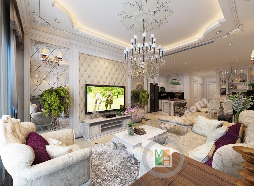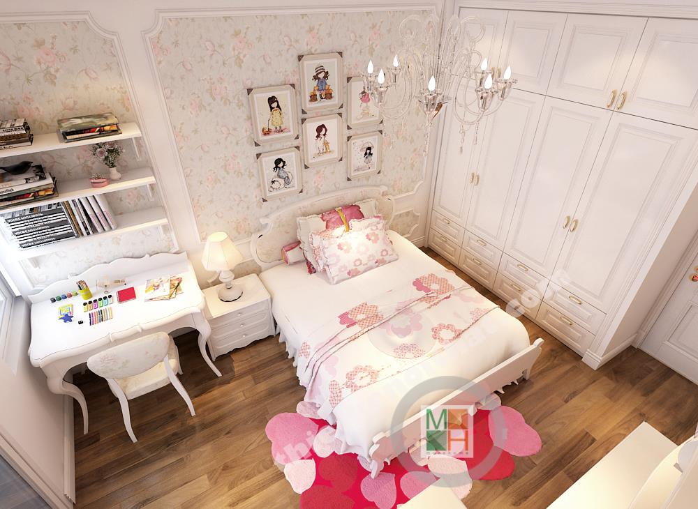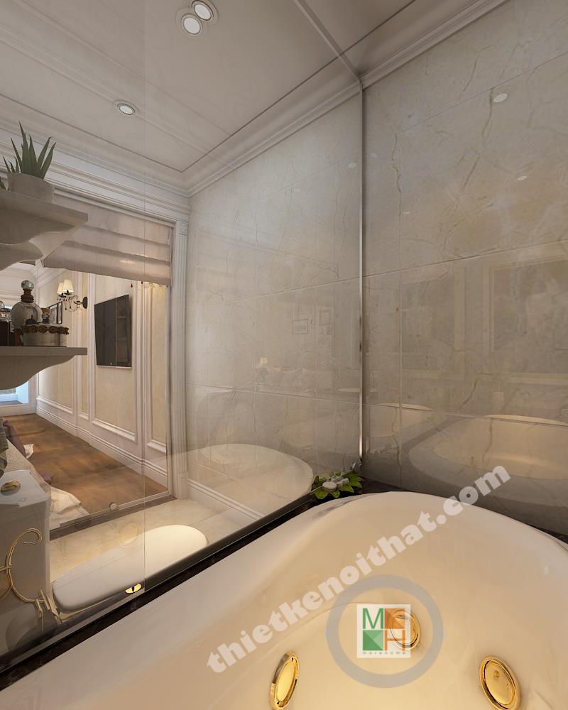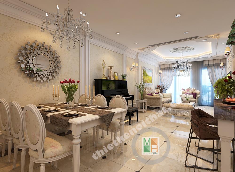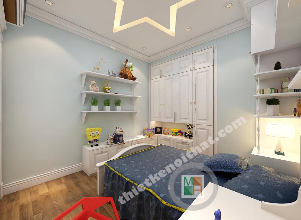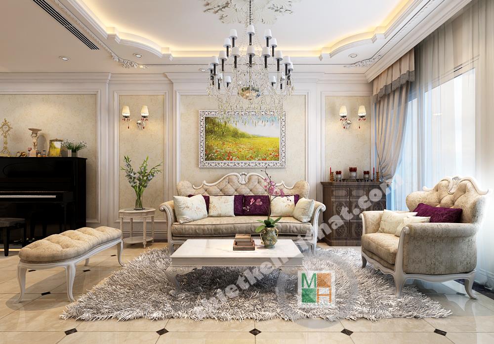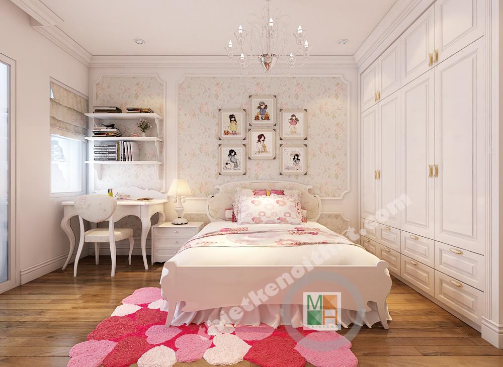 Ban công: Căn hộ nằm ở một vị trí khá cao của tòa nhà, do đó view rất rộng và đẹp. Nắm rõ điều này, các nhà thiết kế đã tận dụng đó để làm một thế mạnh cho ban công của căn hộ. Ban công không quá rộng, tuy nhiên lan can được thiết kế hoàn toàn bằng kính cường lực đã giúp cho tầm nhìn và không gian từ ban công dường như không có giới hạn. Để tạo được độ chịu lực cao cho vách kính của ban công thì khung đỡ kính, giá thép là những gì cần phải có. Tuy nhiên ở đây, những thiết kế giá thép cũng như khung đỡ kính được tối giản hết sức mà vẫn đủ độ vững, tạo sự thẩm mỹ cần phải có để tôn lên sự sang trọng của thiết kế kính này. Tổ hợp phòng khách – phòng bếp không được tách biệt mà nằm trong cùng một không gian khá rộng. Đây là nơi được coi là điểm nhấn trong thiết kế tân cổ điển của căn hộ. Phòng khách: Diện tích rộng và thiết kế theo lối không gian mở càng khiến căn phòng càng rộng hơn. Sự sang trọng của căn phòng đáng để nói đến đầu tiên đó là màu gạch lát. Màu gold nhẹ với những đường vân đá luôn tạo được sự sang trọng và quý phái, đồng thời việc phối màu nội thất với màu gạch cũng rất được chú ý. Toàn bộ nội thất của căn phòng đều được đi theo một phong cách đó là phong cách nội thất của Pháp cổ điển. Salon lớn, thảm lông lớn với những đường cong mềm mại và màu trắng pha vàng sâm panh là đặc trưng của lối kiến trúc này. Đối diện sô pha lớn là vách ngăn được trang trí bằng tấm đệm simili tán âm, đồng thời cũng là một chi tiết trang hoàng cho căn phòng. Màn hình TV lớn ốp tường, phía dưới là kệ nhỏ để các thiết bị điện tử, giải trí. Đèn chúm lớn khá nhiều chi tiết nhưng không hề rối mắt mà càng tôn thêm vẻ sang trọng cho căn phòng. Ánh sáng của căn phòng được cung cấp bởi đèn chúm lớn và hệ thống đèn mắt trâu ốp trần, đèn hắt trần và đèn ốp tường. Ngoài ra, để có được lượng ánh sáng tự nhiên nhiều nhất thì cửa sổ của căn phòng được thiết kế gần như hoàn toàn bằng kính. Kính tạo nên sự hiện đại còn rèm cửa lại tạo nên sự quý phái đặc trưng của lối kiến trúc này. Nổi bật trong căn phòng với tông trắng – vàng là chiếc piano đen quý phái. Đây là một điểm gây chú ý trong kiến trúc nội thất của căn phòng. Nó vừa là để tô điểm cho căn phòng, vừa là khoảng giao giữa khu vực phòng khách và khu vực bếp – phòng ăn. Gian bếp: Mặc dù có một không gian khá rộng nhưng để mọi thứ được gọn gàng và trật tự hơn thì các nhà thiết kế đã đưa vào một hệ thống tủ ốp tường cho gian bếp. Hệ thống tủ này vẫn là những chiếc tủ theo lối nội thất Pháp cổ với màu trắng sang trọng, được lắp lên gần như toàn bộ diện tích tường của khu bếp. Những không gian trống được tận dụng tối đa như là khoảng trống dưới tủ có thể cất một chiếc ghế nhỏ hoặc để những vật dụng nhỏ trong nhà bếp hoặc để các đồ trang trí. Do đó căn phòng rất gọn gàng và sắp xếp rất khoa học. Hệ thống bếp chìm mặt đá đen sang trọng, màu đen nổi hẳn lên tông trắng của bộ tủ. Tủ lạnh 2 cánh lớn màu đen được đặt chìm vào trong bộ tủ tường cũng là một điểm nhấn của căn phòng trên nên trắng. Cạnh bàn ăn là kệ đồ để rượu và các vật trang trí nhỏ, tránh được sự trống trải nơi bàn ăn. Một điểm nhấn cạnh bàn ăn đó là bộ gương trang trí với một chùm các tấm gương tròn lớn nhỏ, trang trí như một bông hoa lớn, rất lạ mắt và đặc biệt. Chiếu sáng cho bàn ăn là đèn chùm cỡ nhỏ nhưng vẫn là mẫu đèn chùm cổ điển và chiếu sáng cho cả căn bếp là hệ thống đèn mắt trâu gắn chìm trên trần, giúp cho căn phòng luôn đủ ánh sáng và tạo sự ấm cúng. Phòng ngủ trẻ em 1: Phòng ngủ trẻ em 1 được thiết kế dành cho con gái với tông màu chủ đạo là trắng xen các chi tiết hồng nhẹ. Đồ dùng trong phòng được thiết kế rất nữ tính: Thảm trải sàn nhiều màu sắc với những hình trái tim sinh động; Ga giường màu sữa, kết hợp với chăn gối được trang trí với những chi tiết màu hồng dễ thương; những bức tranh tường nhỏ được gắn lên tường đầu giường. Nội thất căn phòng khá đơn giản, phù hợp với nhu cầu sử dụng của trẻ con. Tủ đồ được đặt sát góc tường để tiết kiệm tối đa diện tích cho căn phòng. Kệ sách và bàn học được kê sát cửa sổ để tận dụng ánh sáng tự nhiên. Cuối phòng là những tủ đồ nhỏ và kệ để các đồ trang trí cho căn phòng. Phòng có cửa sổ khá lớn bằng kính nên có được rất nhiều ánh sáng tự nhiên. Phòng ngủ trẻ em 2 Phòng ngủ trẻ em 2 được thiết kế dành riêng cho bé trai. Điều này được thể hiện trong các chi tiết nội thất và màu sắc của chúng. Màu tím đậm của ga – gối tương phản mạnh với nền trắng của căn phòng, tạo nên sự mạnh mẽ, cá tính hơn. Những chi tiết nội th