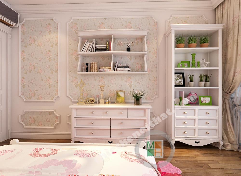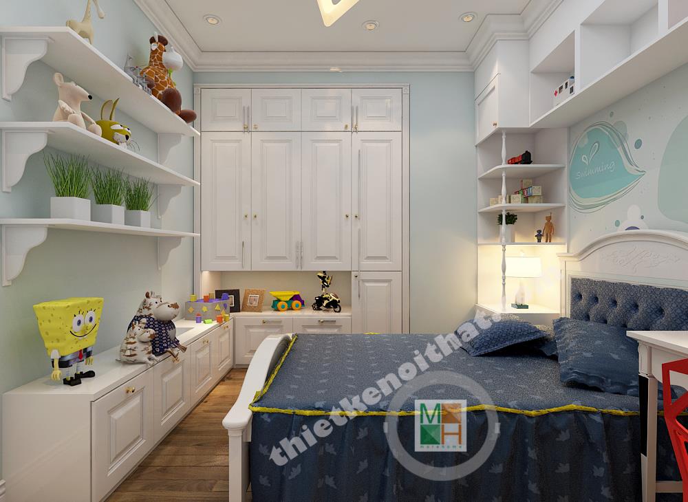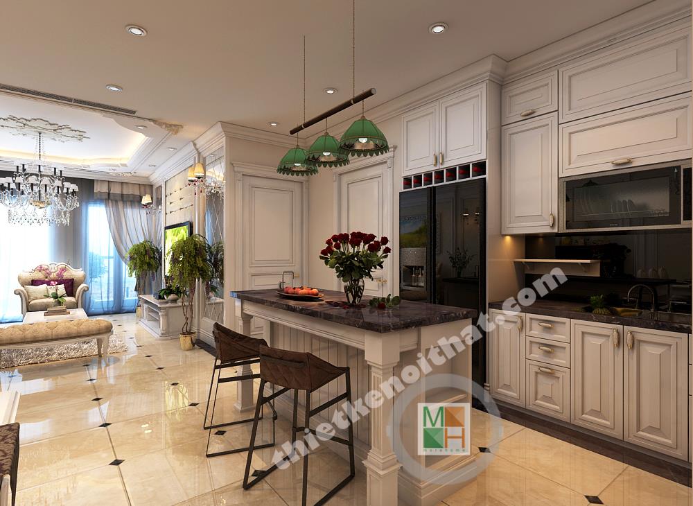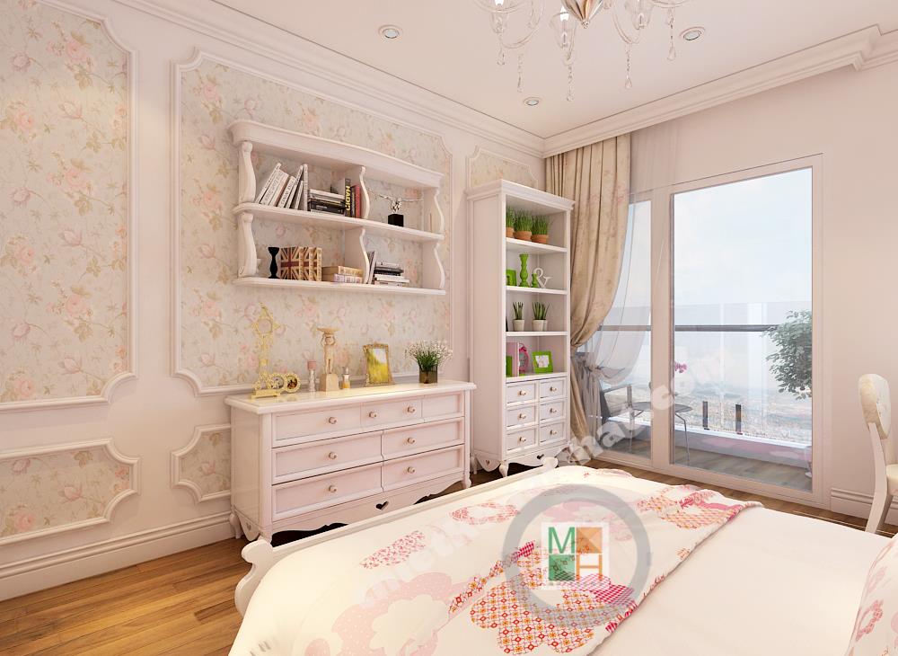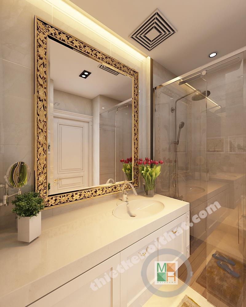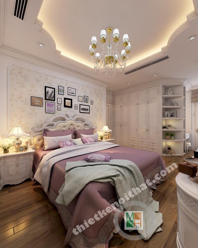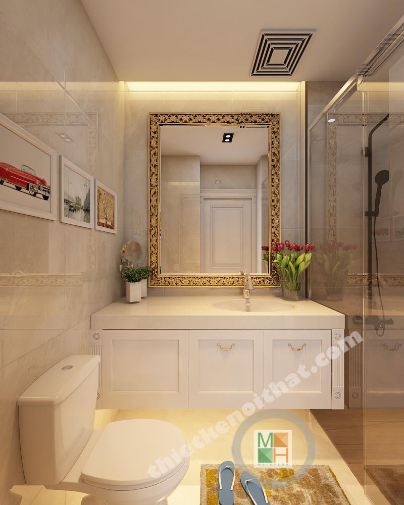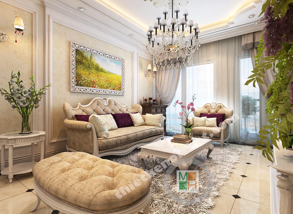 Ban công: Căn hộ nằm ở một vị trí khá cao của tòa nhà, do đó view rất rộng và đẹp. Nắm rõ điều này, các nhà thiết kế đã tận dụng đó để làm một thế mạnh cho ban công của căn hộ. Ban công không quá rộng, tuy nhiên lan can được thiết kế hoàn toàn bằng kính cường lực đã giúp cho tầm nhìn và không gian từ ban công dường như không có giới hạn. Để tạo được độ chịu lực cao cho vách kính của ban công thì khung đỡ kính, giá thép là những gì cần phải có. Tuy nhiên ở đây, những thiết kế giá thép cũng như khung đỡ kính được tối giản hết sức mà vẫn đủ độ vững, tạo sự thẩm mỹ cần phải có để tôn lên sự sang trọng của thiết kế kính này. Tổ hợp phòng khách – phòng bếp không được tách biệt mà nằm trong cùng một không gian khá rộng. Đây là nơi được coi là điểm nhấn trong thiết kế tân cổ điển của căn hộ. Phòng khách: Diện tích rộng và thiết kế theo lối không gian mở càng khiến căn phòng càng rộng hơn. Sự sang trọng của căn phòng đáng để nói đến đầu tiên đó là màu gạch lát. Màu gold nhẹ với những đường vân đá luôn tạo được sự sang trọng và quý phái, đồng thời việc phối màu nội thất với màu gạch cũng rất được chú ý. Toàn bộ nội thất của căn phòng đều được đi theo một phong cách đó là phong cách nội thất của Pháp cổ điển. Salon lớn, thảm lông lớn với những đường cong mềm mại và màu trắng pha vàng sâm panh là đặc trưng của lối kiến trúc này. Đối diện sô pha lớn là vách ngăn được trang trí bằng tấm đệm simili tán âm, đồng thời cũng là một chi tiết trang hoàng cho căn phòng. Màn hình TV lớn ốp tường, phía dưới là kệ nhỏ để các thiết bị điện tử, giải trí. Đèn chúm lớn khá nhiều chi tiết nhưng không hề rối mắt mà càng tôn thêm vẻ sang trọng cho căn phòng. Ánh sáng của căn phòng được cung cấp bởi đèn chúm lớn và hệ thống đèn mắt trâu ốp trần, đèn hắt trần và đèn ốp tường. Ngoài ra, để có được lượng ánh sáng tự nhiên nhiều nhất thì cửa sổ của căn phòng được thiết kế gần như hoàn toàn bằng kính. Kính tạo nên sự hiện đại còn rèm cửa lại tạo nên sự quý phái đặc trưng của lối kiến trúc này. Nổi bật trong căn phòng với tông trắng – vàng là chiếc piano đen quý phái. Đây là một điểm gây chú ý trong kiến trúc nội thất của căn phòng. Nó vừa là để tô điểm cho căn phòng, vừa là khoảng giao giữa khu vực phòng khách và khu vực bếp – phòng ăn. Gian bếp: Mặc dù có một không gian khá rộng nhưng để mọi thứ được gọn gàng và trật tự hơn thì các nhà thiết kế đã đưa vào một hệ thống tủ ốp tường cho gian bếp. Hệ thống tủ này vẫn là những chiếc tủ theo lối nội thất Pháp cổ với màu trắng sang trọng, được lắp lên gần như toàn bộ diện tích tường của khu bếp. Những không gian trống được tận dụng tối đa như là khoảng trống dưới tủ có thể cất một chiếc ghế nhỏ hoặc để những vật dụng nhỏ trong nhà bếp hoặc để các đồ trang trí. Do đó căn phòng rất gọn gàng và sắp xếp rất khoa học. Hệ thống bếp chìm mặt đá đen sang trọng, màu đen nổi hẳn lên tông trắng của bộ tủ. Tủ lạnh 2 cánh lớn màu đen được đặt chìm vào trong bộ tủ tường cũng là một điểm nhấn của căn phòng trên nên trắng. Cạnh bàn ăn là kệ đồ để rượu và các vật trang trí nhỏ, tránh được sự trống trải nơi bàn ăn. Một điểm nhấn cạnh bàn ăn đó là bộ gương trang trí với một chùm các tấm gương tròn lớn nhỏ, trang trí như một bông hoa lớn, rất lạ mắt và đặc biệt. Chiếu sáng cho bàn ăn là đèn chùm cỡ nhỏ nhưng vẫn là mẫu đèn chùm cổ điển và chiếu sáng cho cả căn bếp là hệ thống đèn mắt trâu gắn chìm trên trần, giúp cho căn phòng luôn đủ ánh sáng và tạo sự ấm cúng. Phòng ngủ trẻ em 1: Phòng ngủ trẻ em 1 được thiết kế dành cho con gái với tông màu chủ đạo là trắng xen các chi tiết hồng nhẹ. Đồ dùng trong phòng được thiết kế rất nữ tính: Thảm trải sàn nhiều màu sắc với những hình trái tim sinh động; Ga giường màu sữa, kết hợp với chăn gối được trang trí với những chi tiết màu hồng dễ thương; những bức tranh tường nhỏ được gắn lên tường đầu giường. Nội thất căn phòng khá đơn giản, phù hợp với nhu cầu sử dụng của trẻ con. Tủ đồ được đặt sát góc tường để tiết kiệm tối đa diện tích cho căn phòng. Kệ sách và bàn học được kê sát cửa sổ để tận dụng ánh sáng tự nhiên. Cuối phòng là những tủ đồ nhỏ và kệ để các đồ trang trí cho căn phòng. Phòng có cửa sổ khá lớn bằng kính nên có được rất nhiều ánh sáng tự nhiên. Phòng ngủ trẻ em 2 Phòng ngủ trẻ em 2 được thiết kế dành riêng cho bé trai. Điều này được thể hiện trong các chi tiết nội thất và màu sắc của chúng. Màu tím đậm của ga – gối tương phản mạnh với nền trắng của căn phòng, tạo nên sự mạnh mẽ, cá tính hơn. Những chi tiết nội th