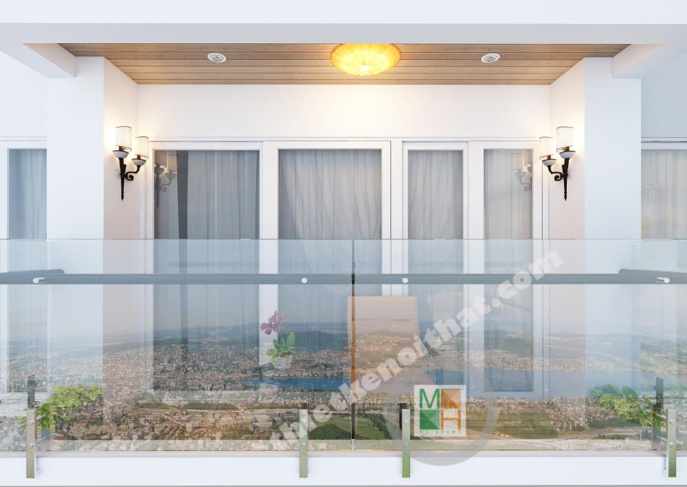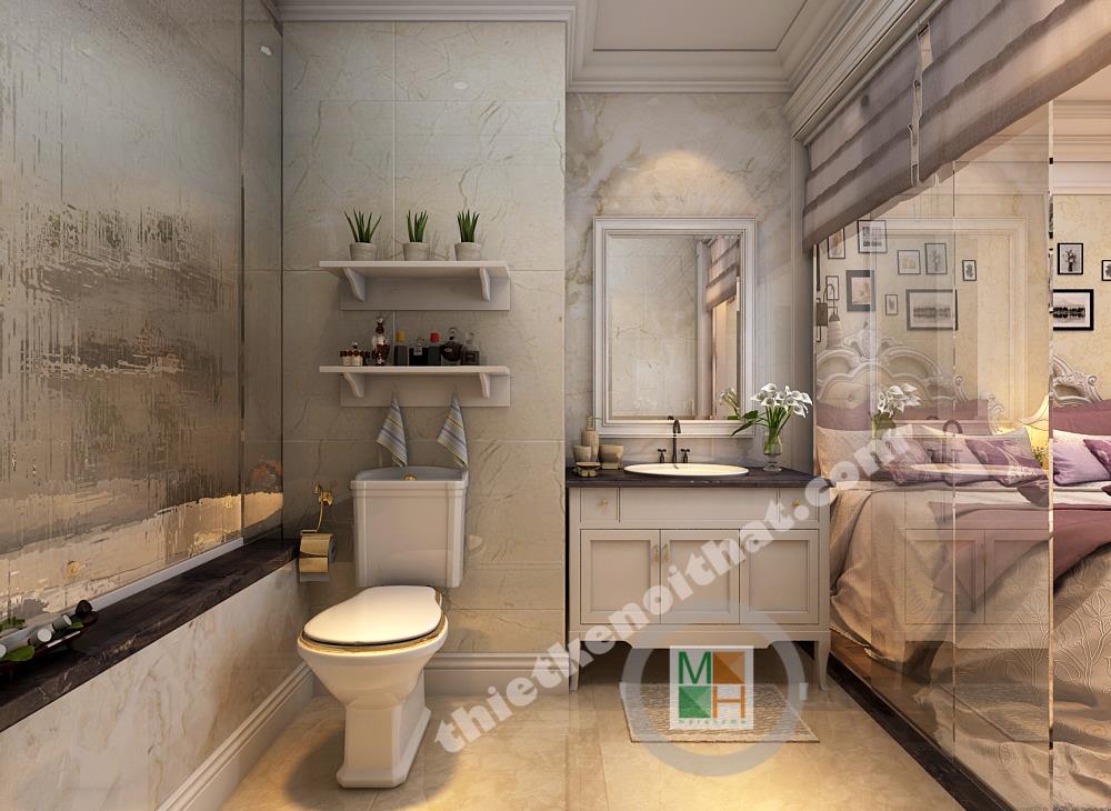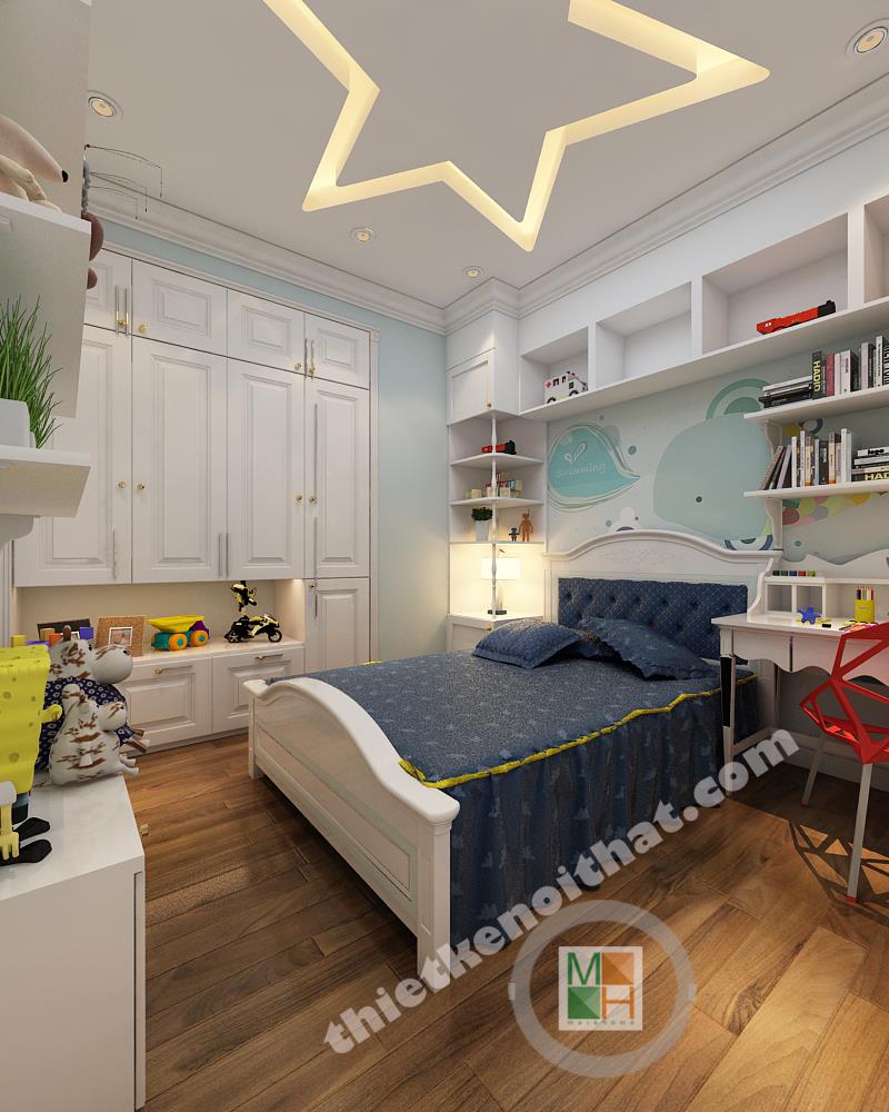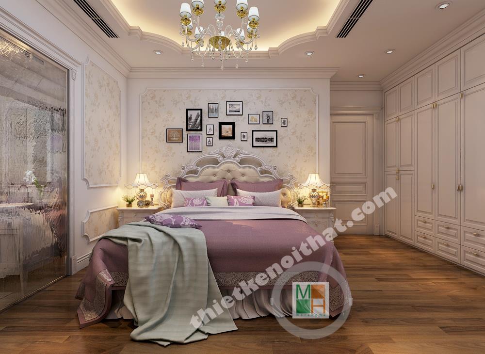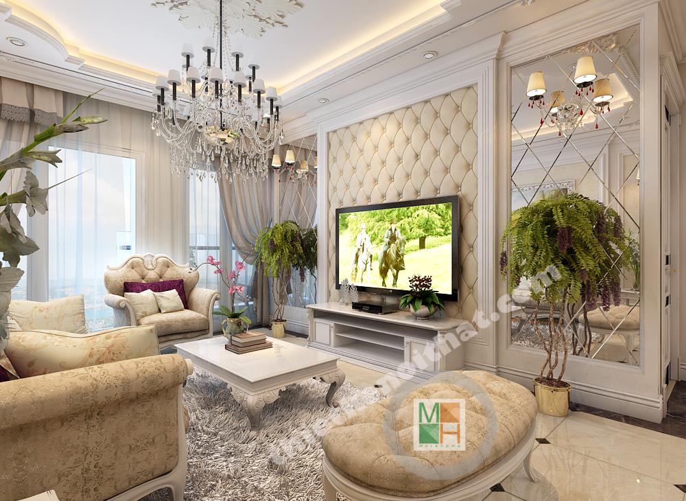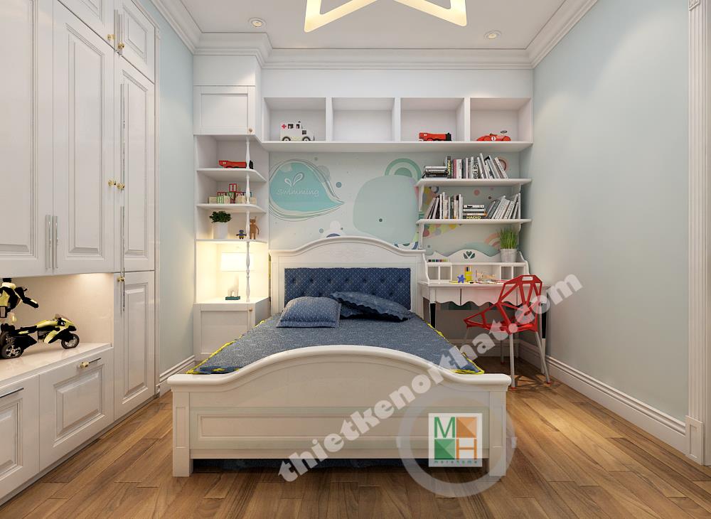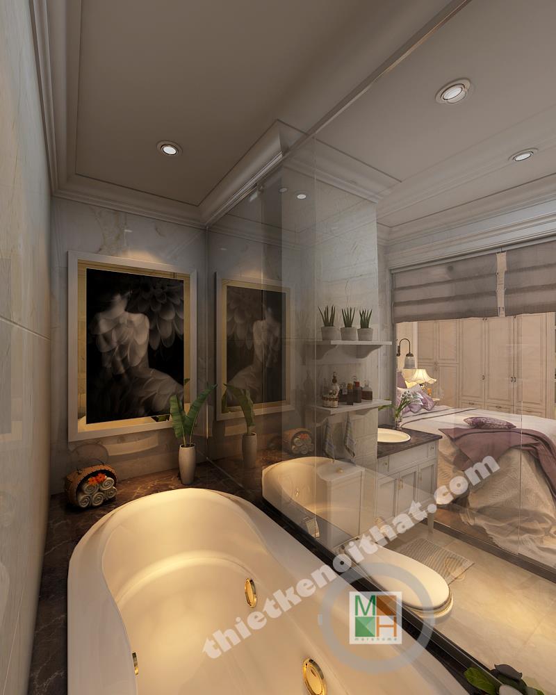 Ban công: Căn hộ nằm ở một vị trí khá cao của tòa nhà, do đó view rất rộng và đẹp. Nắm rõ điều này, các nhà thiết kế đã tận dụng đó để làm một thế mạnh cho ban công của căn hộ. Ban công không quá rộng, tuy nhiên lan can được thiết kế hoàn toàn bằng kính cường lực đã giúp cho tầm nhìn và không gian từ ban công dường như không có giới hạn. Để tạo được độ chịu lực cao cho vách kính của ban công thì khung đỡ kính, giá thép là những gì cần phải có. Tuy nhiên ở đây, những thiết kế giá thép cũng như khung đỡ kính được tối giản hết sức mà vẫn đủ độ vững, tạo sự thẩm mỹ cần phải có để tôn lên sự sang trọng của thiết kế kính này. Tổ hợp phòng khách – phòng bếp không được tách biệt mà nằm trong cùng một không gian khá rộng. Đây là nơi được coi là điểm nhấn trong thiết kế tân cổ điển của căn hộ. Phòng khách: Diện tích rộng và thiết kế theo lối không gian mở càng khiến căn phòng càng rộng hơn. Sự sang trọng của căn phòng đáng để nói đến đầu tiên đó là màu gạch lát. Màu gold nhẹ với những đường vân đá luôn tạo được sự sang trọng và quý phái, đồng thời việc phối màu nội thất với màu gạch cũng rất được chú ý. Toàn bộ nội thất của căn phòng đều được đi theo một phong cách đó là phong cách nội thất của Pháp cổ điển. Salon lớn, thảm lông lớn với những đường cong mềm mại và màu trắng pha vàng sâm panh là đặc trưng của lối kiến trúc này. Đối diện sô pha lớn là vách ngăn được trang trí bằng tấm đệm simili tán âm, đồng thời cũng là một chi tiết trang hoàng cho căn phòng. Màn hình TV lớn ốp tường, phía dưới là kệ nhỏ để các thiết bị điện tử, giải trí. Đèn chúm lớn khá nhiều chi tiết nhưng không hề rối mắt mà càng tôn thêm vẻ sang trọng cho căn phòng. Ánh sáng của căn phòng được cung cấp bởi đèn chúm lớn và hệ thống đèn mắt trâu ốp trần, đèn hắt trần và đèn ốp tường. Ngoài ra, để có được lượng ánh sáng tự nhiên nhiều nhất thì cửa sổ của căn phòng được thiết kế gần như hoàn toàn bằng kính. Kính tạo nên sự hiện đại còn rèm cửa lại tạo nên sự quý phái đặc trưng của lối kiến trúc này. Nổi bật trong căn phòng với tông trắng – vàng là chiếc piano đen quý phái. Đây là một điểm gây chú ý trong kiến trúc nội thất của căn phòng. Nó vừa là để tô điểm cho căn phòng, vừa là khoảng giao giữa khu vực phòng khách và khu vực bếp – phòng ăn. Gian bếp: Mặc dù có một không gian khá rộng nhưng để mọi thứ được gọn gàng và trật tự hơn thì các nhà thiết kế đã đưa vào một hệ thống tủ ốp tường cho gian bếp. Hệ thống tủ này vẫn là những chiếc tủ theo lối nội thất Pháp cổ với màu trắng sang trọng, được lắp lên gần như toàn bộ diện tích tường của khu bếp. Những không gian trống được tận dụng tối đa như là khoảng trống dưới tủ có thể cất một chiếc ghế nhỏ hoặc để những vật dụng nhỏ trong nhà bếp hoặc để các đồ trang trí. Do đó căn phòng rất gọn gàng và sắp xếp rất khoa học. Hệ thống bếp chìm mặt đá đen sang trọng, màu đen nổi hẳn lên tông trắng của bộ tủ. Tủ lạnh 2 cánh lớn màu đen được đặt chìm vào trong bộ tủ tường cũng là một điểm nhấn của căn phòng trên nên trắng. Cạnh bàn ăn là kệ đồ để rượu và các vật trang trí nhỏ, tránh được sự trống trải nơi bàn ăn. Một điểm nhấn cạnh bàn ăn đó là bộ gương trang trí với một chùm các tấm gương tròn lớn nhỏ, trang trí như một bông hoa lớn, rất lạ mắt và đặc biệt. Chiếu sáng cho bàn ăn là đèn chùm cỡ nhỏ nhưng vẫn là mẫu đèn chùm cổ điển và chiếu sáng cho cả căn bếp là hệ thống đèn mắt trâu gắn chìm trên trần, giúp cho căn phòng luôn đủ ánh sáng và tạo sự ấm cúng. Phòng ngủ trẻ em 1: Phòng ngủ trẻ em 1 được thiết kế dành cho con gái với tông màu chủ đạo là trắng xen các chi tiết hồng nhẹ. Đồ dùng trong phòng được thiết kế rất nữ tính: Thảm trải sàn nhiều màu sắc với những hình trái tim sinh động; Ga giường màu sữa, kết hợp với chăn gối được trang trí với những chi tiết màu hồng dễ thương; những bức tranh tường nhỏ được gắn lên tường đầu giường. Nội thất căn phòng khá đơn giản, phù hợp với nhu cầu sử dụng của trẻ con. Tủ đồ được đặt sát góc tường để tiết kiệm tối đa diện tích cho căn phòng. Kệ sách và bàn học được kê sát cửa sổ để tận dụng ánh sáng tự nhiên. Cuối phòng là những tủ đồ nhỏ và kệ để các đồ trang trí cho căn phòng. Phòng có cửa sổ khá lớn bằng kính nên có được rất nhiều ánh sáng tự nhiên. Phòng ngủ trẻ em 2 Phòng ngủ trẻ em 2 được thiết kế dành riêng cho bé trai. Điều này được thể hiện trong các chi tiết nội thất và màu sắc của chúng. Màu tím đậm của ga – gối tương phản mạnh với nền trắng của căn phòng, tạo nên sự mạnh mẽ, cá tính hơn. Những chi tiết nội th