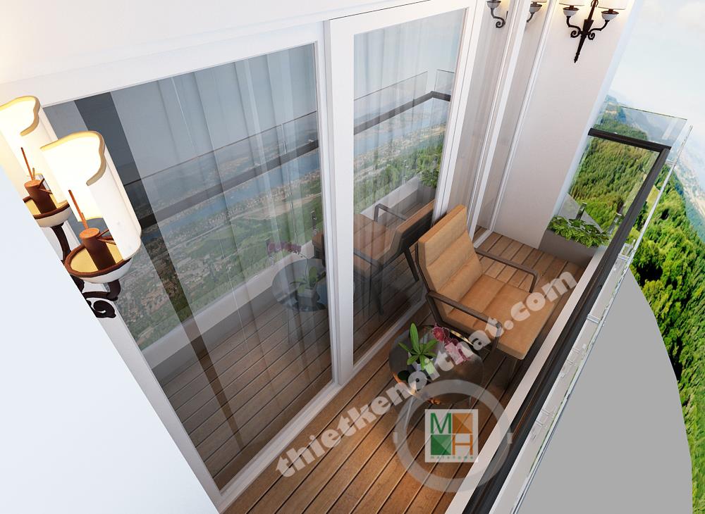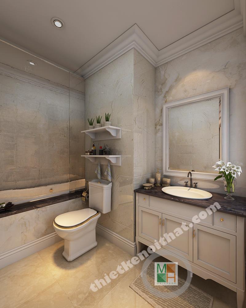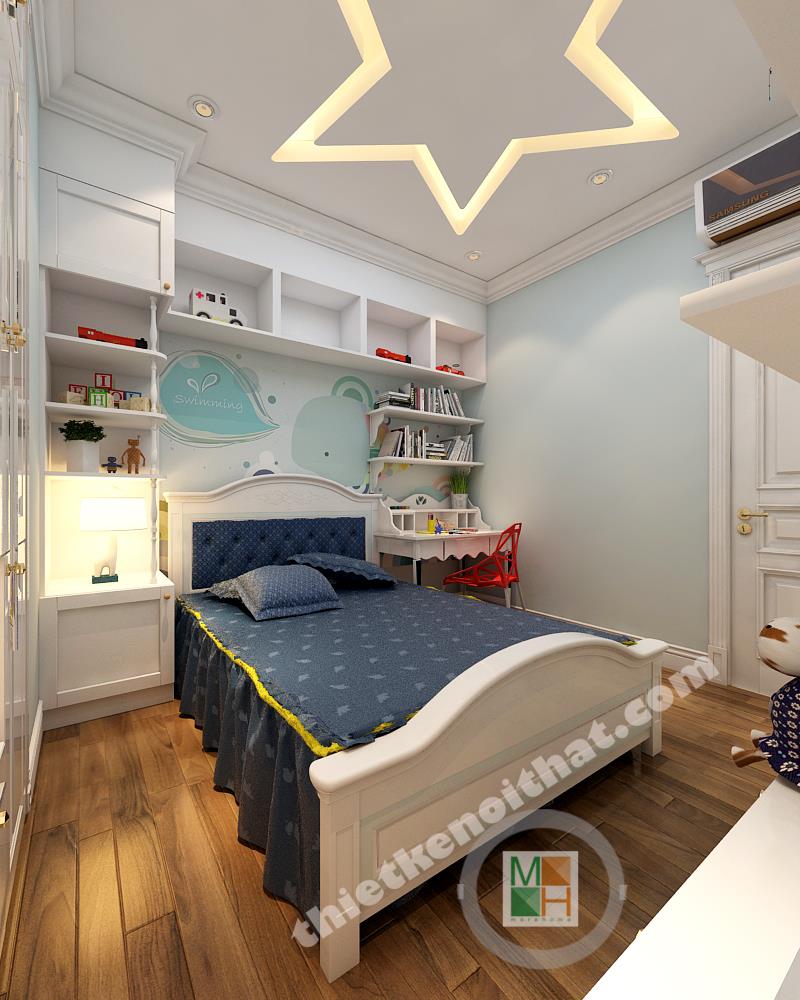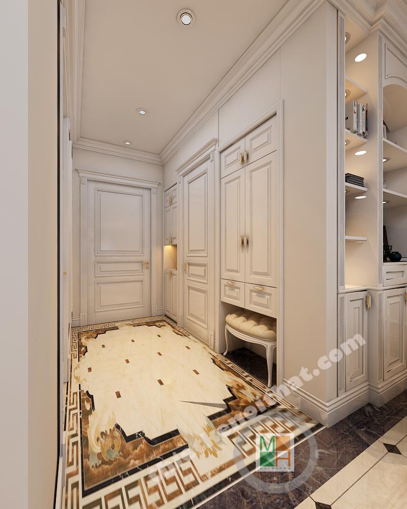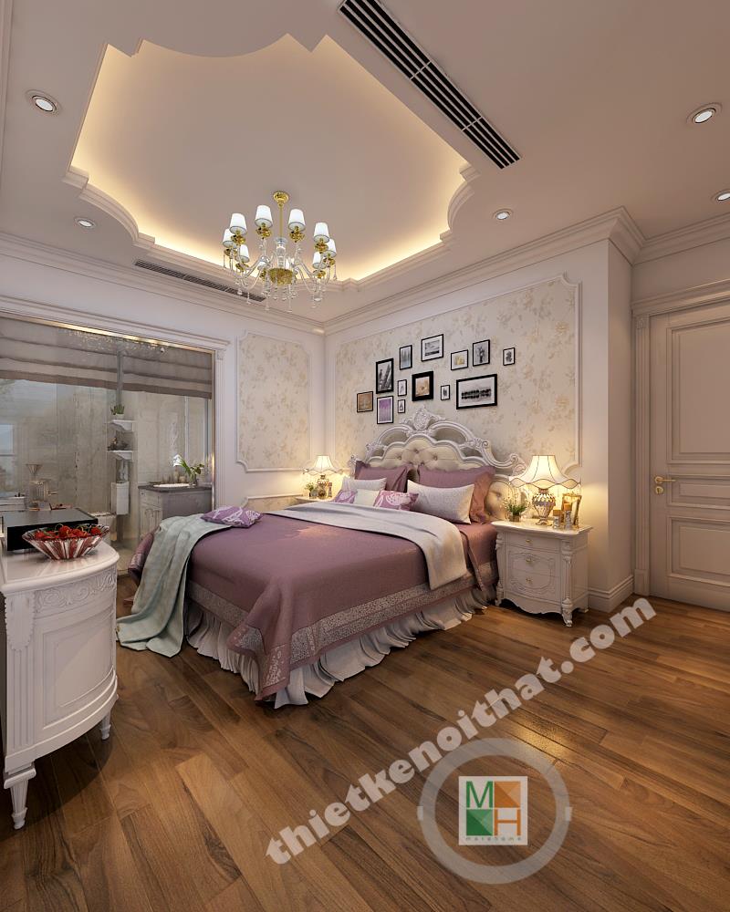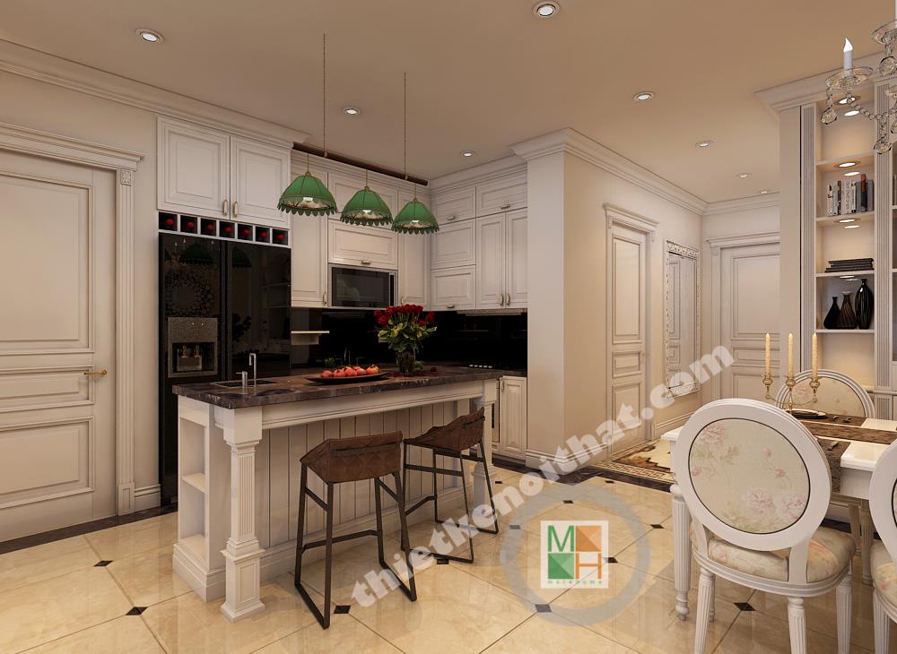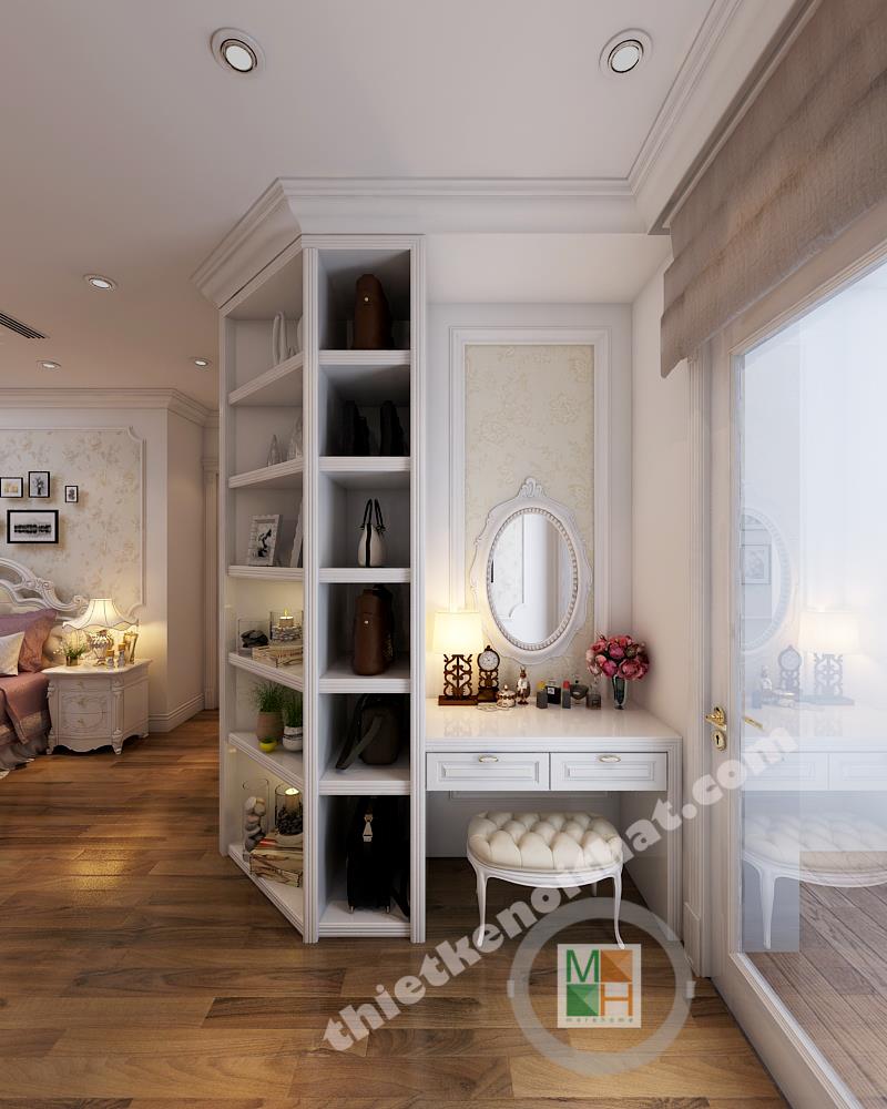 Ban công: Căn hộ nằm ở một vị trí khá cao của tòa nhà, do đó view rất rộng và đẹp. Nắm rõ điều này, các nhà thiết kế đã tận dụng đó để làm một thế mạnh cho ban công của căn hộ. Ban công không quá rộng, tuy nhiên lan can được thiết kế hoàn toàn bằng kính cường lực đã giúp cho tầm nhìn và không gian từ ban công dường như không có giới hạn. Để tạo được độ chịu lực cao cho vách kính của ban công thì khung đỡ kính, giá thép là những gì cần phải có. Tuy nhiên ở đây, những thiết kế giá thép cũng như khung đỡ kính được tối giản hết sức mà vẫn đủ độ vững, tạo sự thẩm mỹ cần phải có để tôn lên sự sang trọng của thiết kế kính này. Tổ hợp phòng khách – phòng bếp không được tách biệt mà nằm trong cùng một không gian khá rộng. Đây là nơi được coi là điểm nhấn trong thiết kế tân cổ điển của căn hộ. Phòng khách: Diện tích rộng và thiết kế theo lối không gian mở càng khiến căn phòng càng rộng hơn. Sự sang trọng của căn phòng đáng để nói đến đầu tiên đó là màu gạch lát. Màu gold nhẹ với những đường vân đá luôn tạo được sự sang trọng và quý phái, đồng thời việc phối màu nội thất với màu gạch cũng rất được chú ý. Toàn bộ nội thất của căn phòng đều được đi theo một phong cách đó là phong cách nội thất của Pháp cổ điển. Salon lớn, thảm lông lớn với những đường cong mềm mại và màu trắng pha vàng sâm panh là đặc trưng của lối kiến trúc này. Đối diện sô pha lớn là vách ngăn được trang trí bằng tấm đệm simili tán âm, đồng thời cũng là một chi tiết trang hoàng cho căn phòng. Màn hình TV lớn ốp tường, phía dưới là kệ nhỏ để các thiết bị điện tử, giải trí. Đèn chúm lớn khá nhiều chi tiết nhưng không hề rối mắt mà càng tôn thêm vẻ sang trọng cho căn phòng. Ánh sáng của căn phòng được cung cấp bởi đèn chúm lớn và hệ thống đèn mắt trâu ốp trần, đèn hắt trần và đèn ốp tường. Ngoài ra, để có được lượng ánh sáng tự nhiên nhiều nhất thì cửa sổ của căn phòng được thiết kế gần như hoàn toàn bằng kính. Kính tạo nên sự hiện đại còn rèm cửa lại tạo nên sự quý phái đặc trưng của lối kiến trúc này. Nổi bật trong căn phòng với tông trắng – vàng là chiếc piano đen quý phái. Đây là một điểm gây chú ý trong kiến trúc nội thất của căn phòng. Nó vừa là để tô điểm cho căn phòng, vừa là khoảng giao giữa khu vực phòng khách và khu vực bếp – phòng ăn. Gian bếp: Mặc dù có một không gian khá rộng nhưng để mọi thứ được gọn gàng và trật tự hơn thì các nhà thiết kế đã đưa vào một hệ thống tủ ốp tường cho gian bếp. Hệ thống tủ này vẫn là những chiếc tủ theo lối nội thất Pháp cổ với màu trắng sang trọng, được lắp lên gần như toàn bộ diện tích tường của khu bếp. Những không gian trống được tận dụng tối đa như là khoảng trống dưới tủ có thể cất một chiếc ghế nhỏ hoặc để những vật dụng nhỏ trong nhà bếp hoặc để các đồ trang trí. Do đó căn phòng rất gọn gàng và sắp xếp rất khoa học. Hệ thống bếp chìm mặt đá đen sang trọng, màu đen nổi hẳn lên tông trắng của bộ tủ. Tủ lạnh 2 cánh lớn màu đen được đặt chìm vào trong bộ tủ tường cũng là một điểm nhấn của căn phòng trên nên trắng. Cạnh bàn ăn là kệ đồ để rượu và các vật trang trí nhỏ, tránh được sự trống trải nơi bàn ăn. Một điểm nhấn cạnh bàn ăn đó là bộ gương trang trí với một chùm các tấm gương tròn lớn nhỏ, trang trí như một bông hoa lớn, rất lạ mắt và đặc biệt. Chiếu sáng cho bàn ăn là đèn chùm cỡ nhỏ nhưng vẫn là mẫu đèn chùm cổ điển và chiếu sáng cho cả căn bếp là hệ thống đèn mắt trâu gắn chìm trên trần, giúp cho căn phòng luôn đủ ánh sáng và tạo sự ấm cúng. Phòng ngủ trẻ em 1: Phòng ngủ trẻ em 1 được thiết kế dành cho con gái với tông màu chủ đạo là trắng xen các chi tiết hồng nhẹ. Đồ dùng trong phòng được thiết kế rất nữ tính: Thảm trải sàn nhiều màu sắc với những hình trái tim sinh động; Ga giường màu sữa, kết hợp với chăn gối được trang trí với những chi tiết màu hồng dễ thương; những bức tranh tường nhỏ được gắn lên tường đầu giường. Nội thất căn phòng khá đơn giản, phù hợp với nhu cầu sử dụng của trẻ con. Tủ đồ được đặt sát góc tường để tiết kiệm tối đa diện tích cho căn phòng. Kệ sách và bàn học được kê sát cửa sổ để tận dụng ánh sáng tự nhiên. Cuối phòng là những tủ đồ nhỏ và kệ để các đồ trang trí cho căn phòng. Phòng có cửa sổ khá lớn bằng kính nên có được rất nhiều ánh sáng tự nhiên. Phòng ngủ trẻ em 2 Phòng ngủ trẻ em 2 được thiết kế dành riêng cho bé trai. Điều này được thể hiện trong các chi tiết nội thất và màu sắc của chúng. Màu tím đậm của ga – gối tương phản mạnh với nền trắng của căn phòng, tạo nên sự mạnh mẽ, cá tính hơn. Những chi tiết nội th