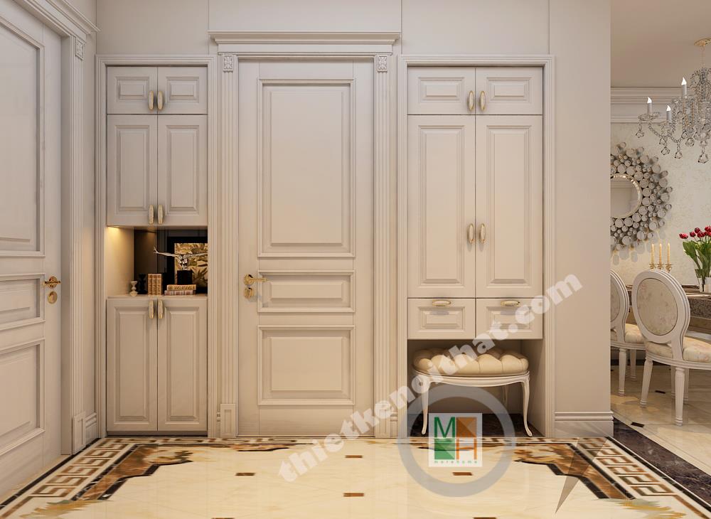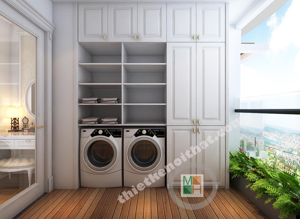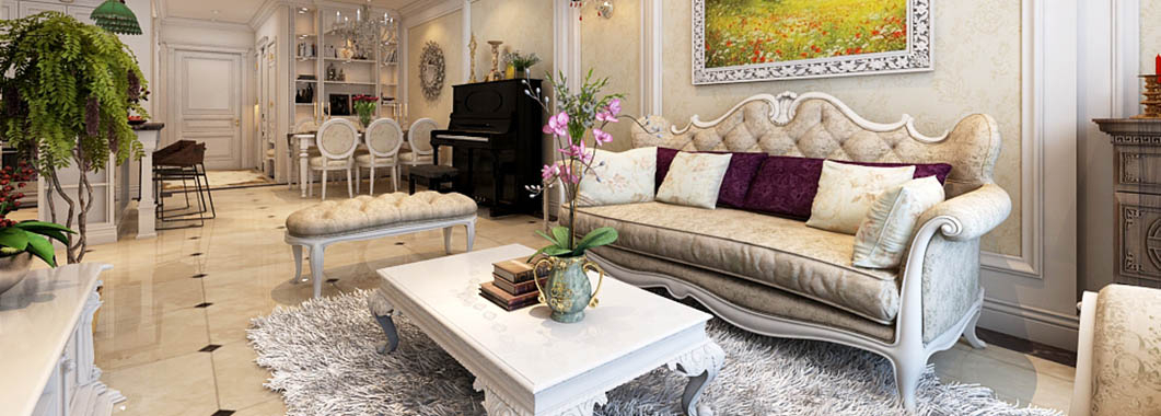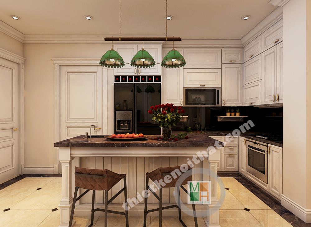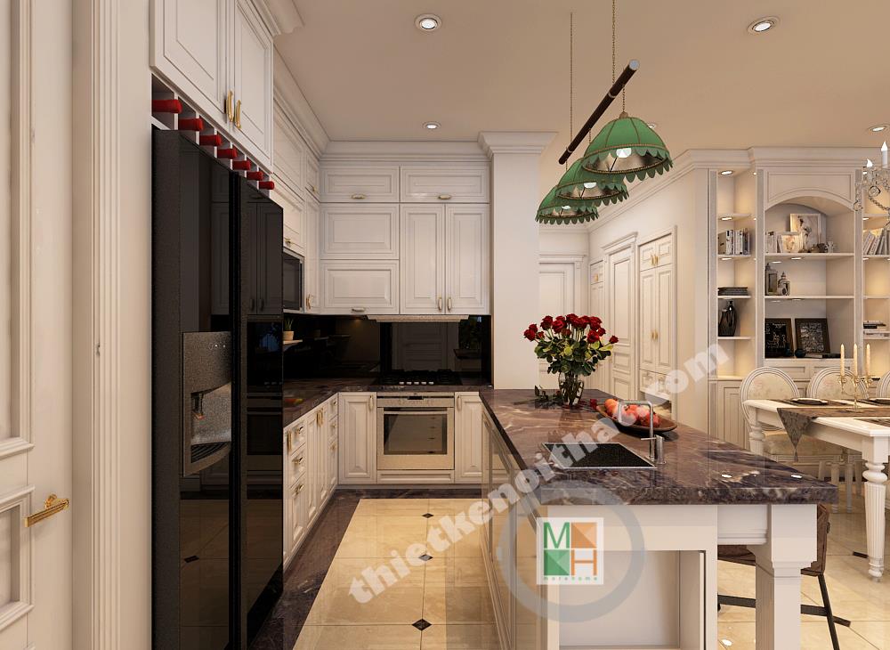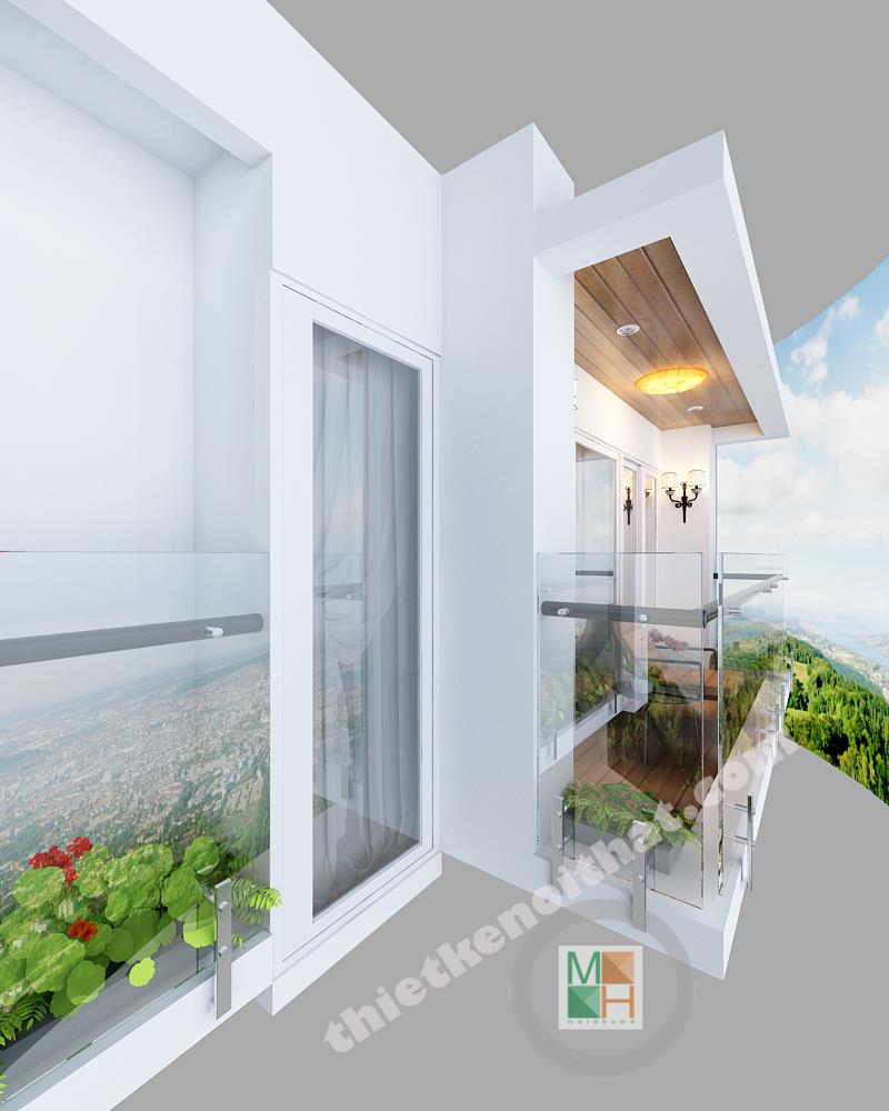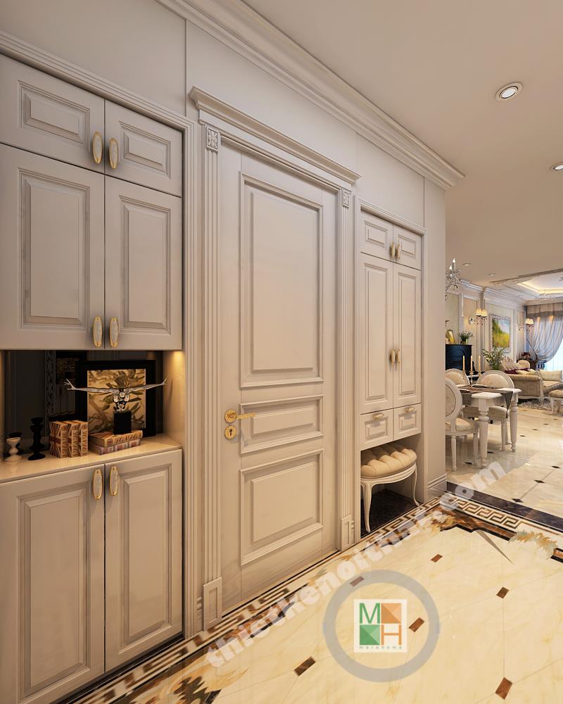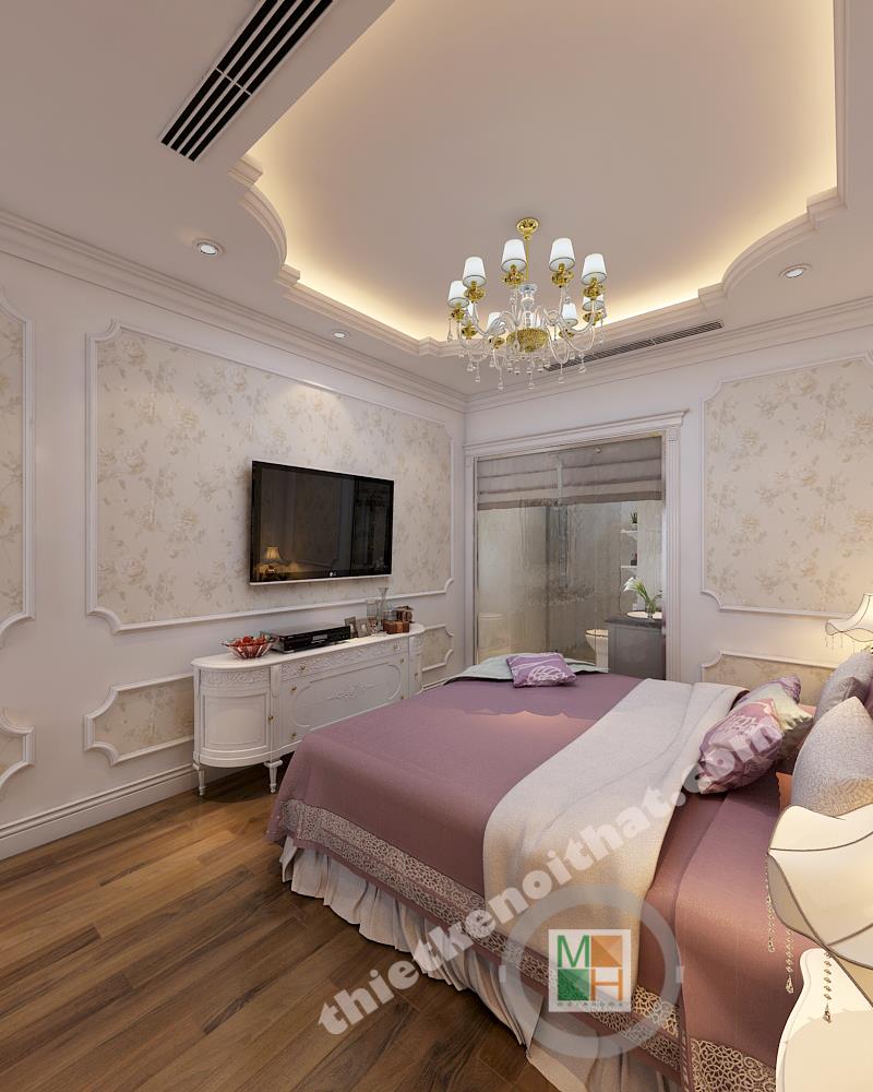 Ban công: Căn hộ nằm ở một vị trí khá cao của tòa nhà, do đó view rất rộng và đẹp. Nắm rõ điều này, các nhà thiết kế đã tận dụng đó để làm một thế mạnh cho ban công của căn hộ. Ban công không quá rộng, tuy nhiên lan can được thiết kế hoàn toàn bằng kính cường lực đã giúp cho tầm nhìn và không gian từ ban công dường như không có giới hạn. Để tạo được độ chịu lực cao cho vách kính của ban công thì khung đỡ kính, giá thép là những gì cần phải có. Tuy nhiên ở đây, những thiết kế giá thép cũng như khung đỡ kính được tối giản hết sức mà vẫn đủ độ vững, tạo sự thẩm mỹ cần phải có để tôn lên sự sang trọng của thiết kế kính này. Tổ hợp phòng khách – phòng bếp không được tách biệt mà nằm trong cùng một không gian khá rộng. Đây là nơi được coi là điểm nhấn trong thiết kế tân cổ điển của căn hộ. Phòng khách: Diện tích rộng và thiết kế theo lối không gian mở càng khiến căn phòng càng rộng hơn. Sự sang trọng của căn phòng đáng để nói đến đầu tiên đó là màu gạch lát. Màu gold nhẹ với những đường vân đá luôn tạo được sự sang trọng và quý phái, đồng thời việc phối màu nội thất với màu gạch cũng rất được chú ý. Toàn bộ nội thất của căn phòng đều được đi theo một phong cách đó là phong cách nội thất của Pháp cổ điển. Salon lớn, thảm lông lớn với những đường cong mềm mại và màu trắng pha vàng sâm panh là đặc trưng của lối kiến trúc này. Đối diện sô pha lớn là vách ngăn được trang trí bằng tấm đệm simili tán âm, đồng thời cũng là một chi tiết trang hoàng cho căn phòng. Màn hình TV lớn ốp tường, phía dưới là kệ nhỏ để các thiết bị điện tử, giải trí. Đèn chúm lớn khá nhiều chi tiết nhưng không hề rối mắt mà càng tôn thêm vẻ sang trọng cho căn phòng. Ánh sáng của căn phòng được cung cấp bởi đèn chúm lớn và hệ thống đèn mắt trâu ốp trần, đèn hắt trần và đèn ốp tường. Ngoài ra, để có được lượng ánh sáng tự nhiên nhiều nhất thì cửa sổ của căn phòng được thiết kế gần như hoàn toàn bằng kính. Kính tạo nên sự hiện đại còn rèm cửa lại tạo nên sự quý phái đặc trưng của lối kiến trúc này. Nổi bật trong căn phòng với tông trắng – vàng là chiếc piano đen quý phái. Đây là một điểm gây chú ý trong kiến trúc nội thất của căn phòng. Nó vừa là để tô điểm cho căn phòng, vừa là khoảng giao giữa khu vực phòng khách và khu vực bếp – phòng ăn. Gian bếp: Mặc dù có một không gian khá rộng nhưng để mọi thứ được gọn gàng và trật tự hơn thì các nhà thiết kế đã đưa vào một hệ thống tủ ốp tường cho gian bếp. Hệ thống tủ này vẫn là những chiếc tủ theo lối nội thất Pháp cổ với màu trắng sang trọng, được lắp lên gần như toàn bộ diện tích tường của khu bếp. Những không gian trống được tận dụng tối đa như là khoảng trống dưới tủ có thể cất một chiếc ghế nhỏ hoặc để những vật dụng nhỏ trong nhà bếp hoặc để các đồ trang trí. Do đó căn phòng rất gọn gàng và sắp xếp rất khoa học. Hệ thống bếp chìm mặt đá đen sang trọng, màu đen nổi hẳn lên tông trắng của bộ tủ. Tủ lạnh 2 cánh lớn màu đen được đặt chìm vào trong bộ tủ tường cũng là một điểm nhấn của căn phòng trên nên trắng. Cạnh bàn ăn là kệ đồ để rượu và các vật trang trí nhỏ, tránh được sự trống trải nơi bàn ăn. Một điểm nhấn cạnh bàn ăn đó là bộ gương trang trí với một chùm các tấm gương tròn lớn nhỏ, trang trí như một bông hoa lớn, rất lạ mắt và đặc biệt. Chiếu sáng cho bàn ăn là đèn chùm cỡ nhỏ nhưng vẫn là mẫu đèn chùm cổ điển và chiếu sáng cho cả căn bếp là hệ thống đèn mắt trâu gắn chìm trên trần, giúp cho căn phòng luôn đủ ánh sáng và tạo sự ấm cúng. Phòng ngủ trẻ em 1: Phòng ngủ trẻ em 1 được thiết kế dành cho con gái với tông màu chủ đạo là trắng xen các chi tiết hồng nhẹ. Đồ dùng trong phòng được thiết kế rất nữ tính: Thảm trải sàn nhiều màu sắc với những hình trái tim sinh động; Ga giường màu sữa, kết hợp với chăn gối được trang trí với những chi tiết màu hồng dễ thương; những bức tranh tường nhỏ được gắn lên tường đầu giường. Nội thất căn phòng khá đơn giản, phù hợp với nhu cầu sử dụng của trẻ con. Tủ đồ được đặt sát góc tường để tiết kiệm tối đa diện tích cho căn phòng. Kệ sách và bàn học được kê sát cửa sổ để tận dụng ánh sáng tự nhiên. Cuối phòng là những tủ đồ nhỏ và kệ để các đồ trang trí cho căn phòng. Phòng có cửa sổ khá lớn bằng kính nên có được rất nhiều ánh sáng tự nhiên. Phòng ngủ trẻ em 2 Phòng ngủ trẻ em 2 được thiết kế dành riêng cho bé trai. Điều này được thể hiện trong các chi tiết nội thất và màu sắc của chúng. Màu tím đậm của ga – gối tương phản mạnh với nền trắng của căn phòng, tạo nên sự mạnh mẽ, cá tính hơn. Những chi tiết nội th